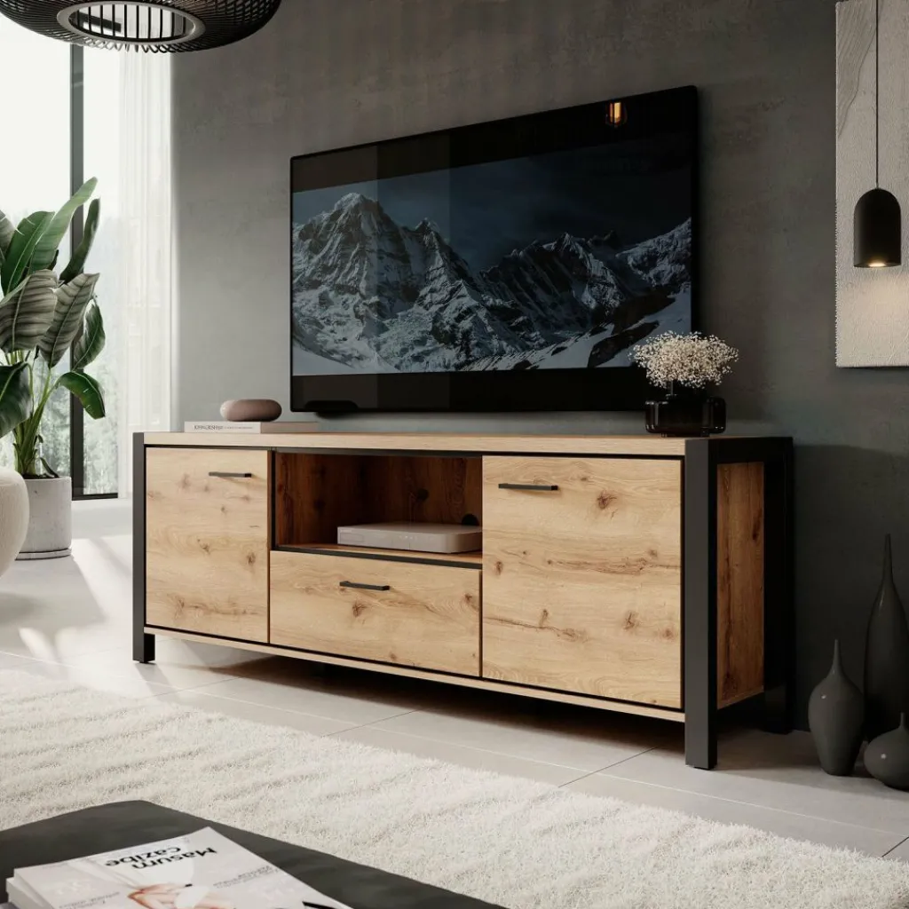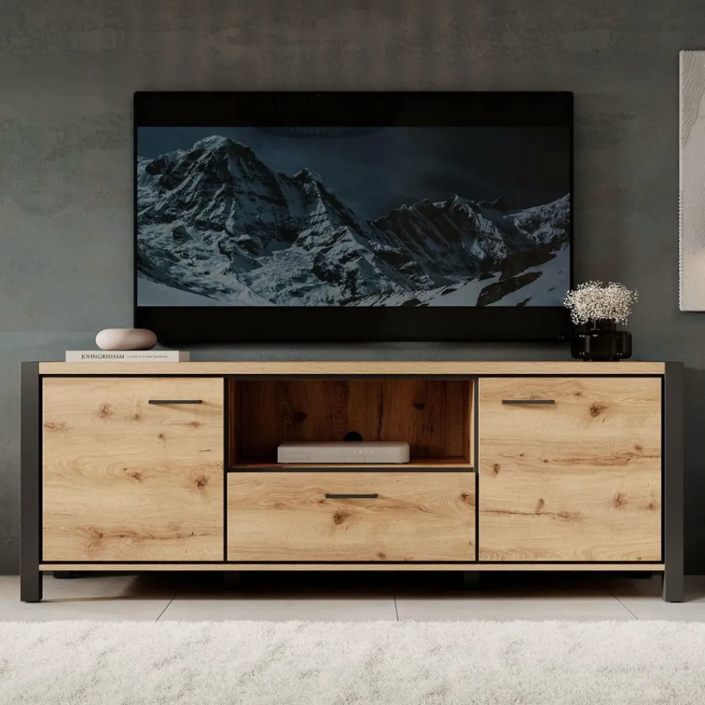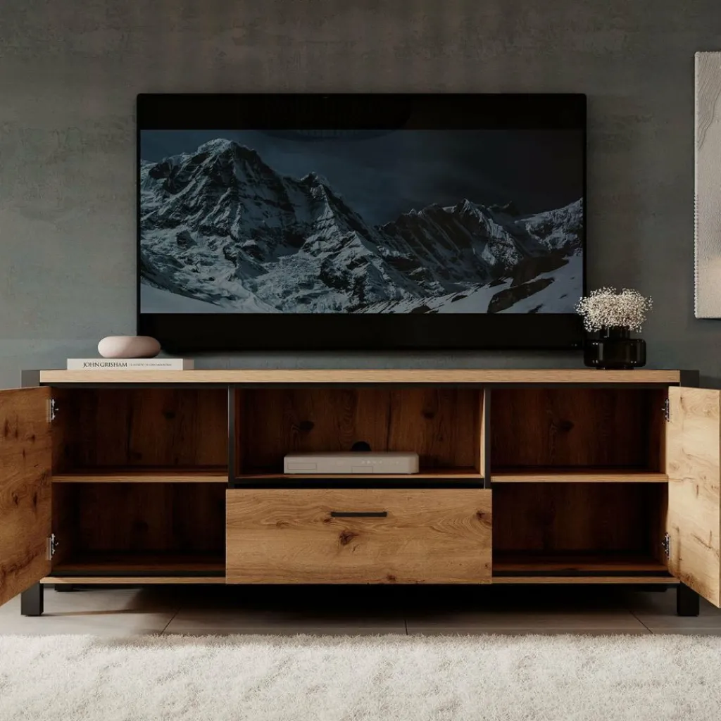 TV-Meubel Acapulco is een praktische kast met een industriële uitstraling. De Acapulco beschikt over twee klepdeuren met daarachter opbergvakken. In het midden zit een open opbergvak, handig voor apparatuur.