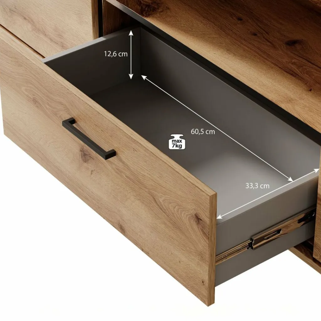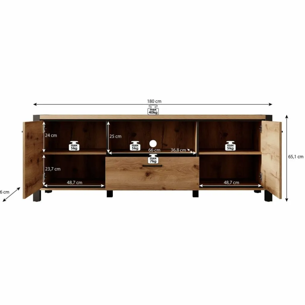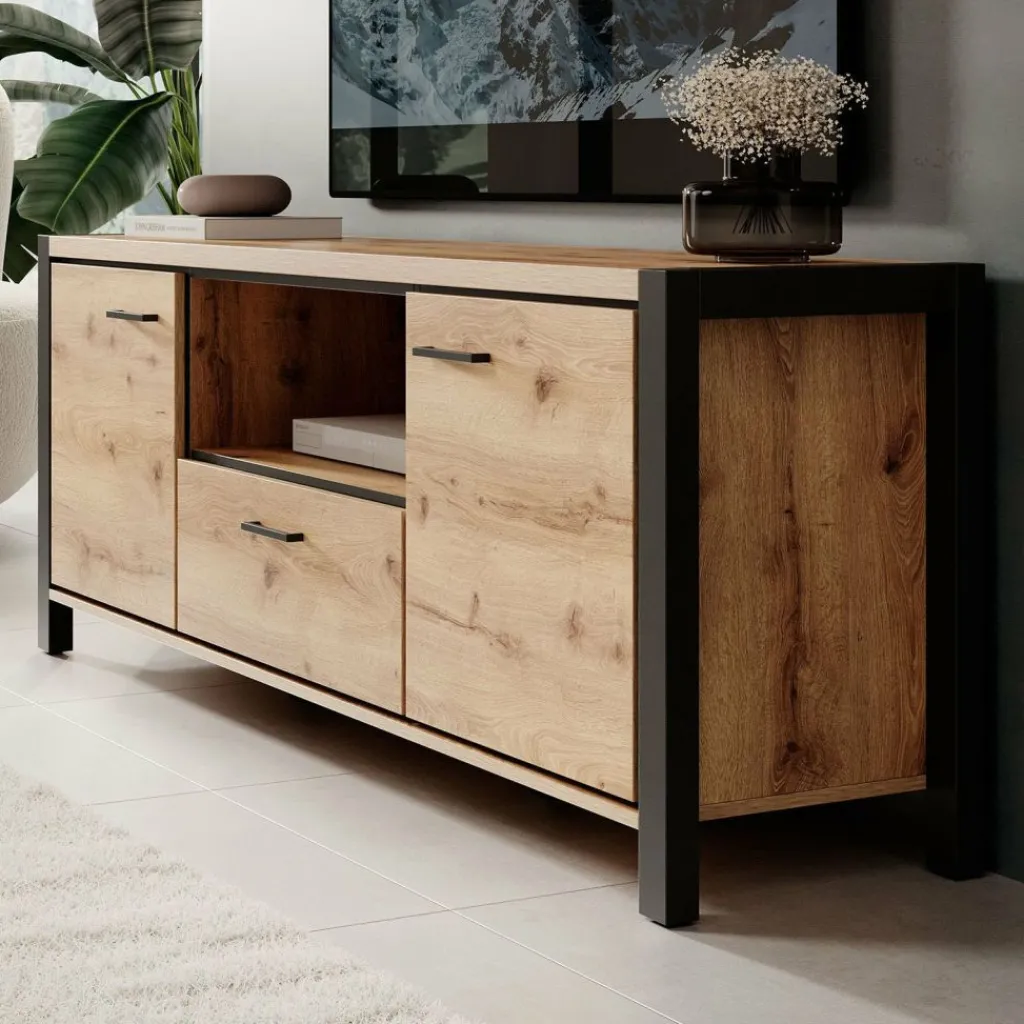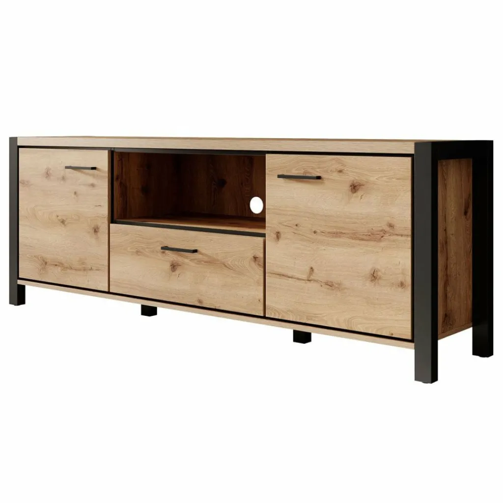 TV-Meubel Acapulco is een praktische kast met een industriële uitstraling. De Acapulco beschikt over twee klepdeuren met daarachter opbergvakken. In het midden zit een open opbergvak, handig voor apparatuur.
