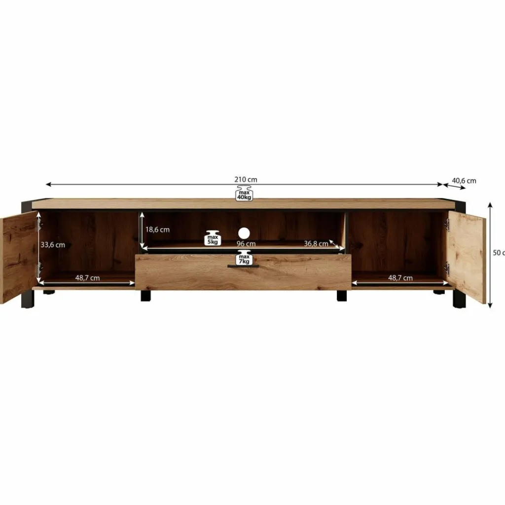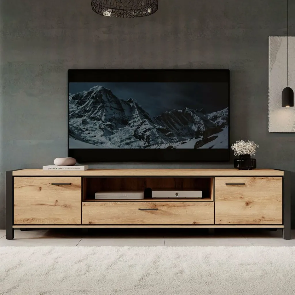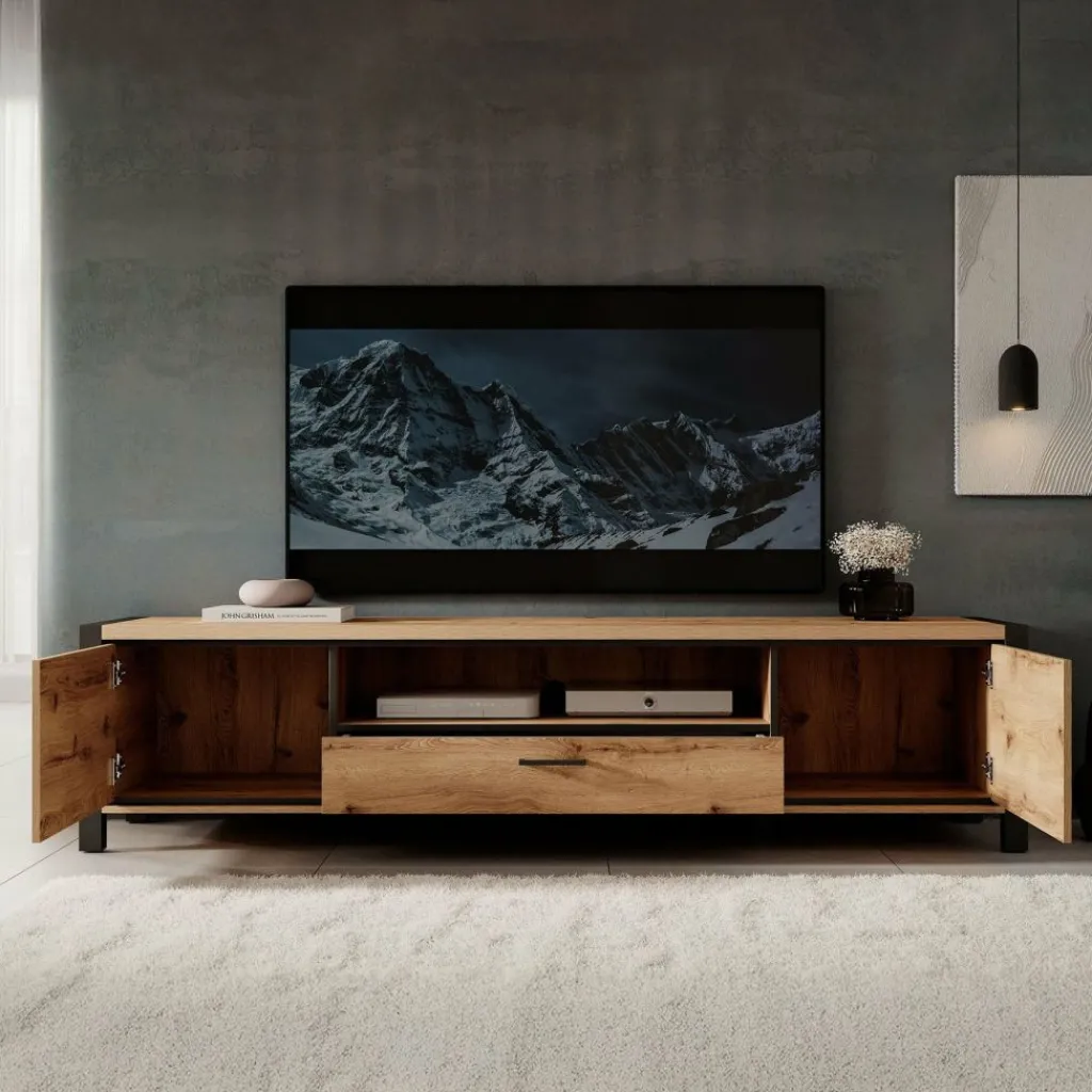 TV-Meubel Acapulco is een praktische kast met een industriële uitstraling. De Acapulco beschikt over twee klepdeuren met daarachter opbergvakken. In het midden zit een open opbergvak, handig voor apparatuur.