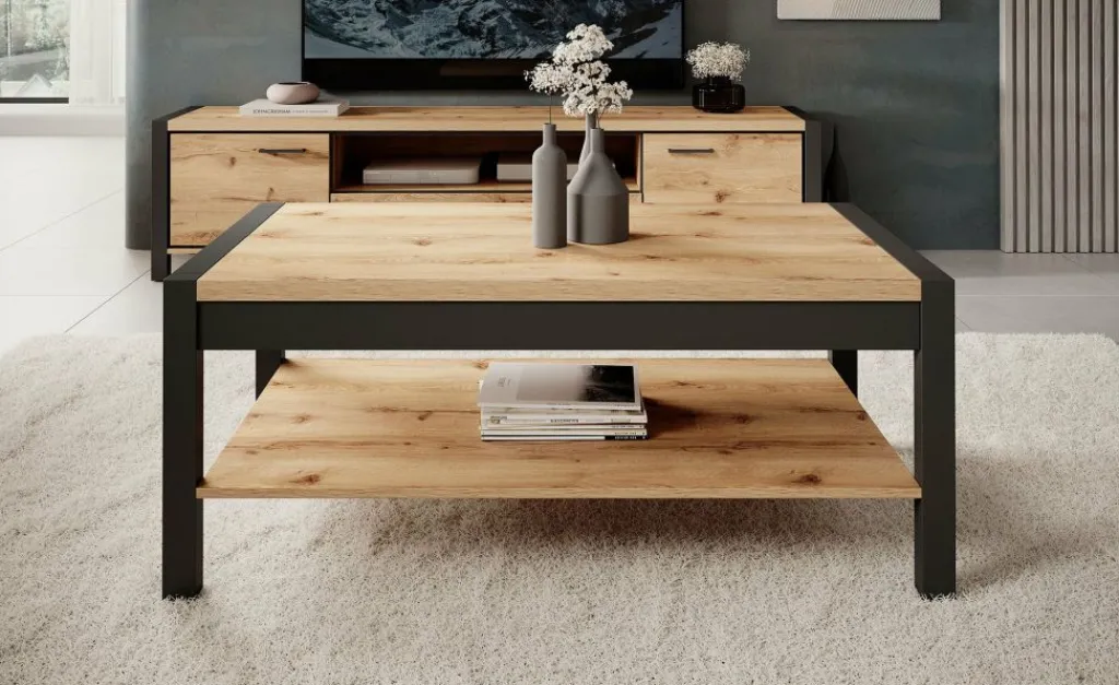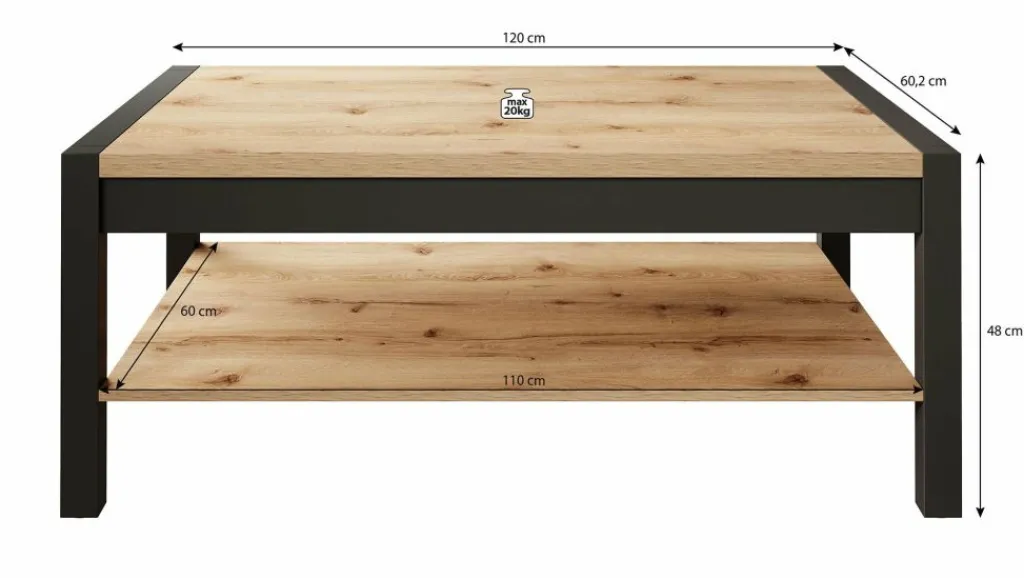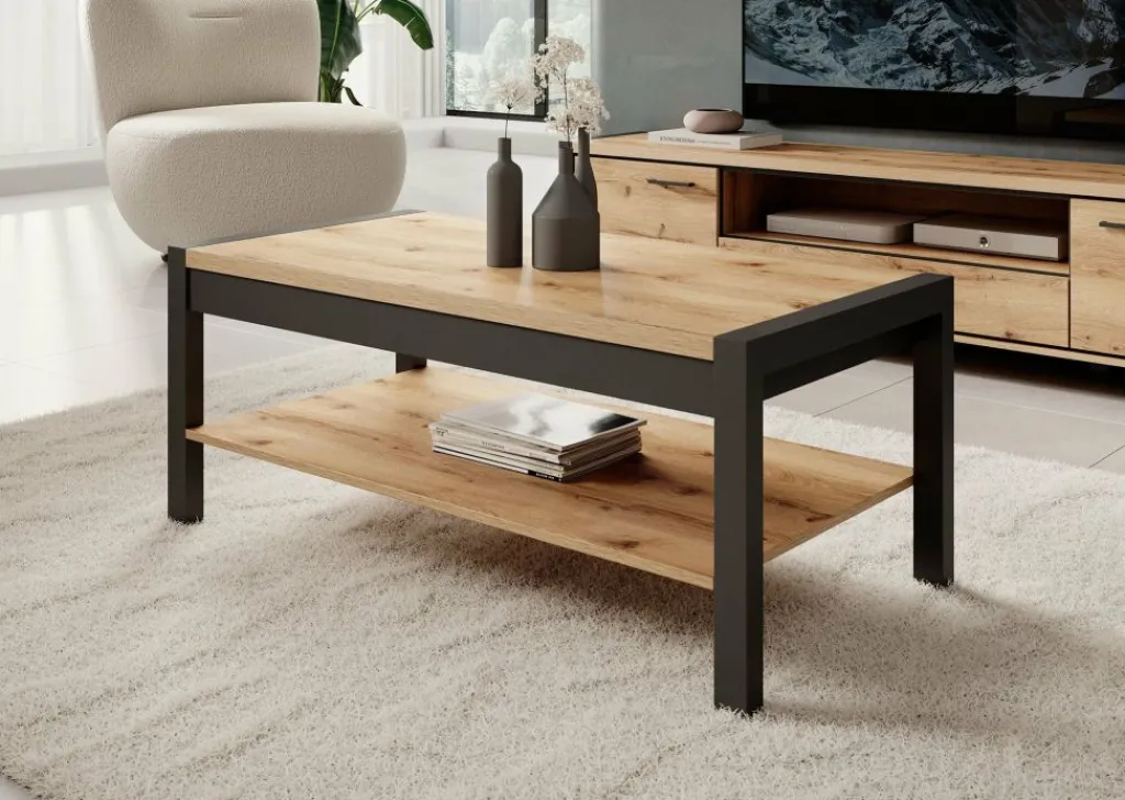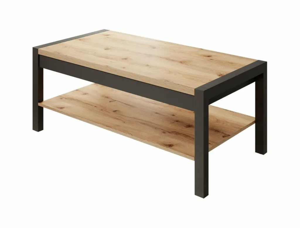 Salontafel Acapulco is een tafel gemaakt in een eiken kleur met zwarte poten. Het model heeft een extra plank onder het blad om spullen kwijt te kunnen.
