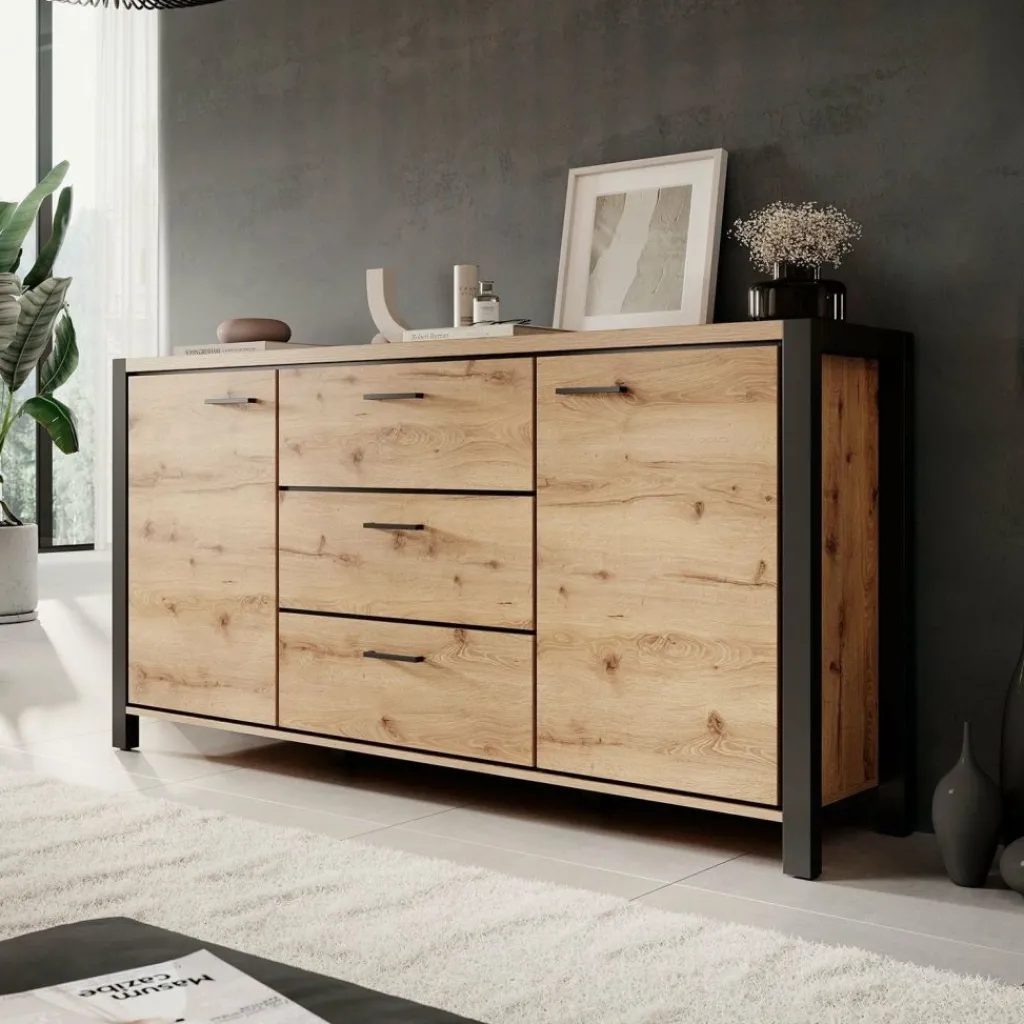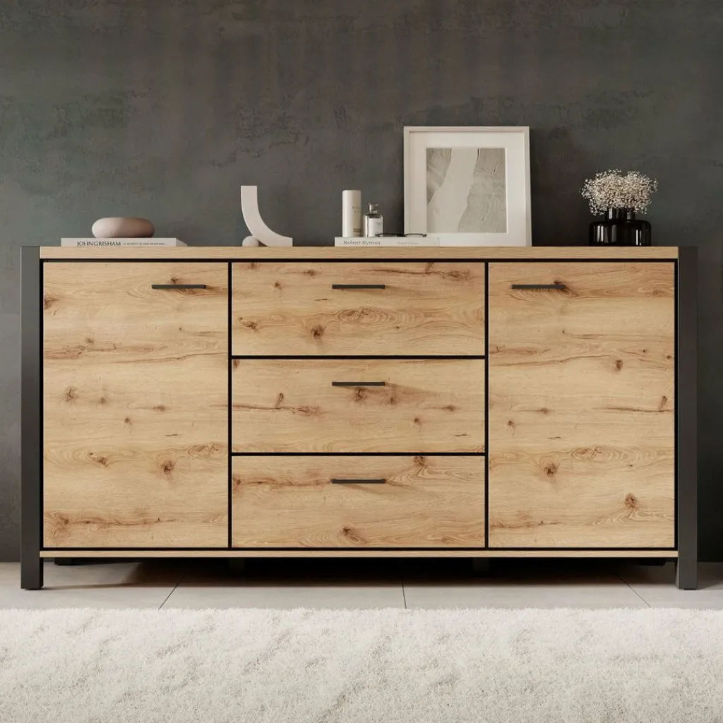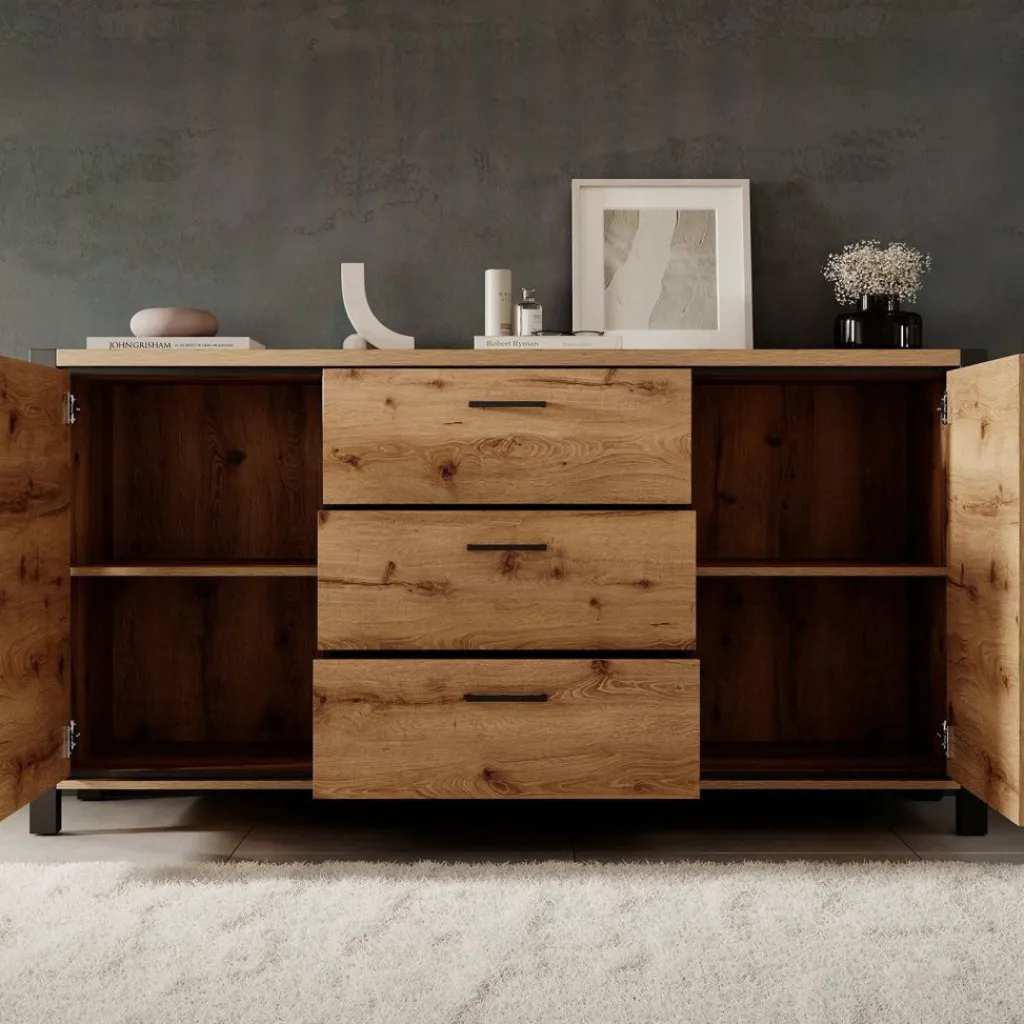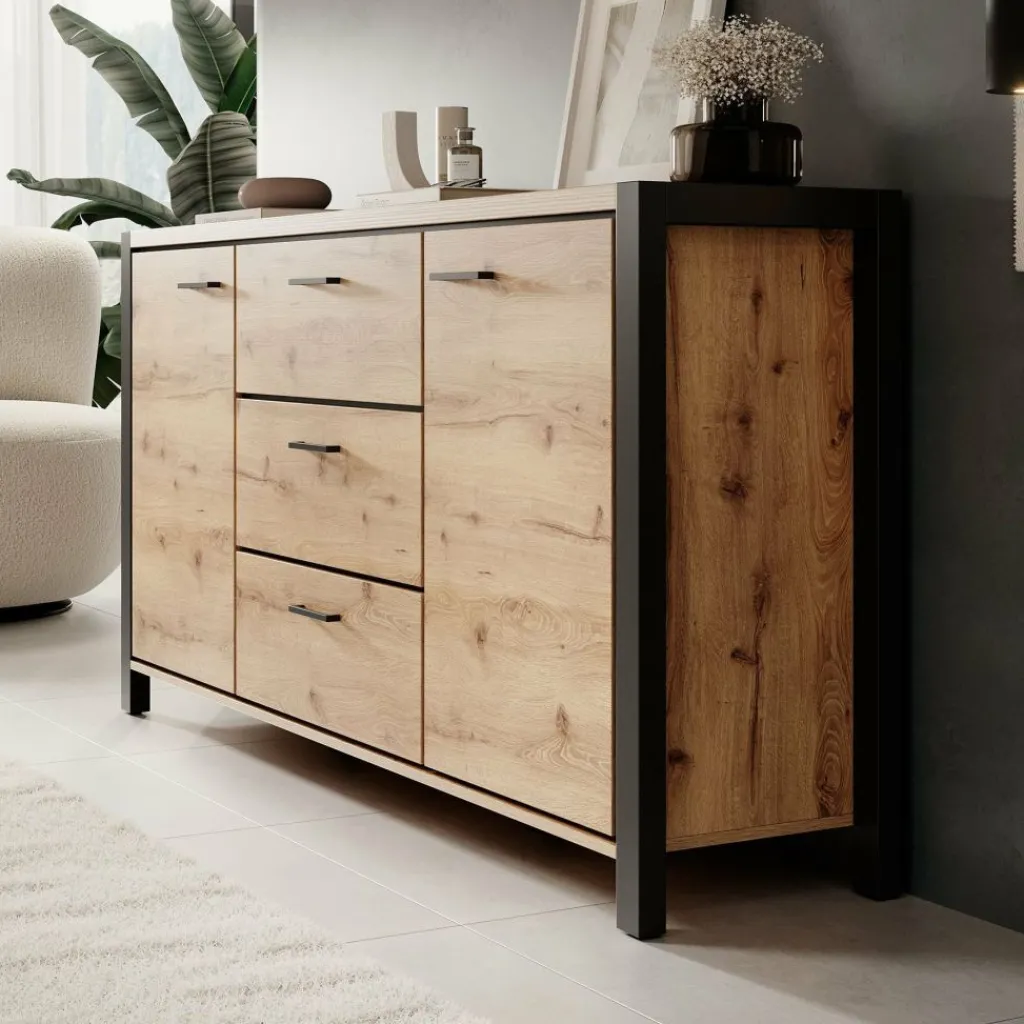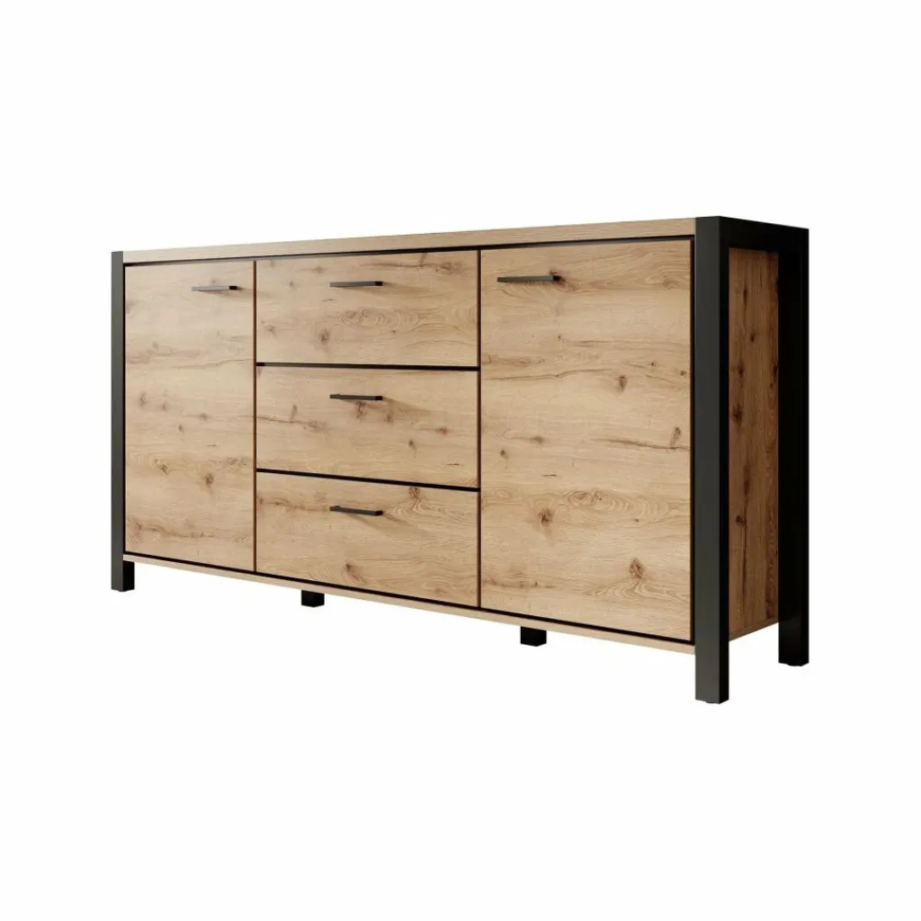 Dressoir Acapulco is een moderne opbergkast, uitgevoerd in een eiken kleur met zwart. De kast beschikt over twee openslaande deuren. In het midden bevinden zich 3 opberglades. De kast staat op zwarte pootjes.