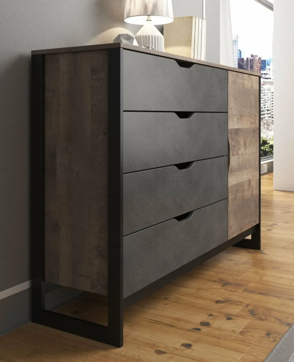 Commode Acasia is voorzien van een deur en vier lades, waarachter genoeg opbergruimte zit. De kast is afgewerkt in een eiken kleur met mat grijze lades.