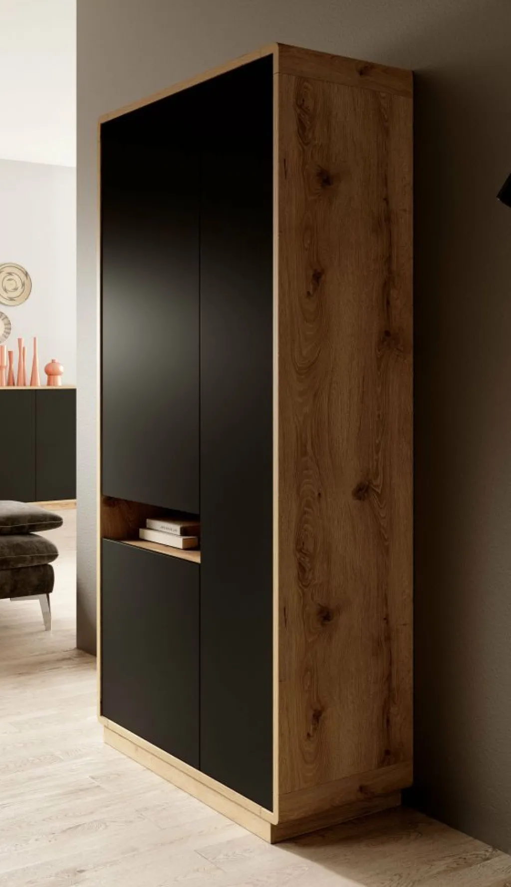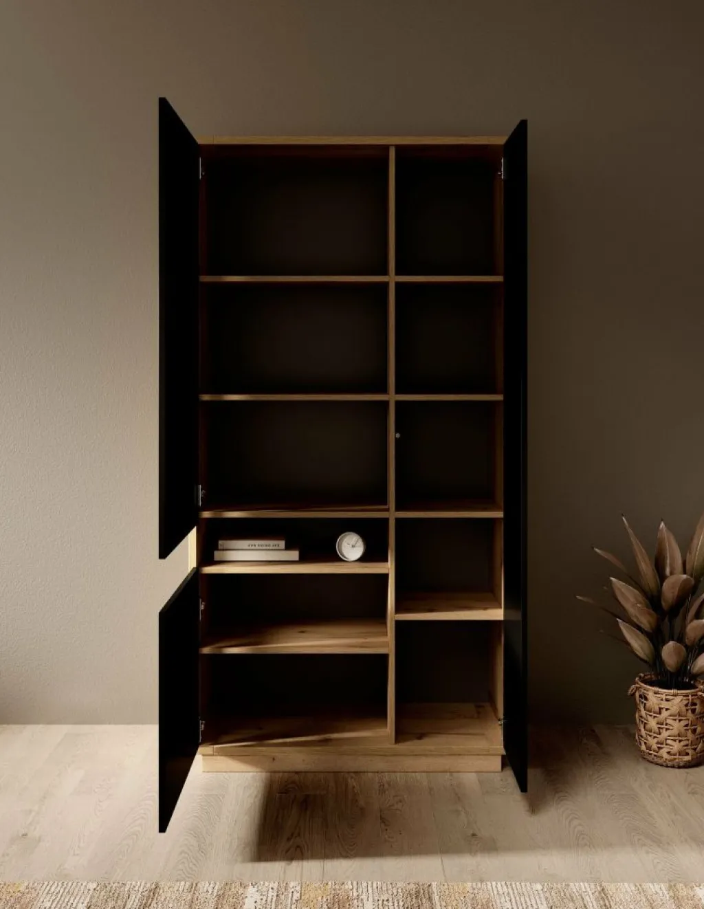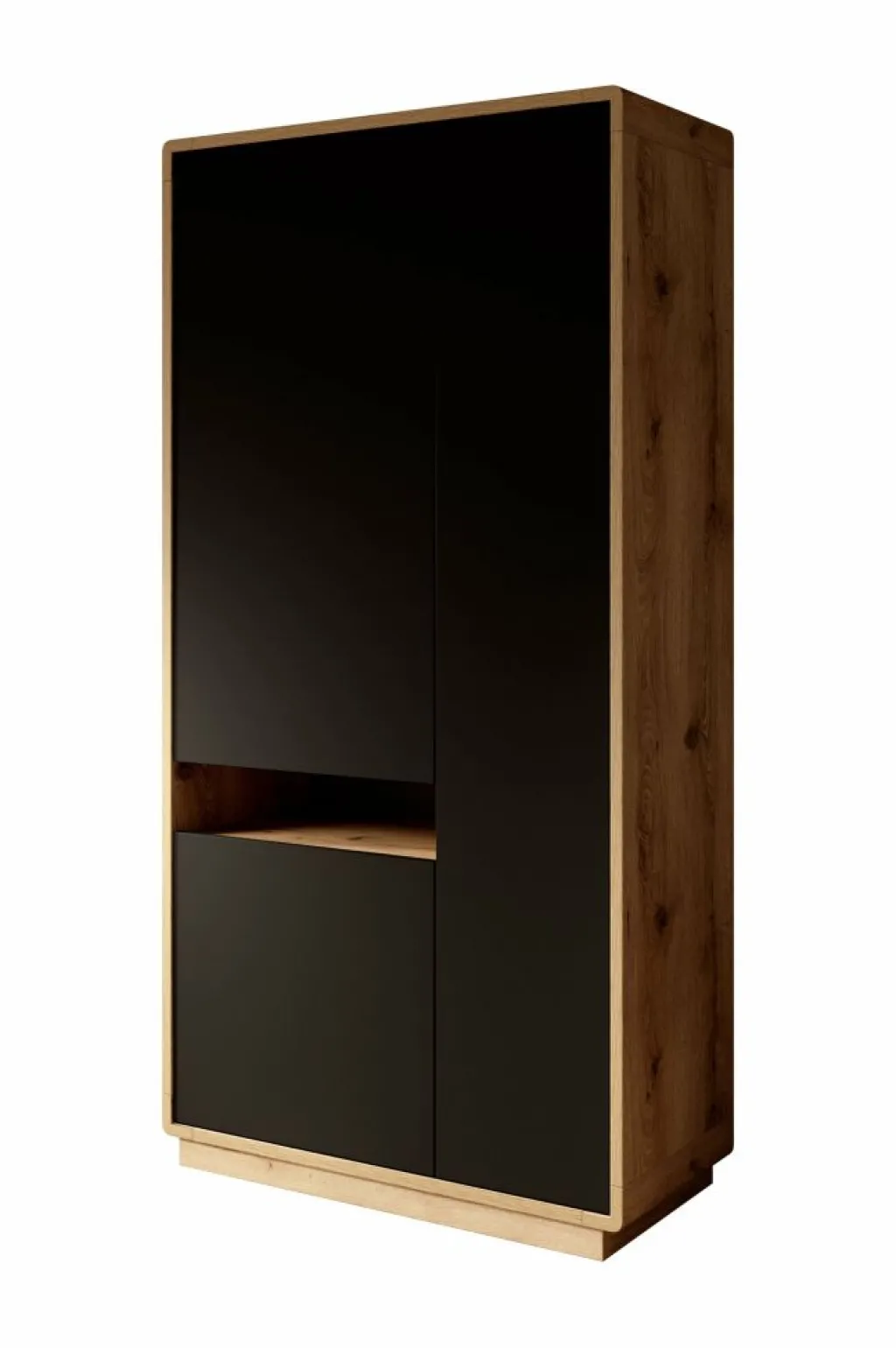 Vitrinekast Acuna is een praktisch vormgegeven kast, in industriële stijl. Het betreft een deels dichte opbergkast met drie deuren.