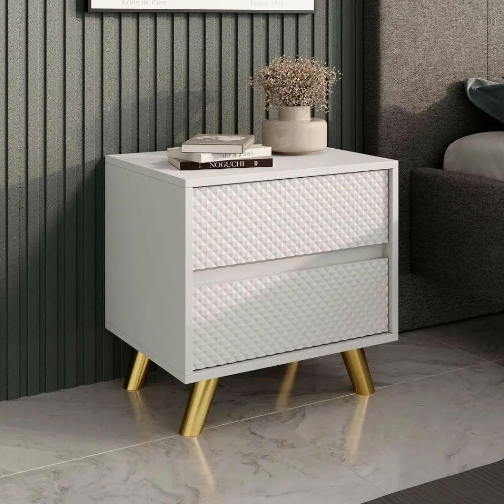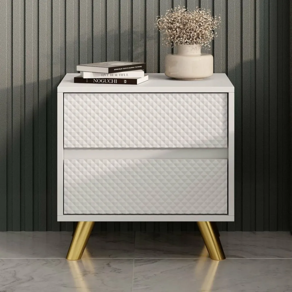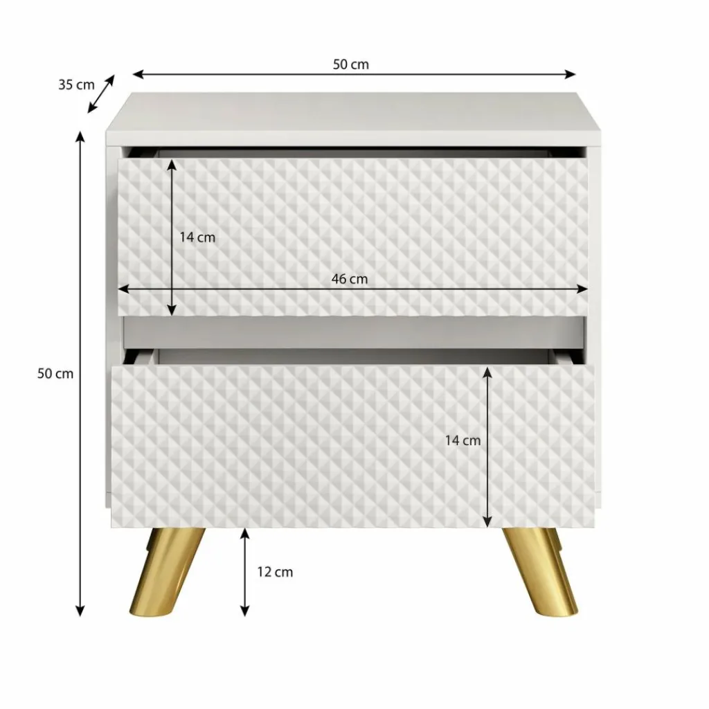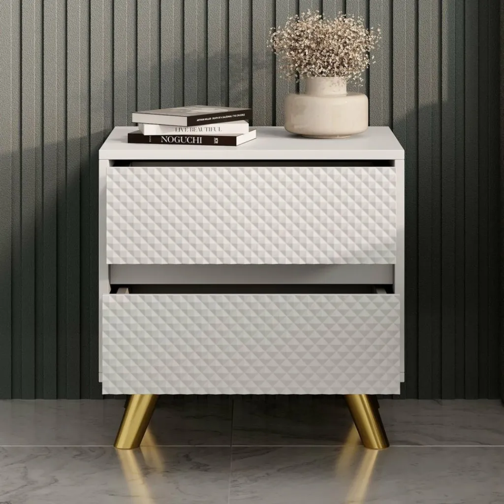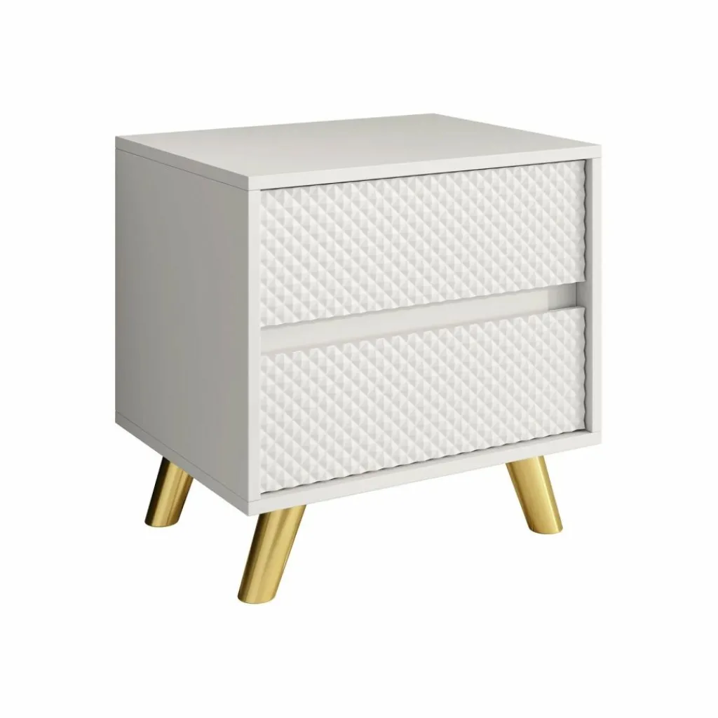 Het nachtkastje Adriano is een modern en stijlvol meubel dat perfect past naast ieder bed. Dankzij het strakke ontwerp, de greeploze lades en het opvallende diamantpatroon op de ladefronten krijgt je slaapkamer direct een luxe uitstraling.