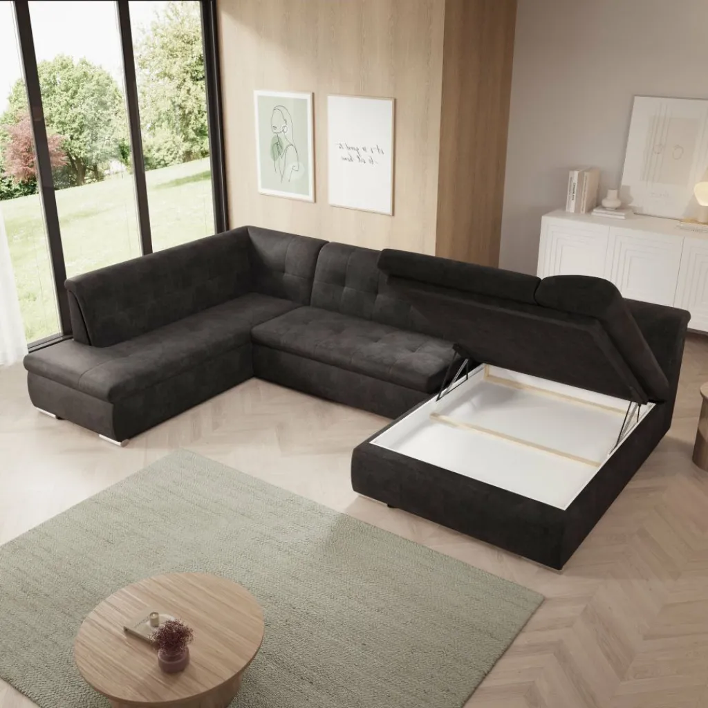 Hoekbank Alberta XL is een ruime en functionele U-vormige bank, ontworpen voor dagelijks comfort en praktisch gebruik. Dankzij de zachte ribstof en doordachte indeling past deze bank perfect in een modern interieur.