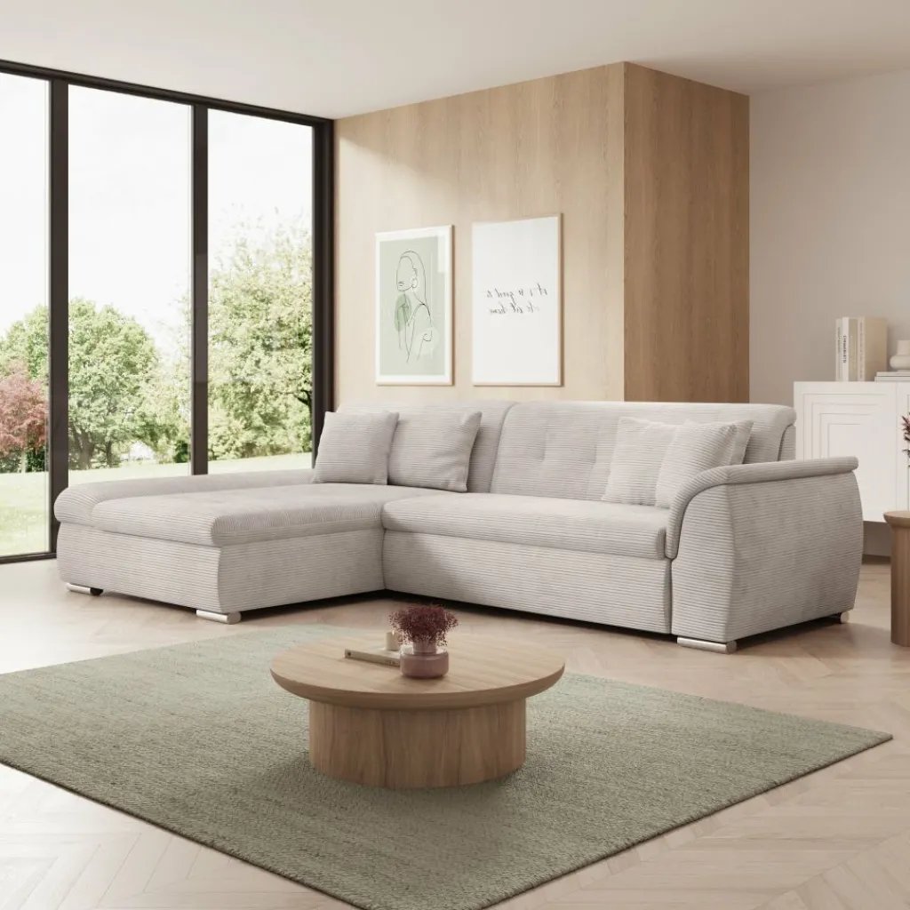 Hoekbank Alberta is een strakke bank in L-vorm, gemaakt van ribstof met een moderne uitstraling. Dit model is voorzien van een 2-zitter en een ruim loungegedeelte. Deze hoekbank beschikt over vaste zit- en rugkussens zonder ritsen. Ook de 4 sierkussens, zonder ritsen, worden gratis meegeleverd. De bank is bekleed met een zachte ribstof die aangenaam aanvoelt en zeer duurzaam is. Ten slotte staat de Alberta op kunststoffen pootjes.