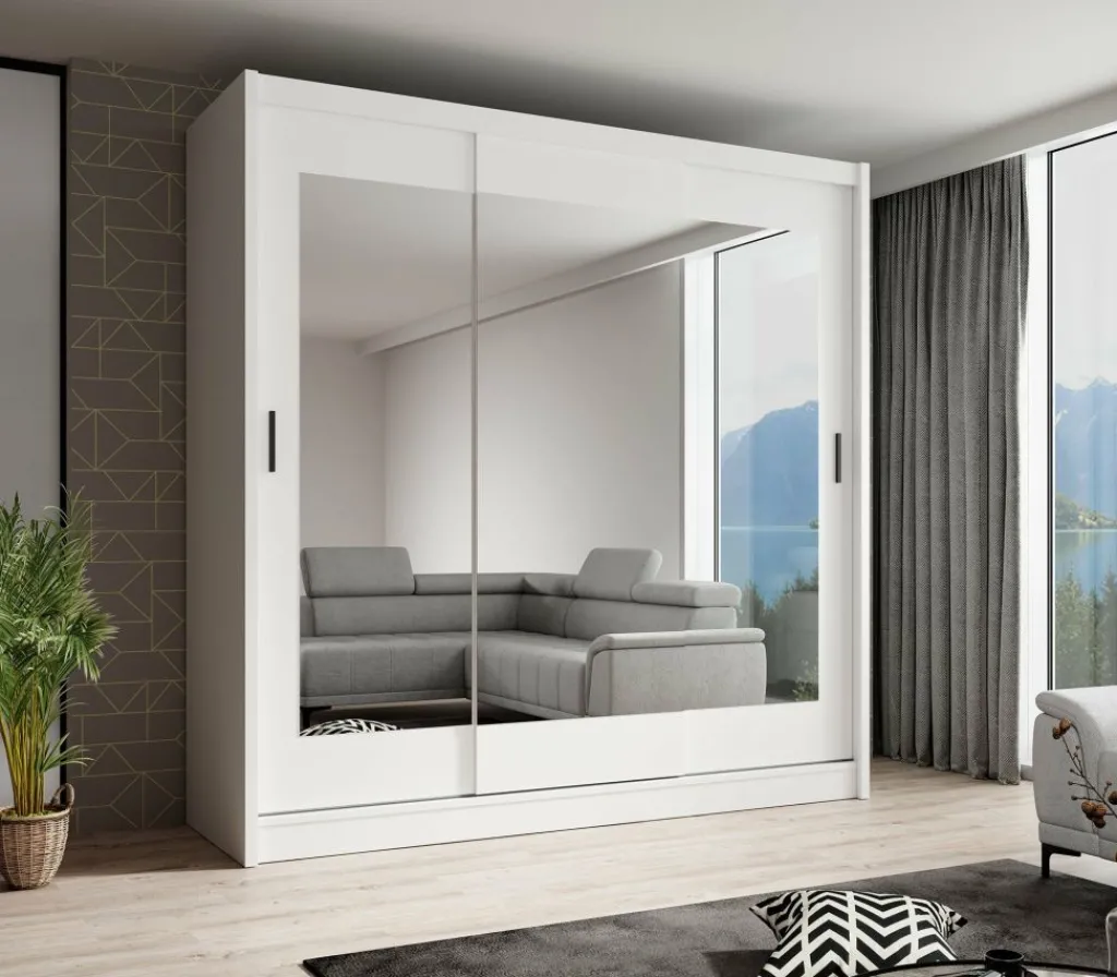 Garderobekast Alcamo 2 is een praktische kast uitgevoerd in mat witte kleur. De kledingkast beschikt over drie grote schuifdeuren waardoor ruimte wordt bespaard. Over de drie deuren lopen 3 spiegels in elkaar door. Het binnenwerk bestaat uit drie aparte delen. Aan de linkerzijde bevinden zich 4 legplanken. Rechts bevindt zich bovenin een groot open schap, met daaronder 2 delen met metalen stang om kleding aan op te hangen.