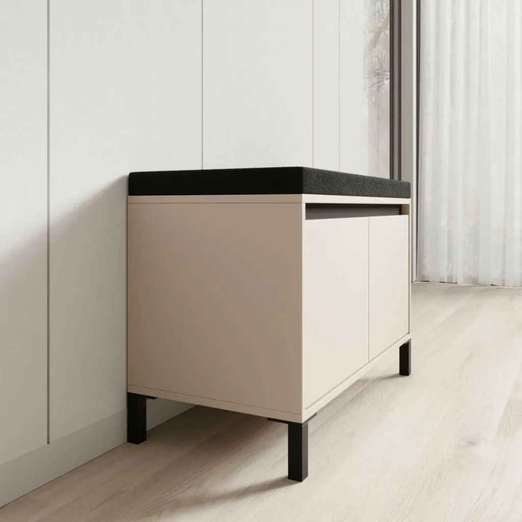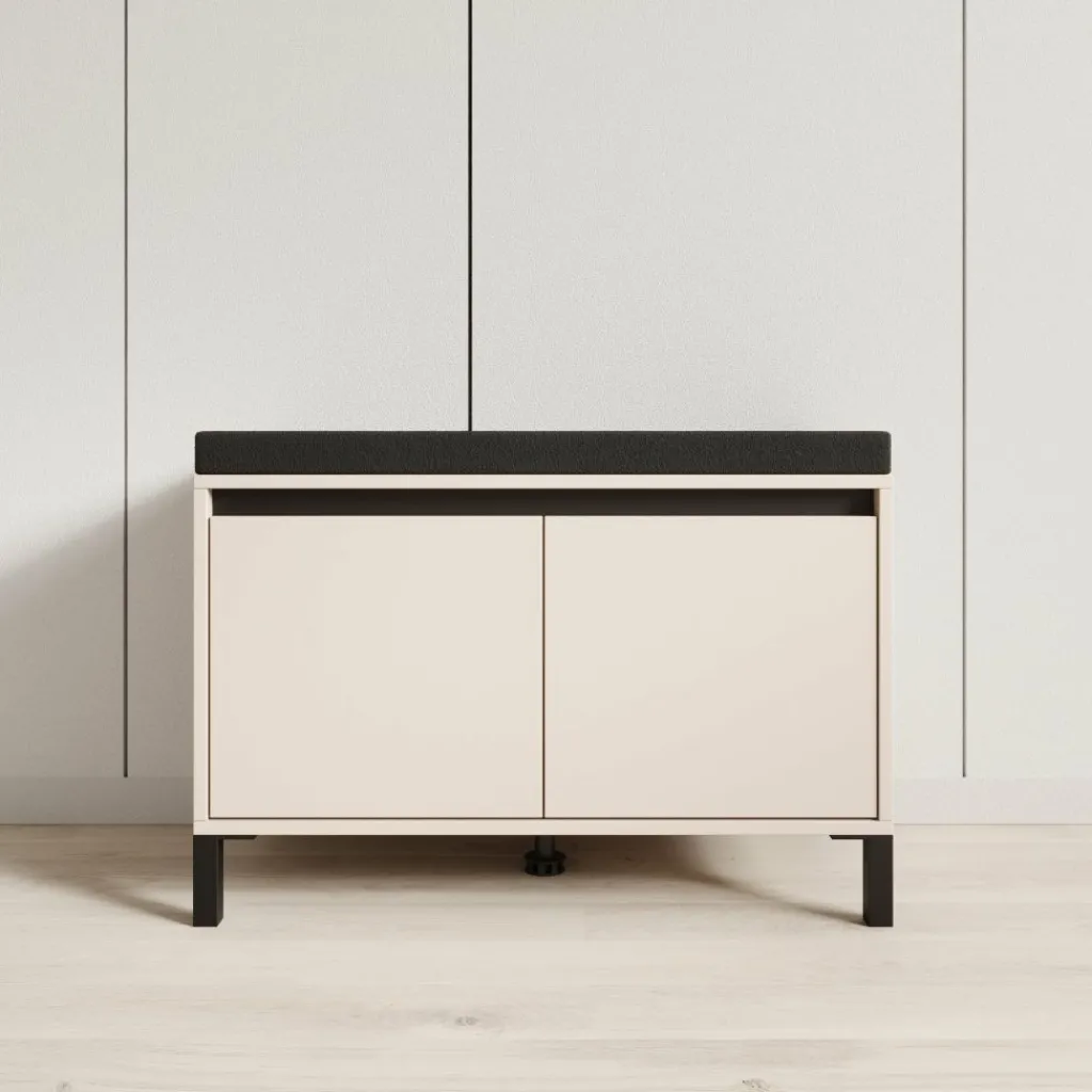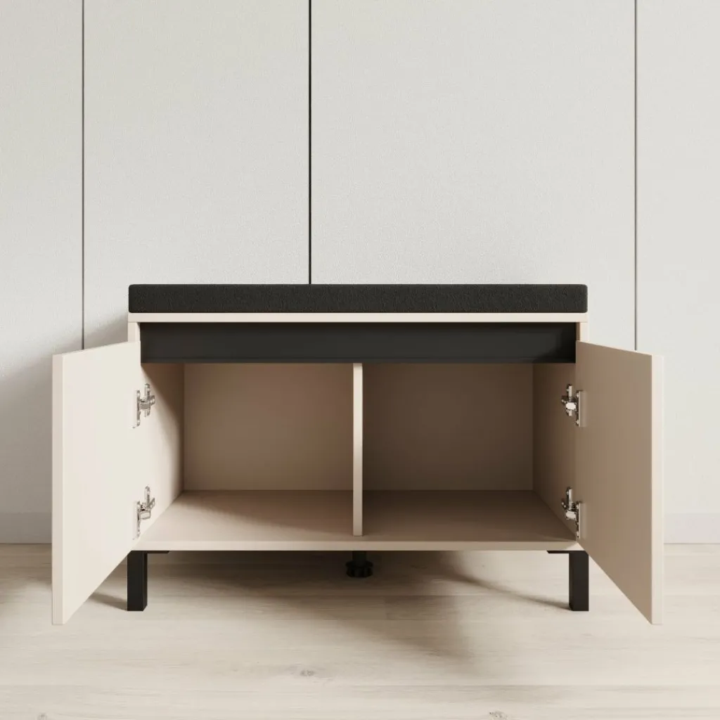 Achter de twee greeploze deuren bevinden zich twee afzonderlijke opbergvakken waarin schoenen overzichtelijk kunnen worden opgeborgen. De kast staat op zwarte poten, waardoor de vloer zichtbaar blijft en schoonmaken eenvoudig is. De constructie is stabiel en bedoeld voor dagelijks gebruik.