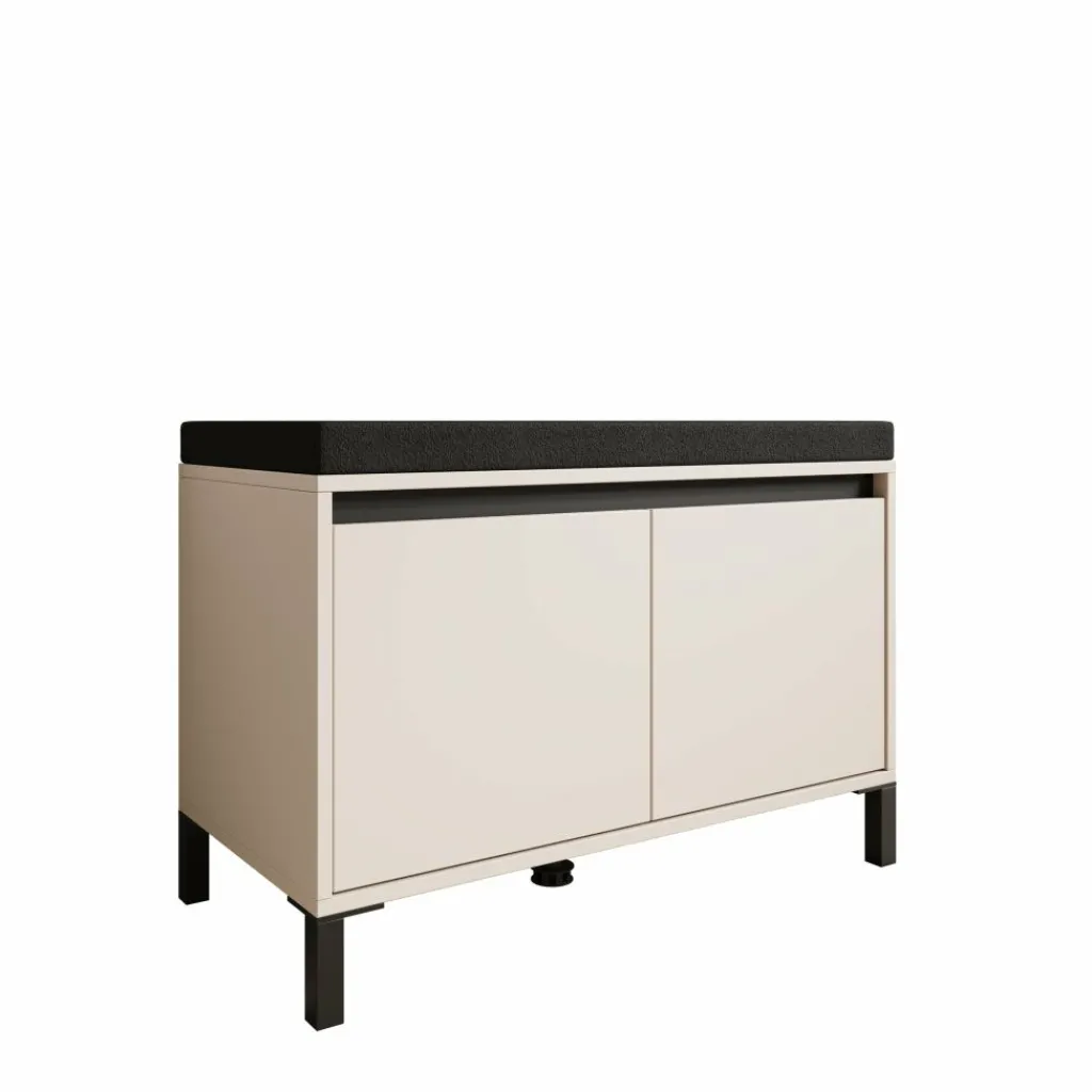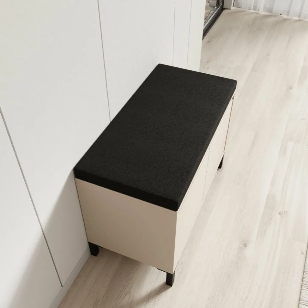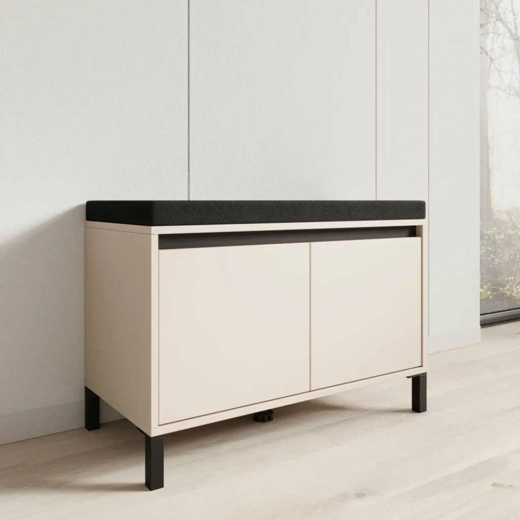 Achter de twee greeploze deuren bevinden zich twee afzonderlijke opbergvakken waarin schoenen overzichtelijk kunnen worden opgeborgen. De kast staat op zwarte poten, waardoor de vloer zichtbaar blijft en schoonmaken eenvoudig is. De constructie is stabiel en bedoeld voor dagelijks gebruik.