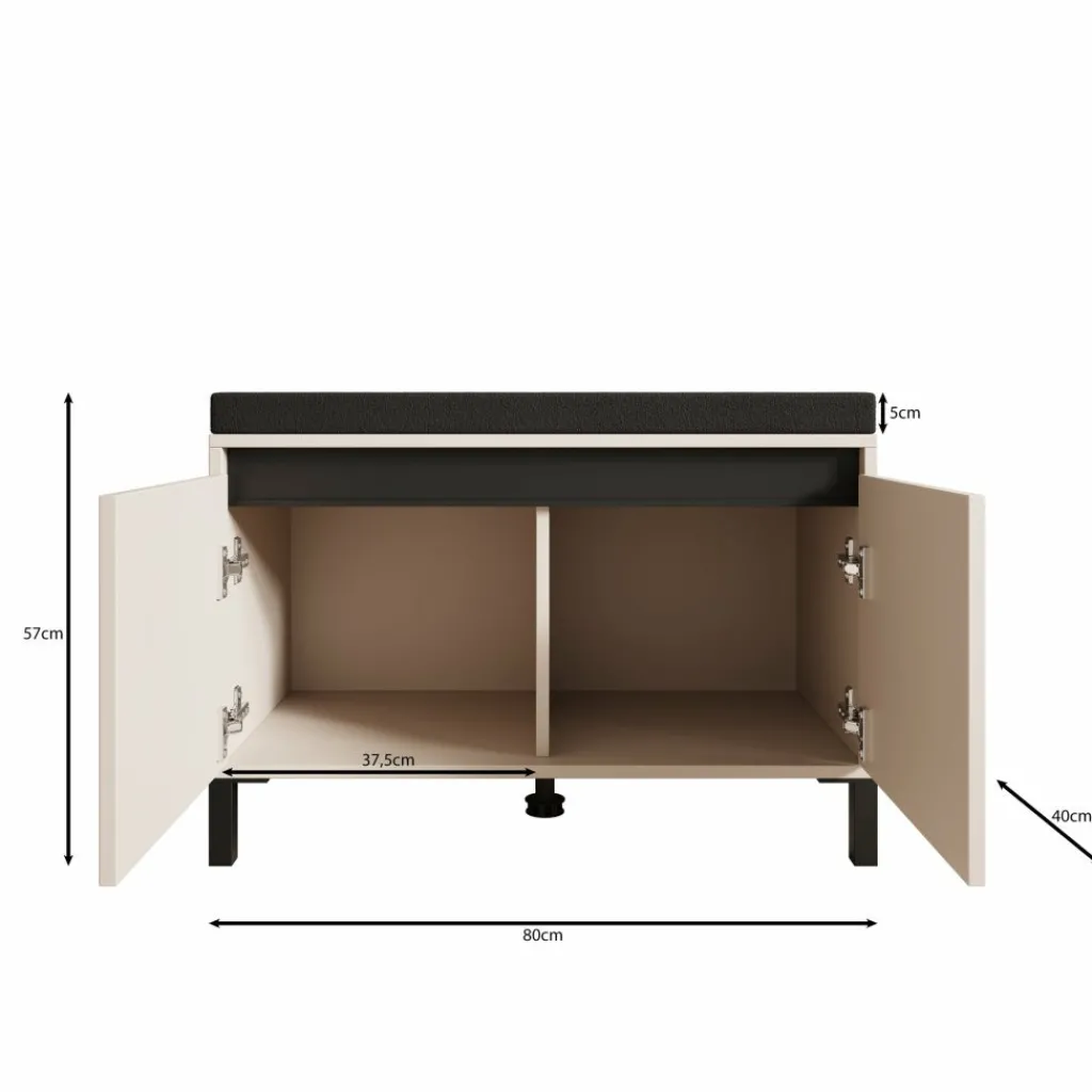 Schoenenkast Alessa is een compacte opbergoplossing voor de hal, slaapkamer of bijkeuken. Met een breedte van 80 cm en een hoogte van 57 cm is dit model geschikt voor plaatsing onder een kapstok of tegen een lage wand. De beige afwerking geeft het meubel een rustige, neutrale uitstraling en laat zich eenvoudig combineren met verschillende interieurstijlen.