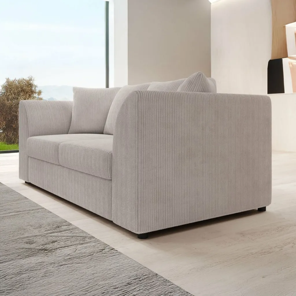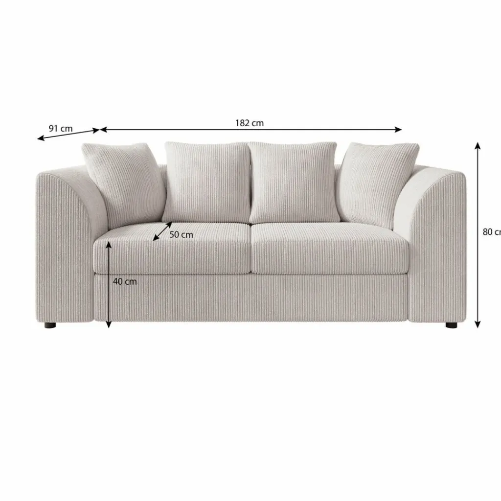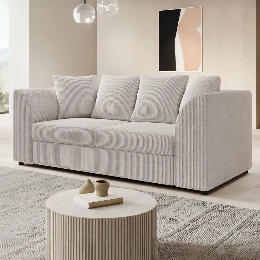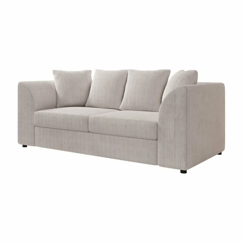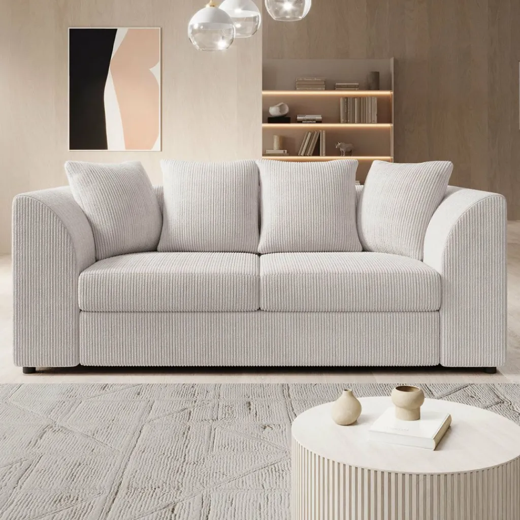 De Alfort 3-zitsbank in zachte beige ribstof is de perfecte combinatie van comfort en compactheid. Met zijn afgeronde armleuningen en royale kussens brengt deze bank een warm en uitnodigend gevoel in elk interieur.