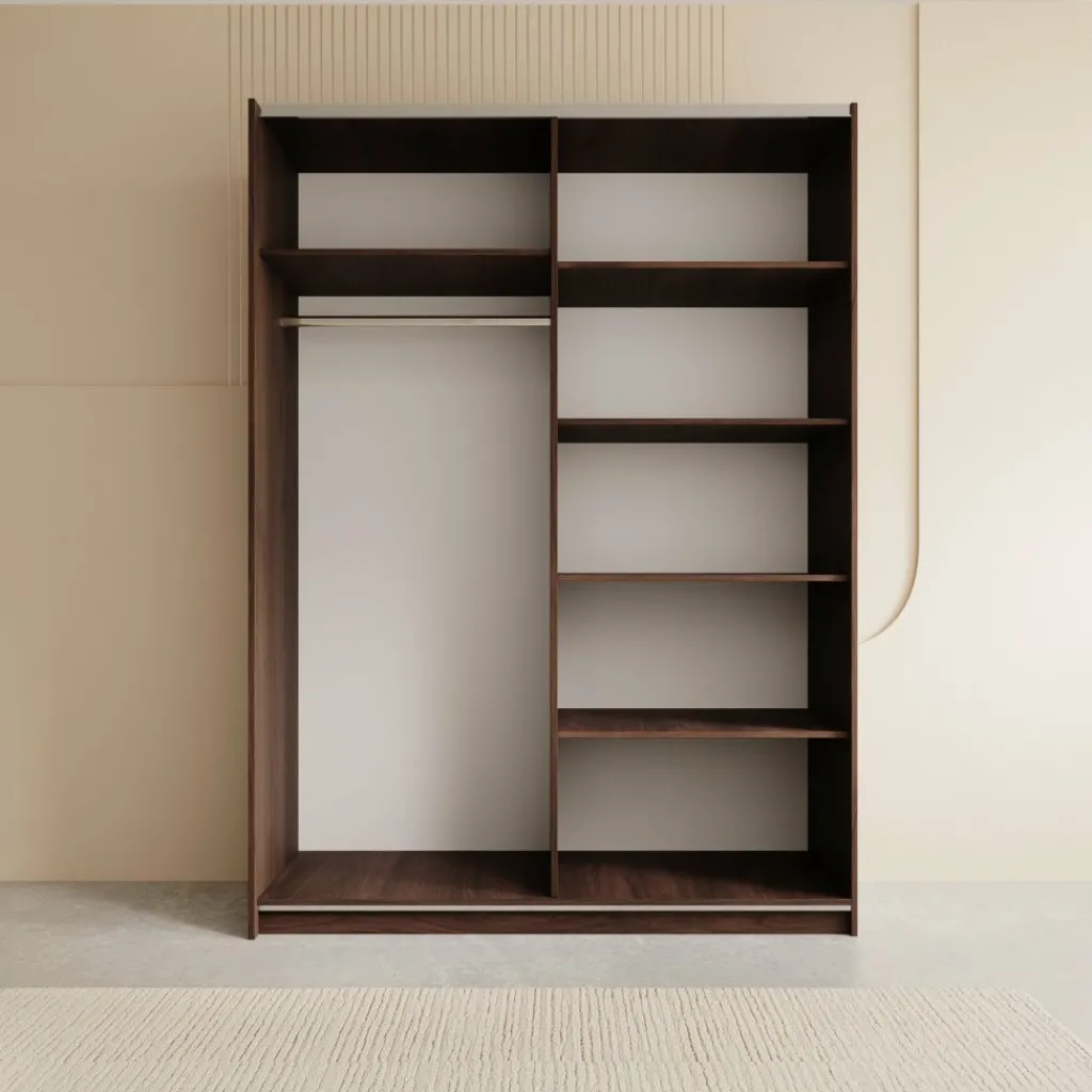 Achter de schuifdeuren is de kast verdeeld in twee compartimenten. Het linkergedeelte beschikt over een hangroede met daarboven een legplank, geschikt voor het ophangen van jassen, jurken en overhemden. Het rechtergedeelte is ingericht met meerdere vaste legplanken voor opgevouwen kleding, beddengoed of opbergdozen. Deze indeling zorgt voor een duidelijke scheiding tussen hang- en leggedeelte.