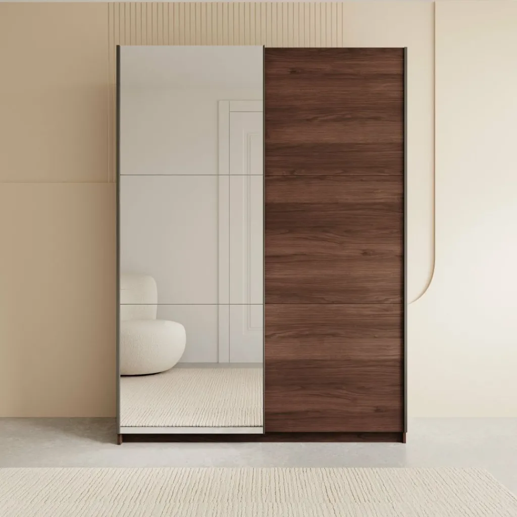 De schuifdeuren zijn voorzien van lange, verticale handgrepen die iets uitsteken en zorgen voor een goede grip bij het openen en sluiten van de kast. De combinatie van het donkere eikenpatroon en de spiegel geeft de kast een duidelijke en functionele uitstraling. De lage plint zorgt voor een stabiele plaatsing en maakt het mogelijk de kast strak tegen een wand te zetten.