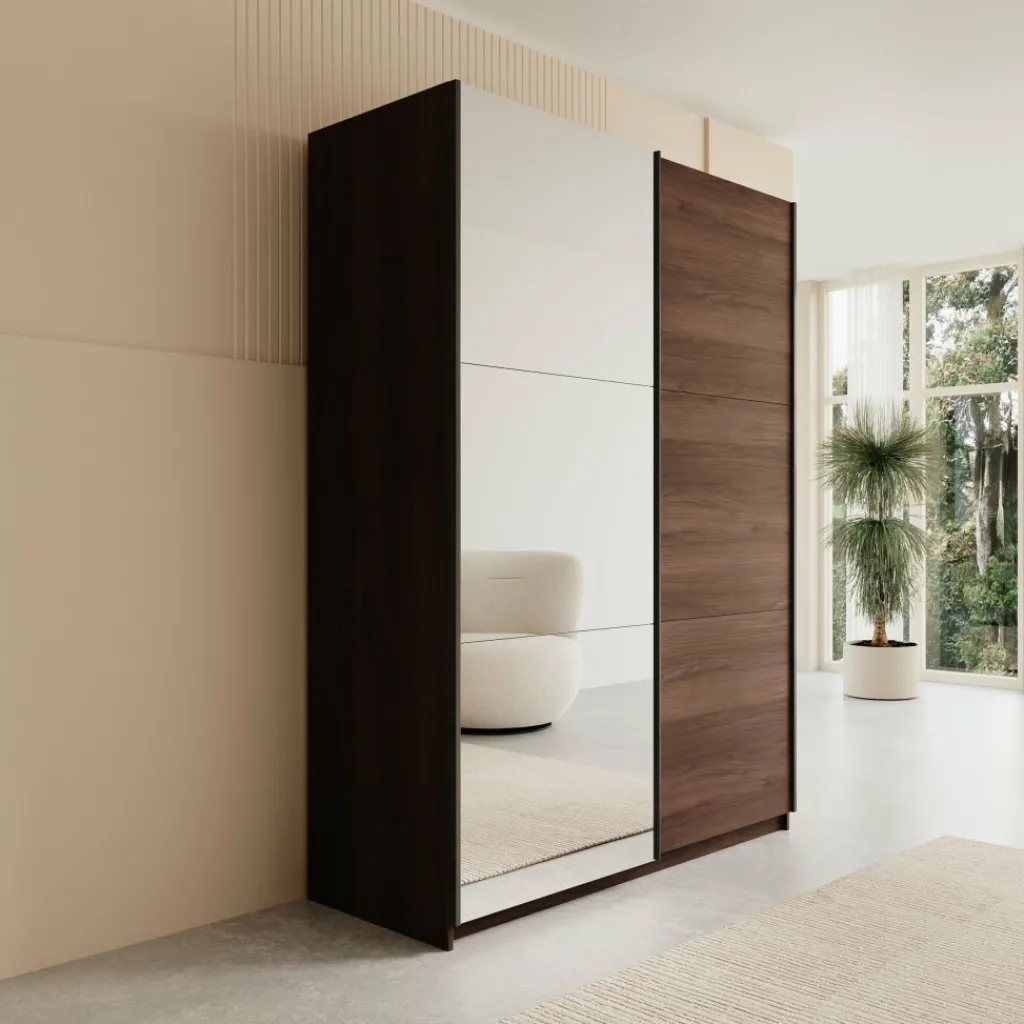 Andros kledingkast is een staande kast met twee schuifdeuren, uitgevoerd in een donker eiken afwerking. Eén van de schuifdeuren is voorzien van een spiegel over de volledige hoogte. Met een afmeting van 150x62x207 cm biedt deze kast een praktische indeling voor het opbergen van kleding en accessoires, terwijl de schuifdeuren weinig ruimte innemen bij het openen.