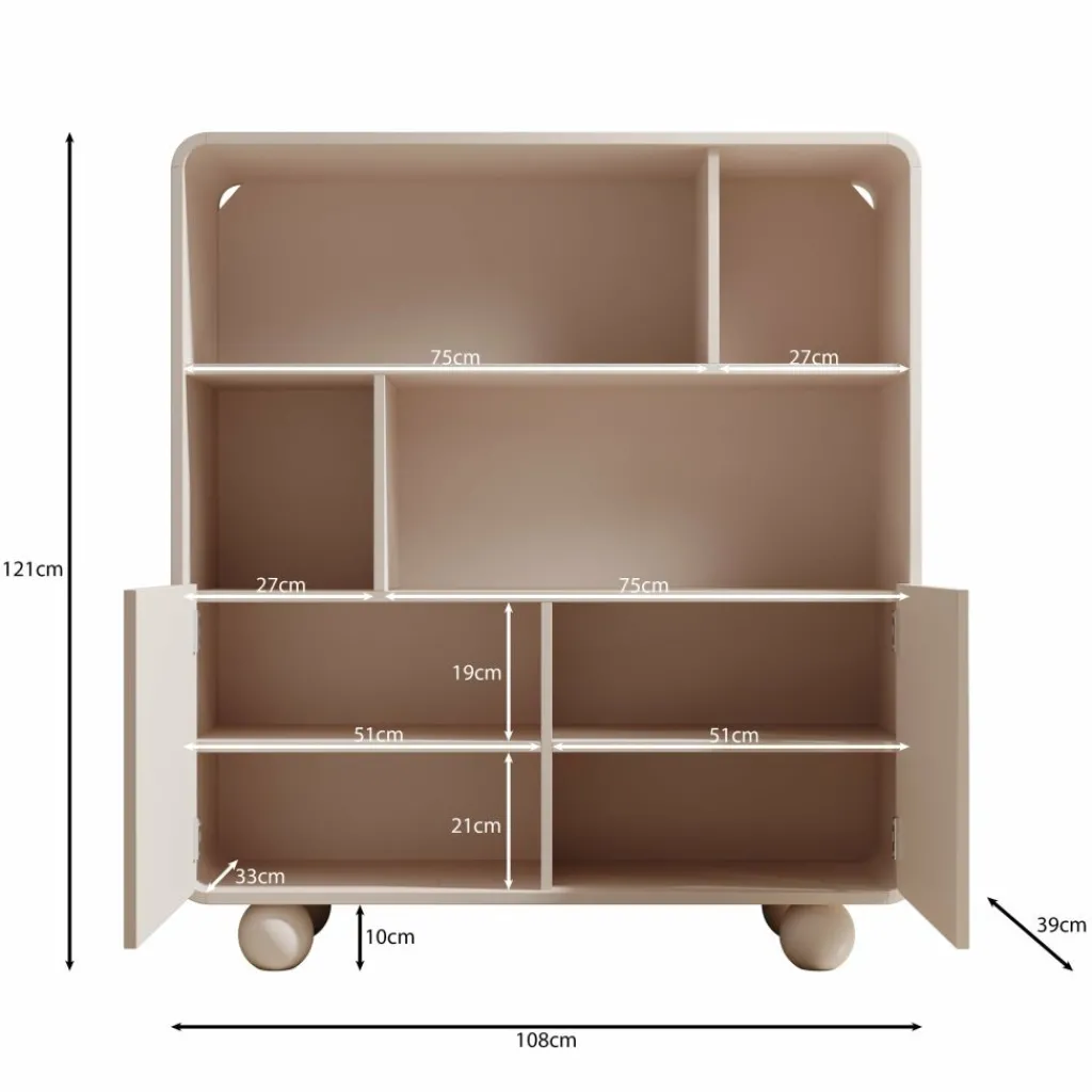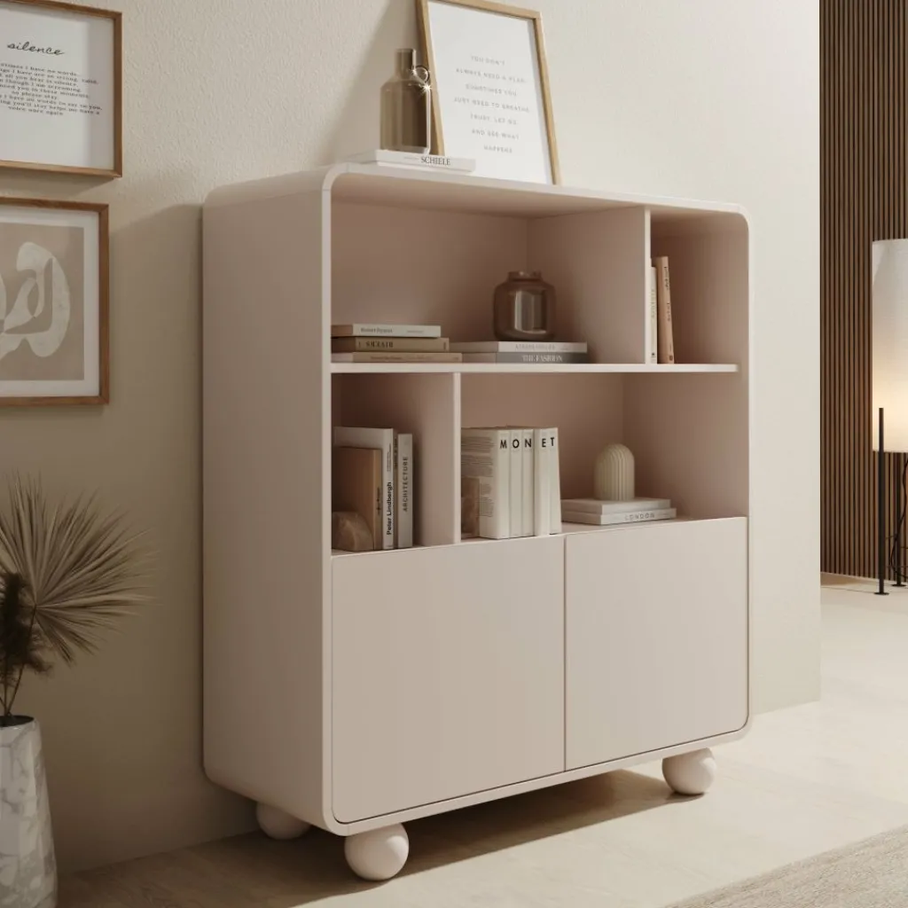 De Anobo boekenkast combineert speelse vormen met praktisch gebruik. Het ontwerp heeft afgeronde hoeken en staat op opvallende bolvormige pootjes. De open vakken zijn ideaal voor boeken of decoratie, terwijl de twee deuren extra opbergruimte bieden.