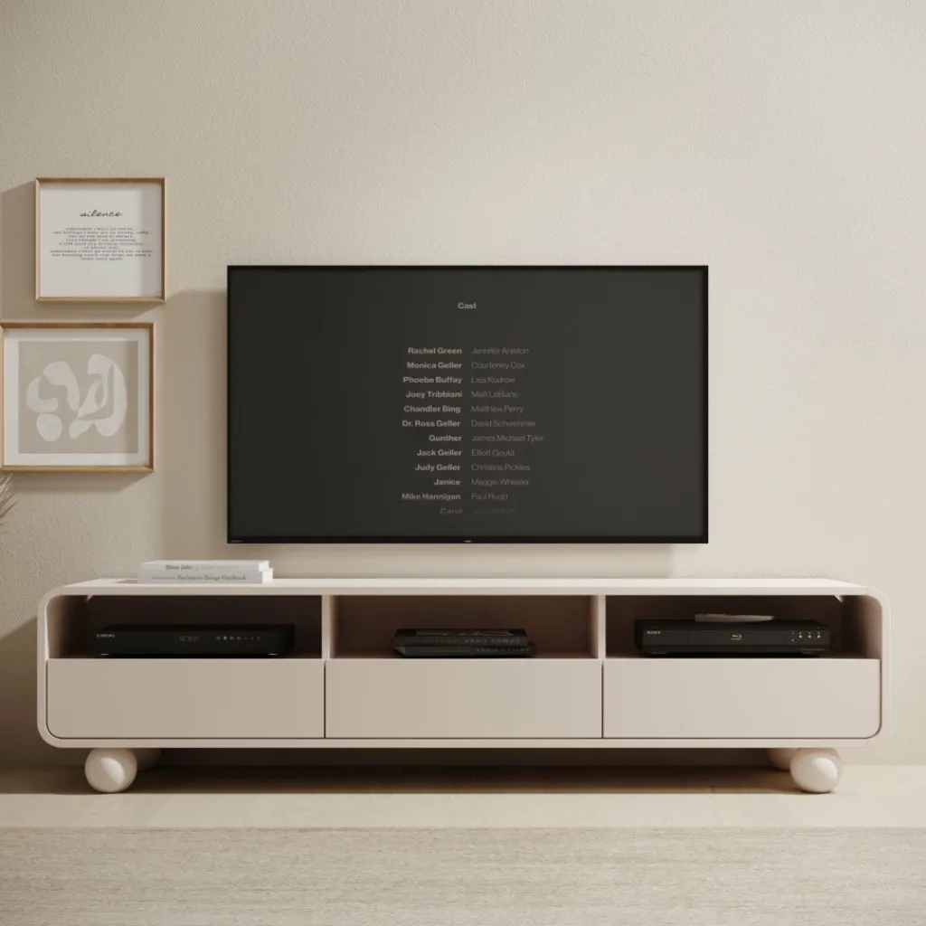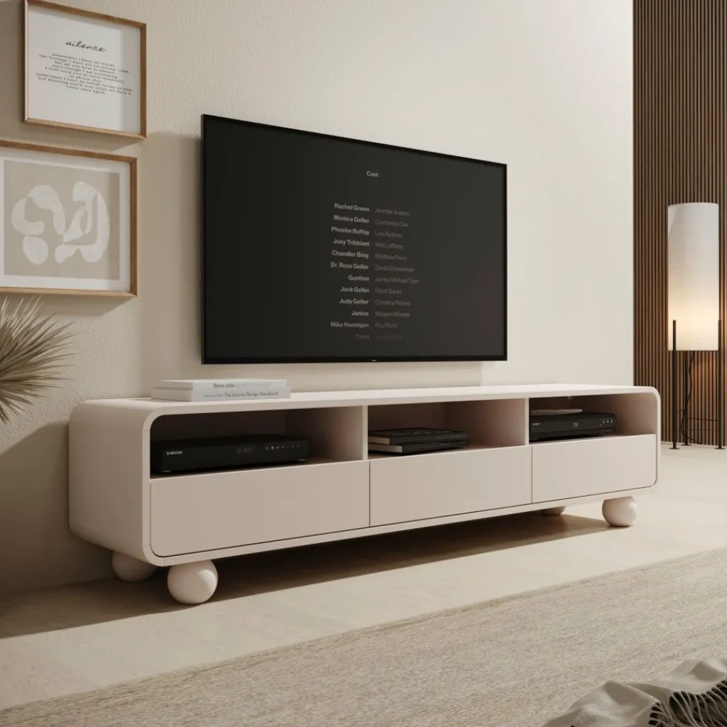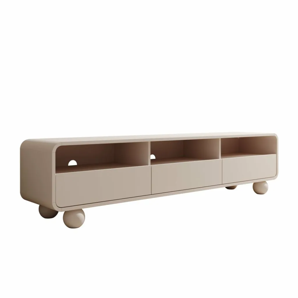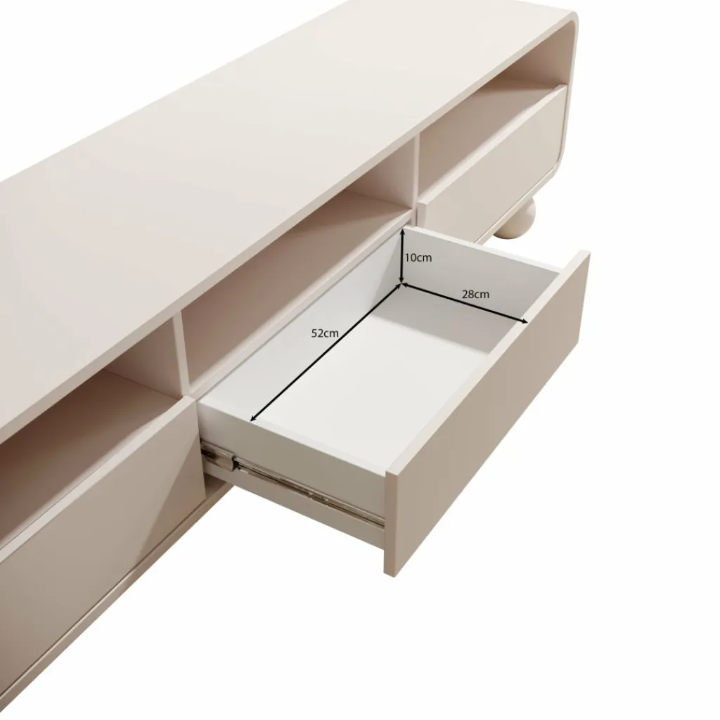 Het Anobo tv-meubel van 180 cm combineert moderne elegantie met een speels karakter. De afgeronde hoeken en bolvormige poten geven het meubel een unieke uitstraling, terwijl de beige kleur zorgt voor een rustige en stijlvolle basis in je interieur.