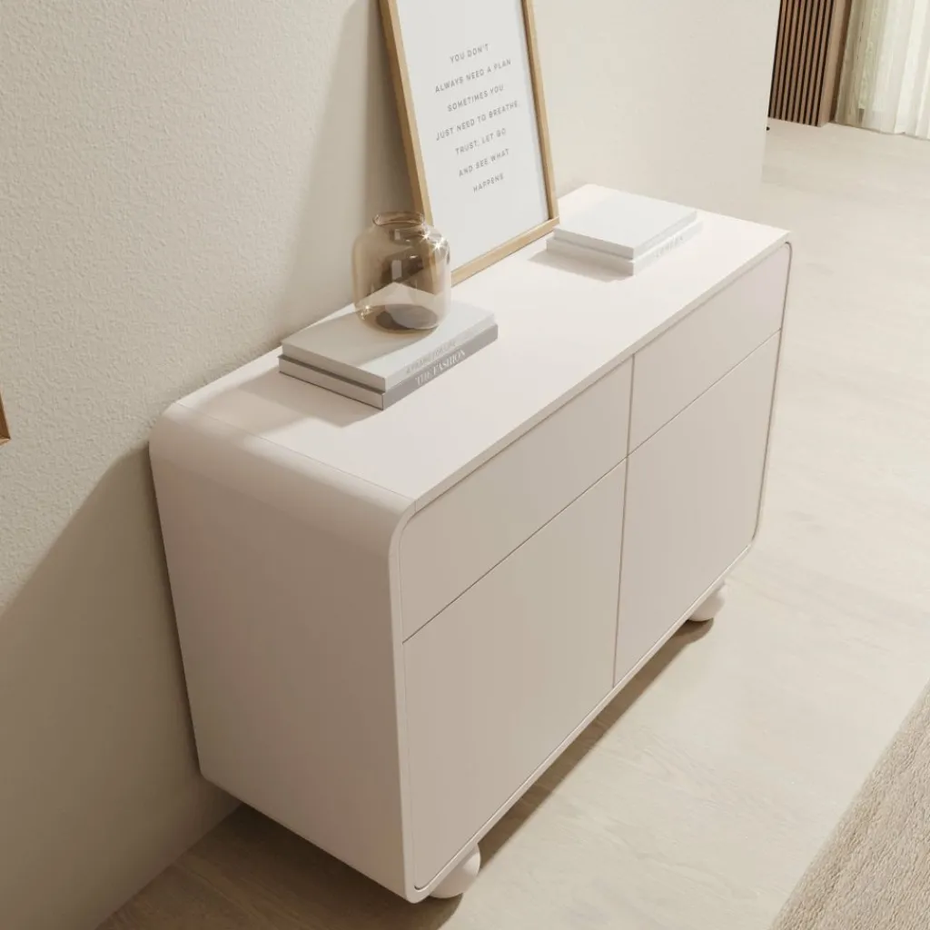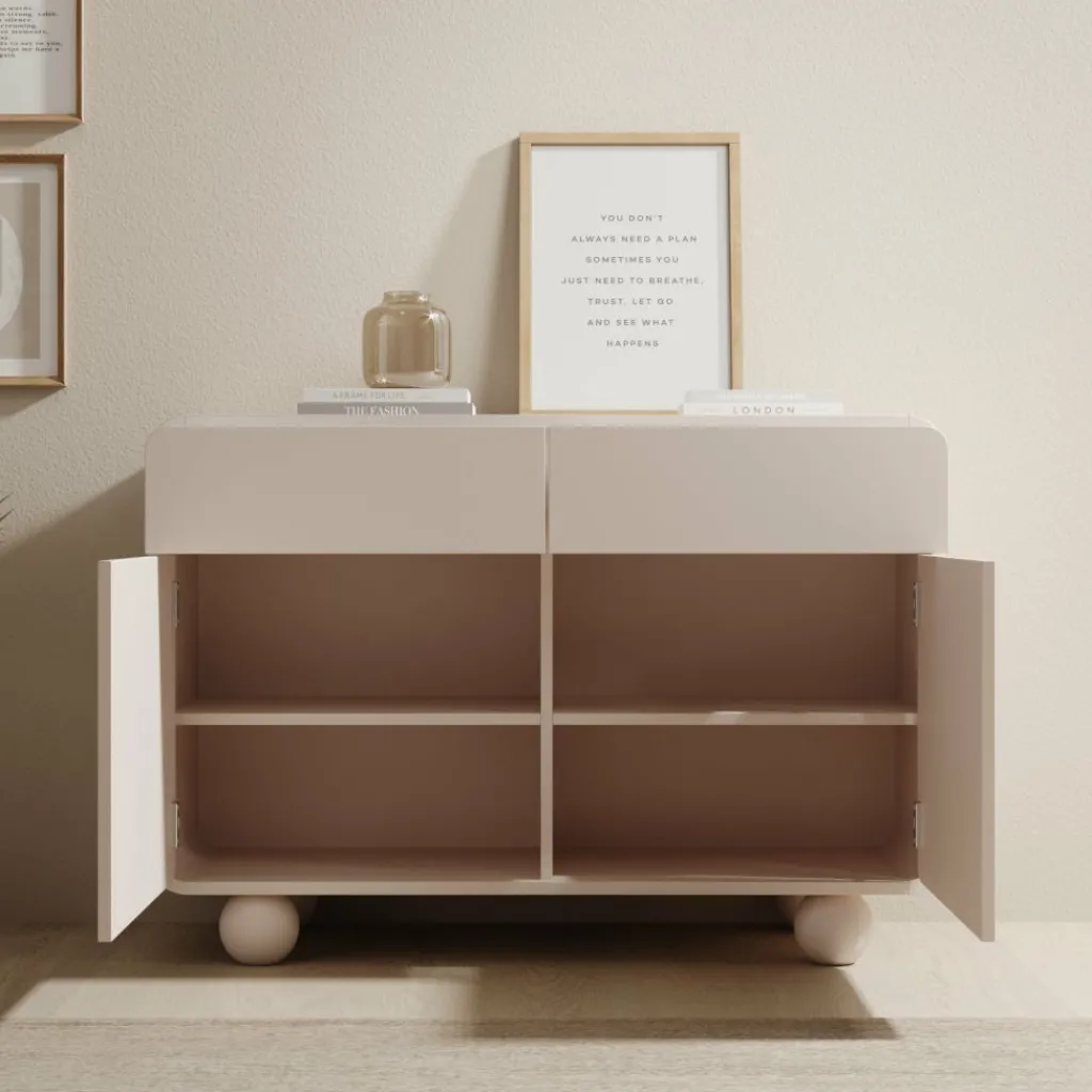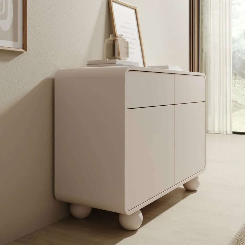 Het dressoir Anobo combineert praktisch opbergen met een modern design. De afgeronde hoeken en bolvormige pootjes geven het meubel een unieke en speelse uitstraling.