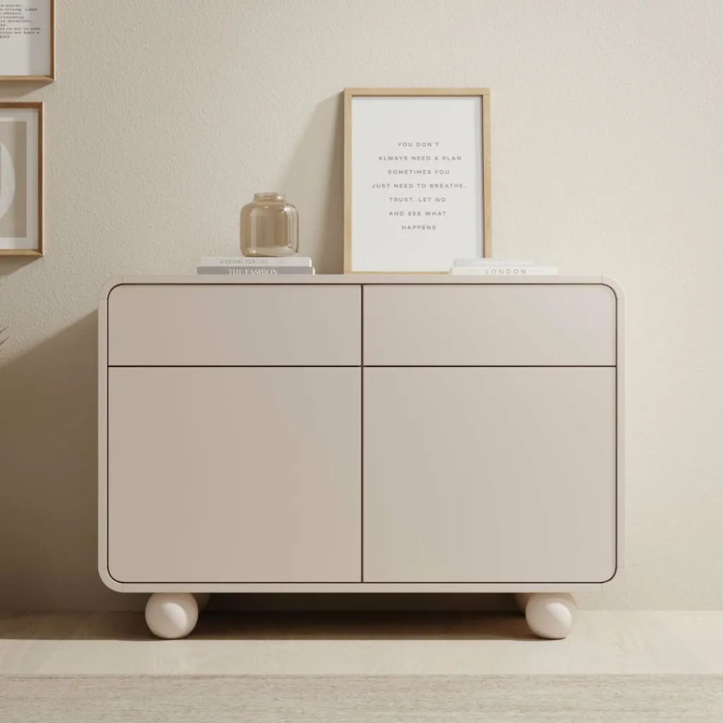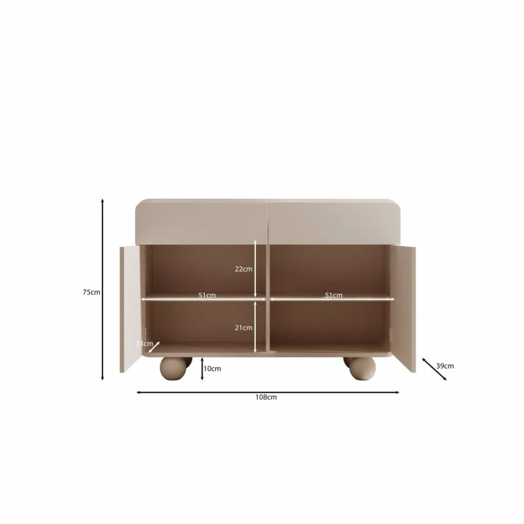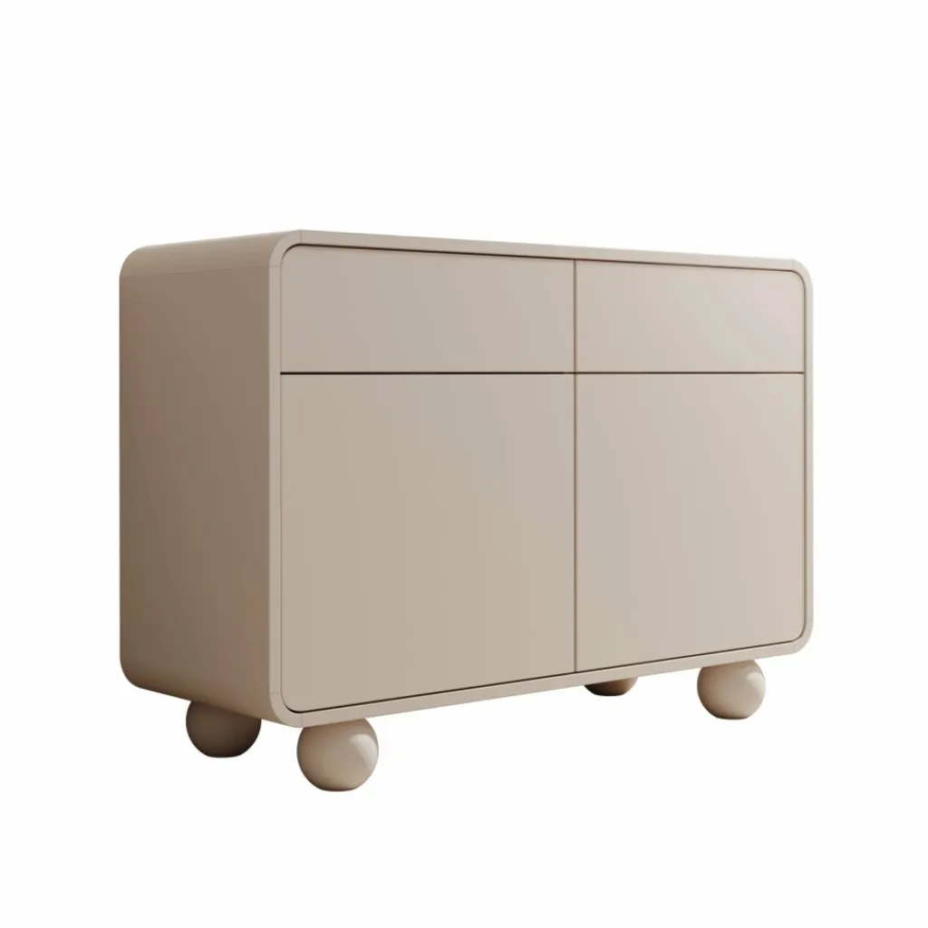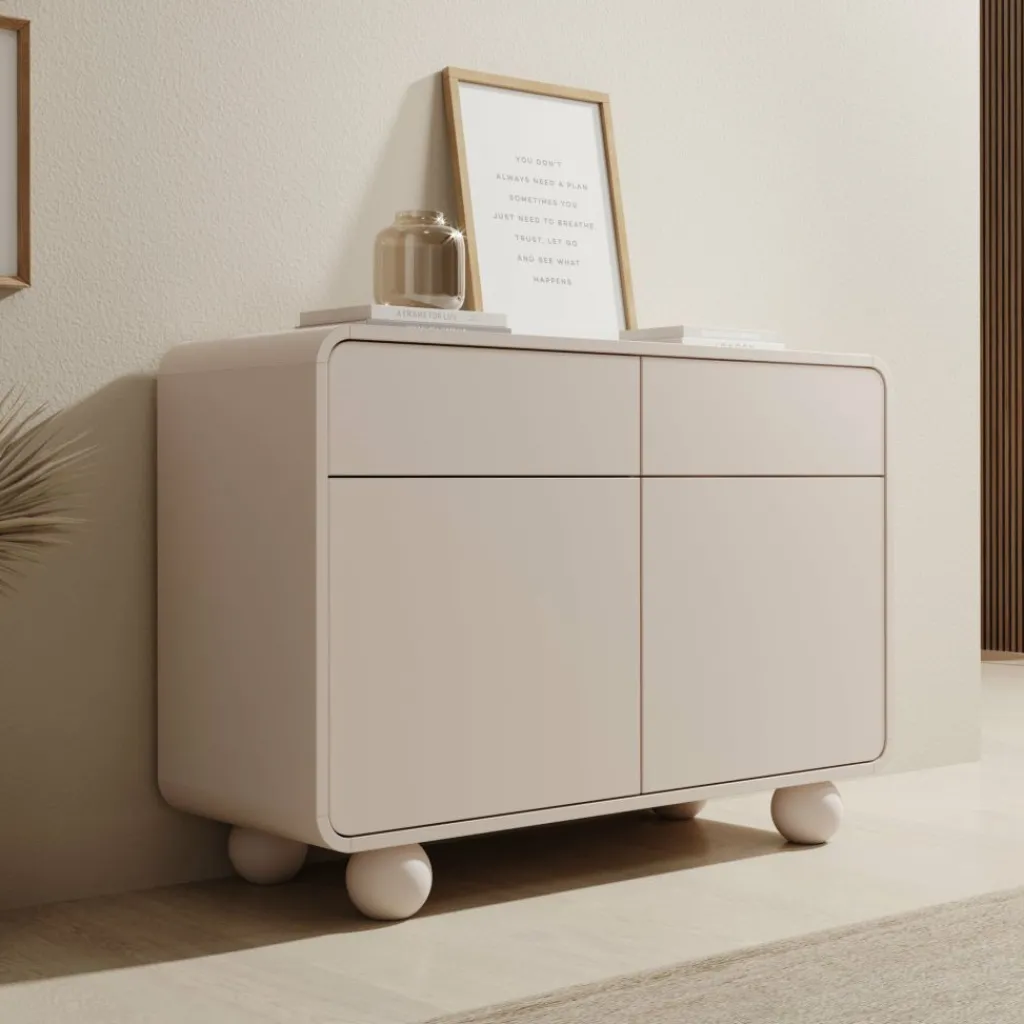 Het dressoir Anobo combineert praktisch opbergen met een modern design. De afgeronde hoeken en bolvormige pootjes geven het meubel een unieke en speelse uitstraling.