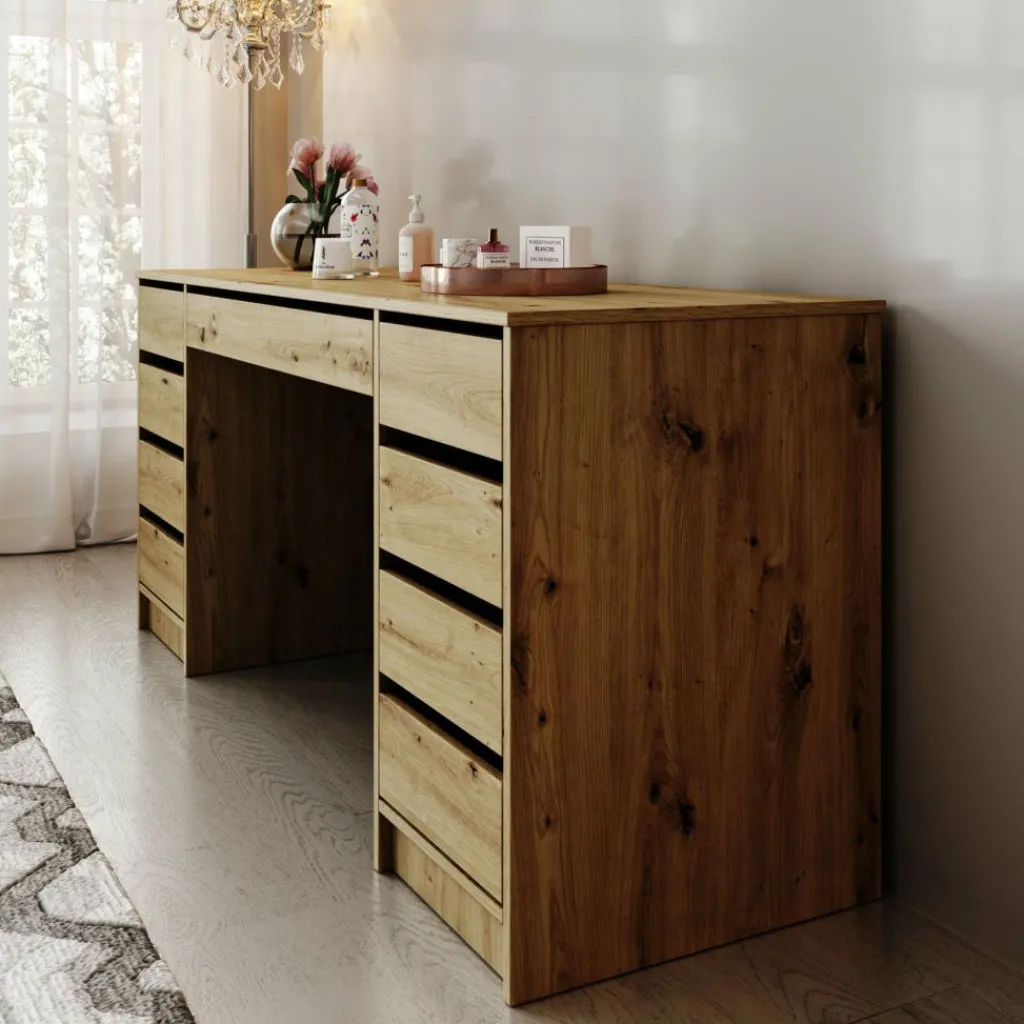 Deze kaptafel is gemaakt van stevig spaanplaat en afgewerkt in een moderne eiken kleur, waardoor hij perfect past in zowel strakke als industriële interieurs. De greeploze push to open lades zijn eenvoudig te openen en sluiten, en de brede middenlade is ideaal voor de spullen die je dagelijks gebruikt.