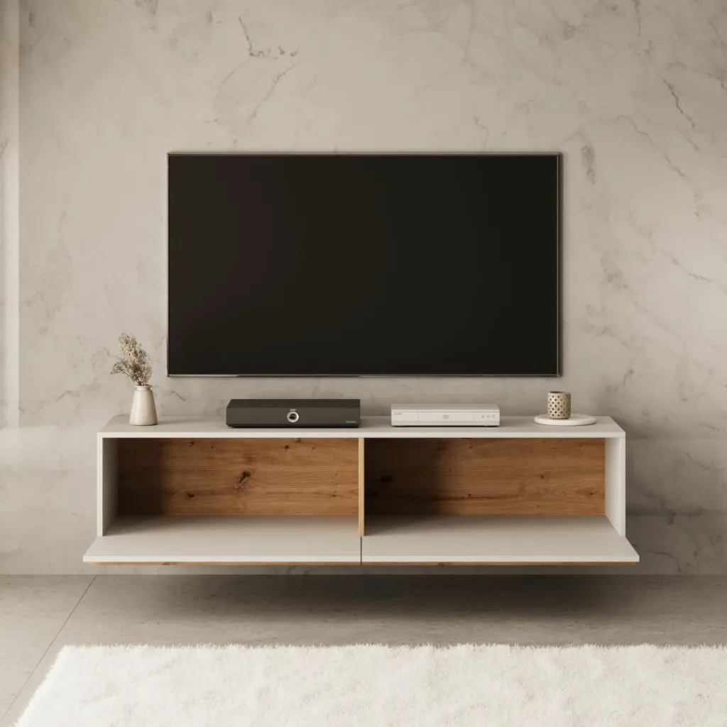 Achter de twee kleppen vind je twee ruime opbergvakken. Ideaal voor het opbergen van apparatuur, afstandsbedieningen of andere spullen die je graag uit het zicht houdt. Doordat het meubel aan de muur hangt, blijft de vloer vrij – dat oogt ruimtelijk en is makkelijk bij het schoonmaken.