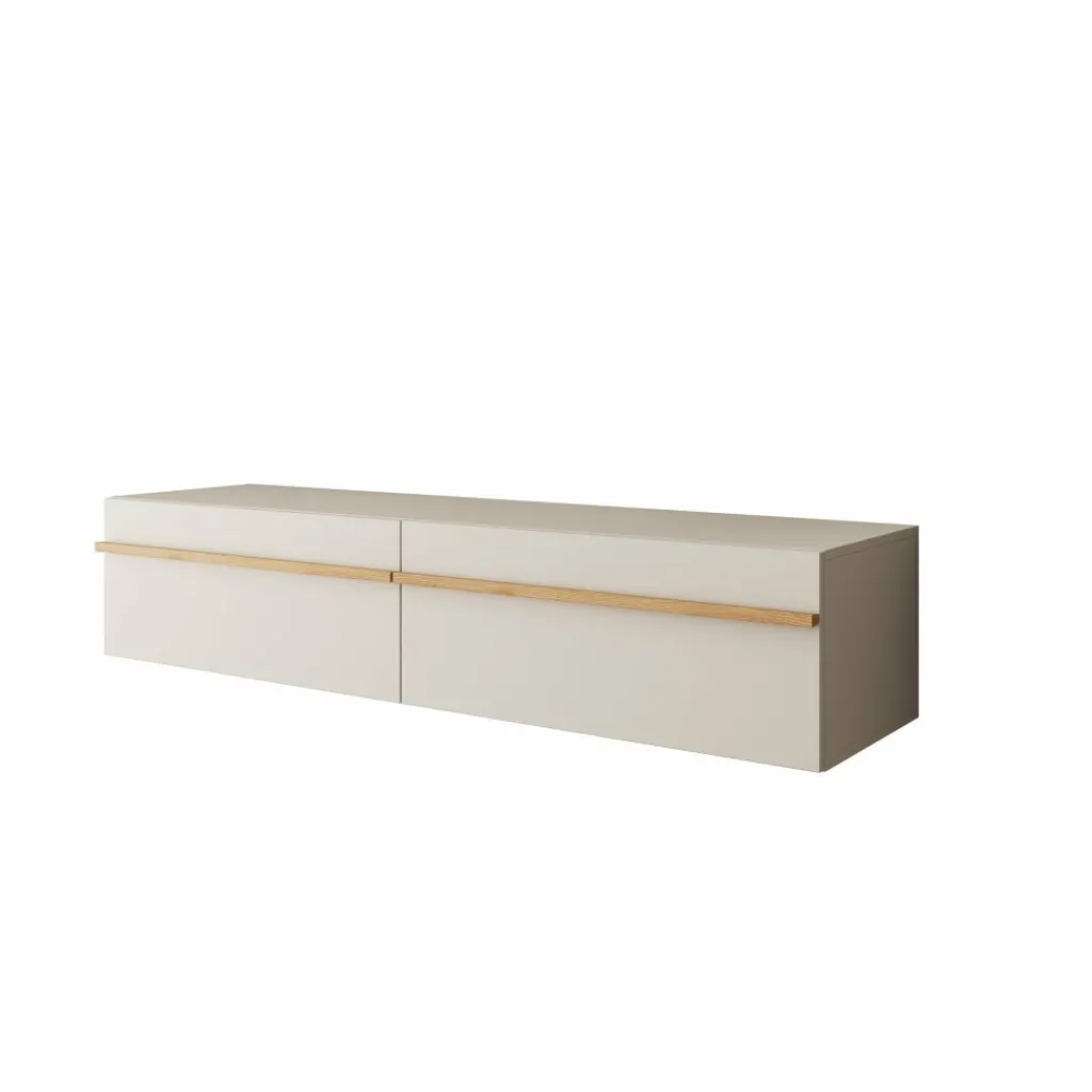 Strak, modern en praktisch: TV-Meubel Arda is een stijlvol hangend meubel in een zachte beige kleur met warme houtaccenten. De brede, eiken kleurige handgrepen geven het meubel karakter en maken het openen van de kleppen eenvoudig.