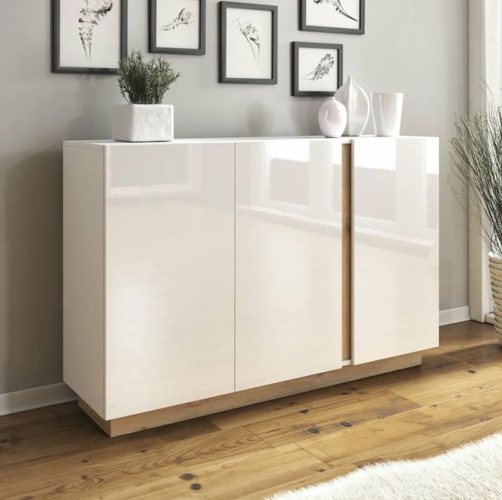 Dressoir Ashley beschikt over 3 deuren welke zijn afgewerkt in een hoogglans witte kleur, met daarachter opbergruimte.