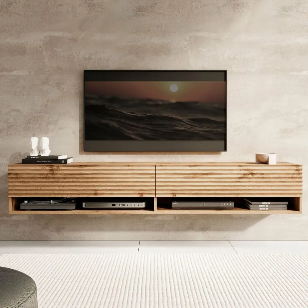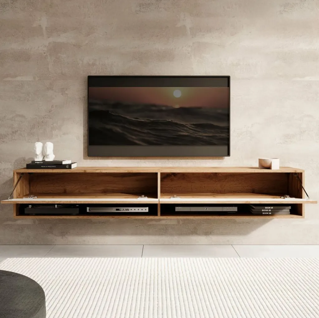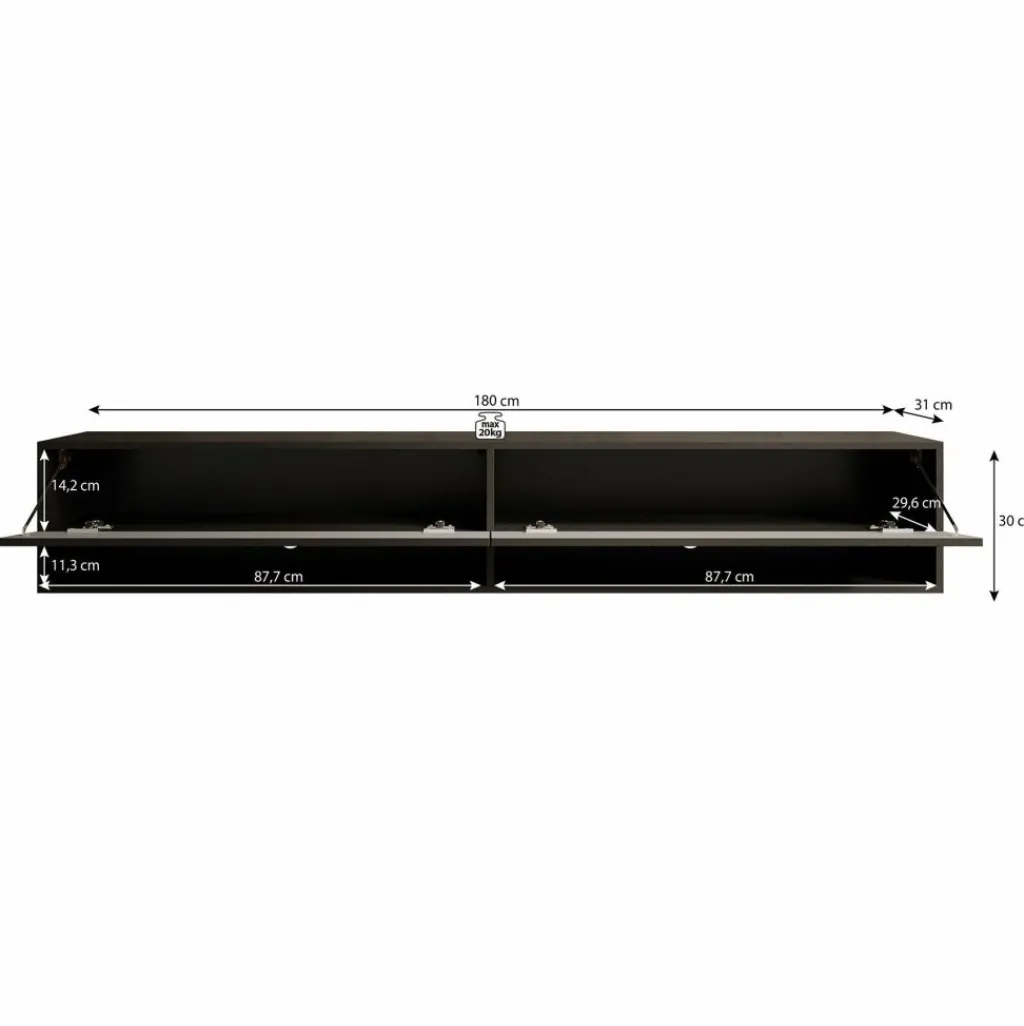 Het tv-meubel Asino is aan de muur op te hangen. Toch liever een staand model? Dat kan ook, door eenvoudig de bijgeleverde pootjes te monteren onder het meubel. De pootjes zijn zilverkleurig, gemaakt van kunststof en hebben een hoogte van 2 cm.