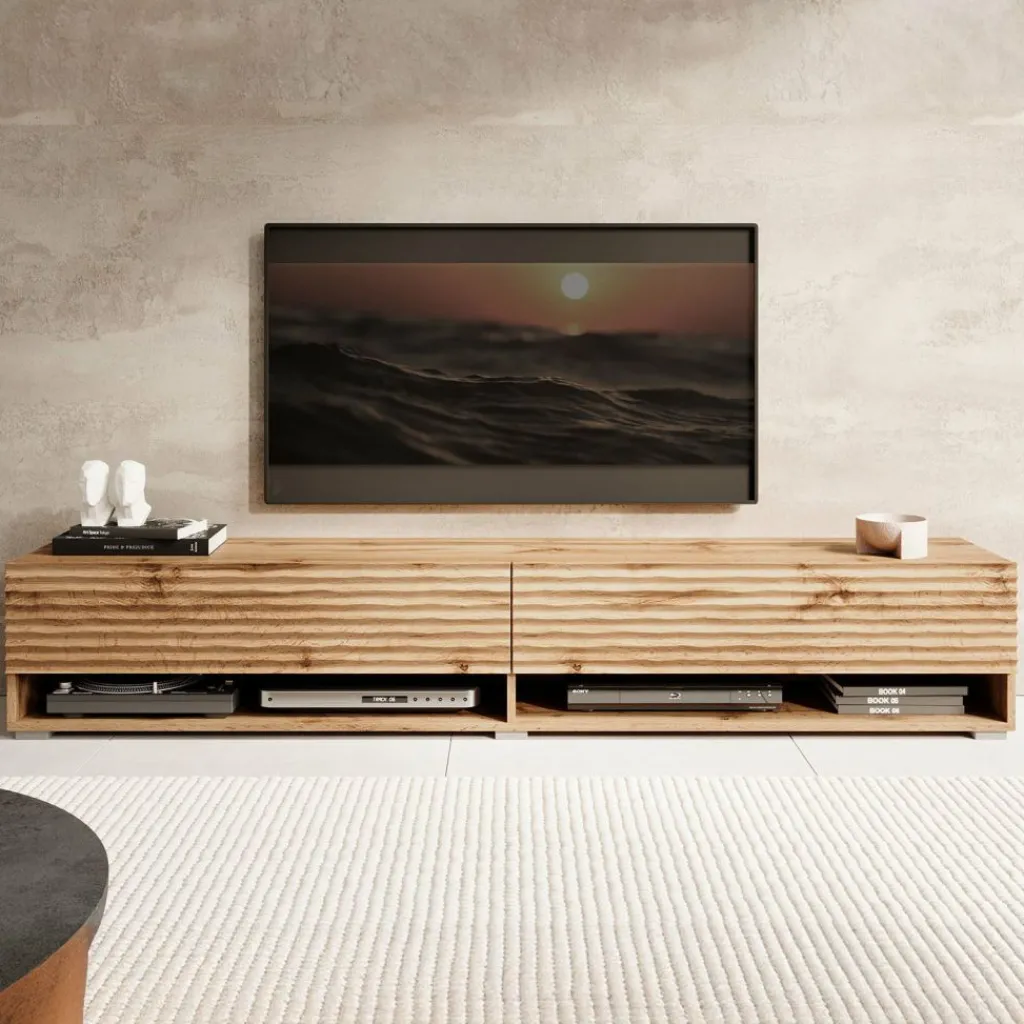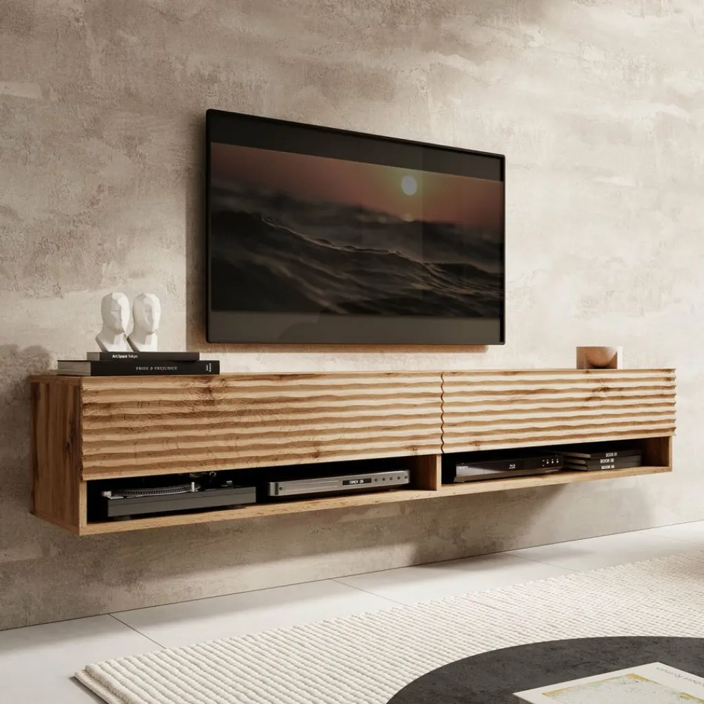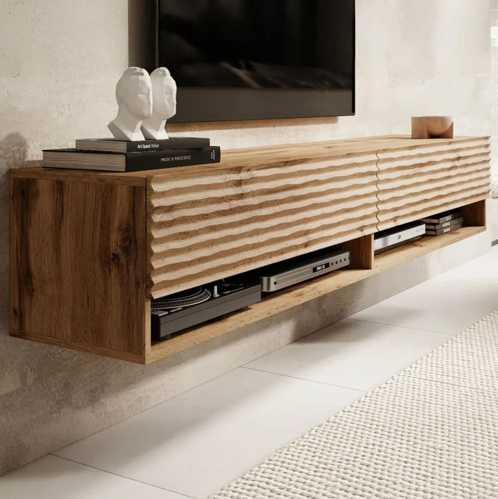 Het tv-meubel Asino is aan de muur op te hangen. Toch liever een staand model? Dat kan ook, door eenvoudig de bijgeleverde pootjes te monteren onder het meubel. De pootjes zijn zilverkleurig, gemaakt van kunststof en hebben een hoogte van 2 cm.