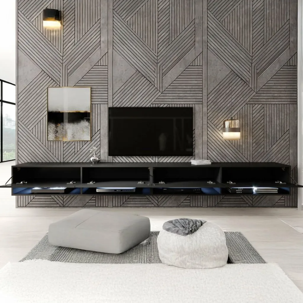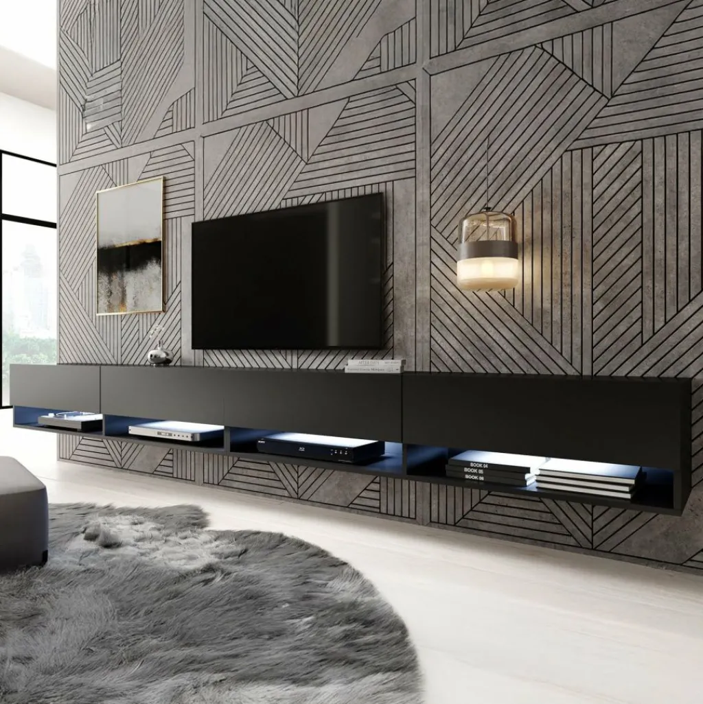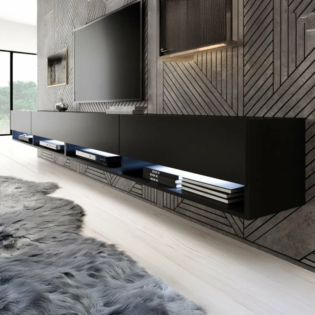 Het tv-meubel Asino is aan de muur op te hangen. Toch liever een staand model? Dat kan ook, door eenvoudig de bijgeleverde pootjes te monteren onder het meubel. De pootjes zijn zilverkleurig, gemaakt van kunststof en hebben een hoogte van 2 cm.