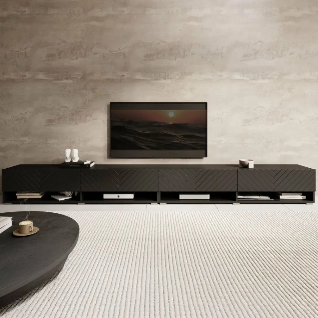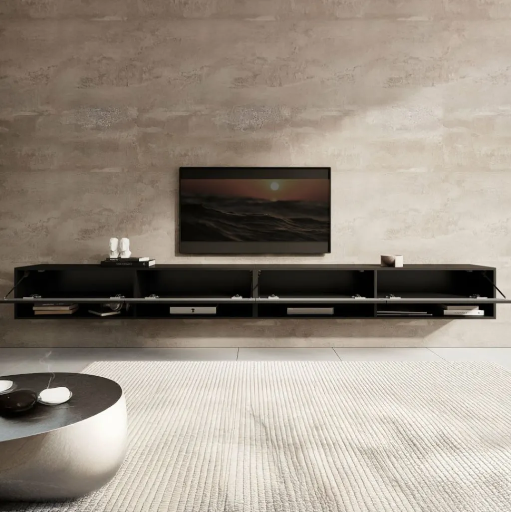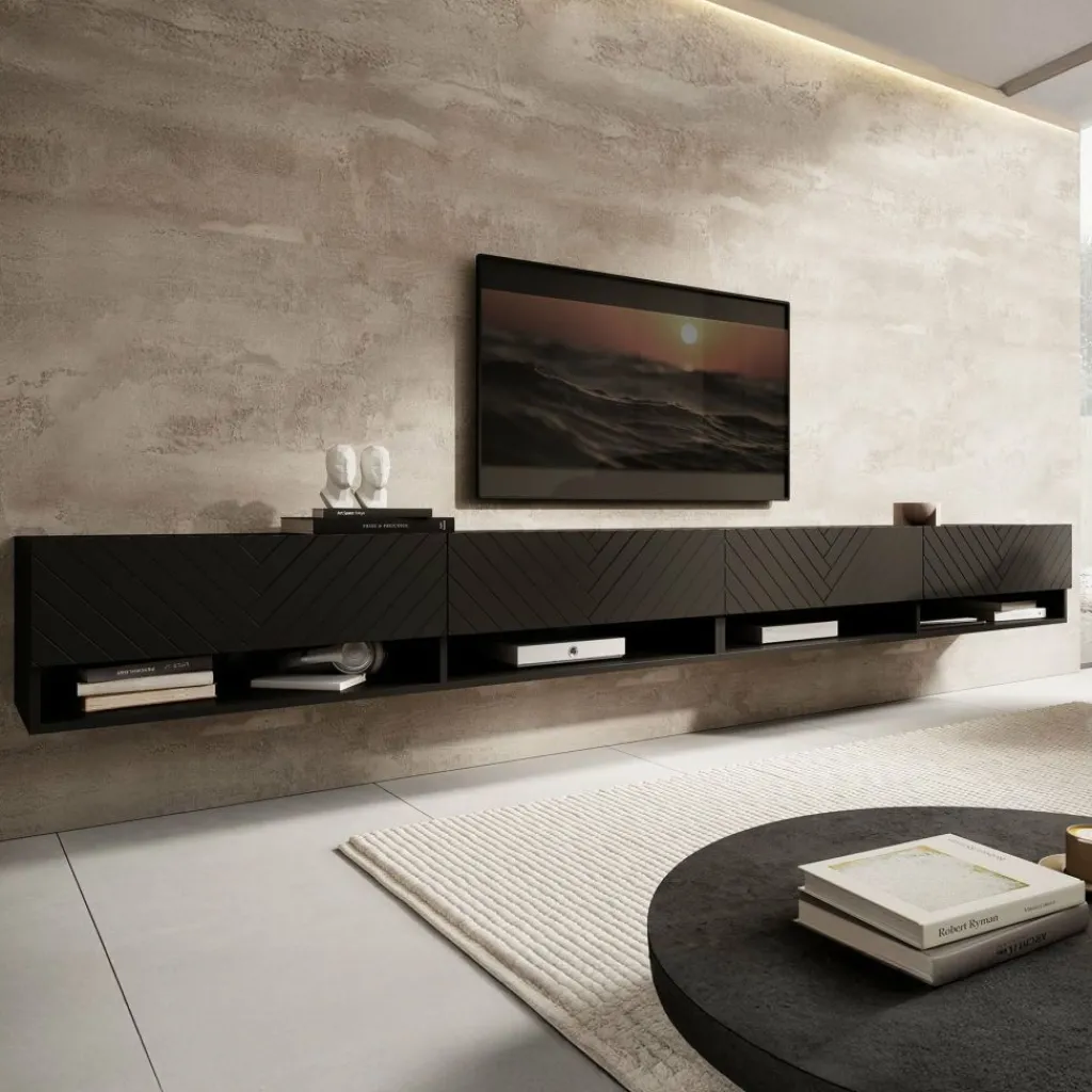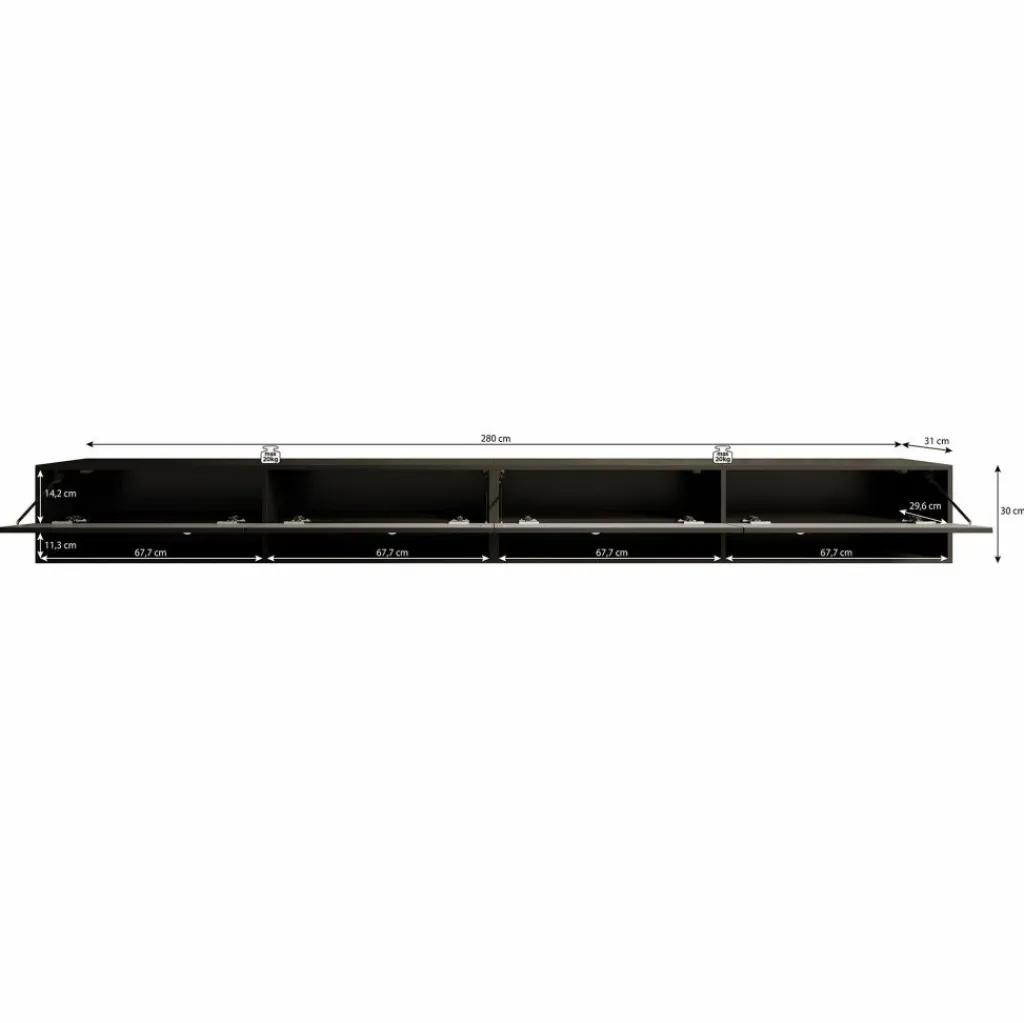 Het tv-meubel Asino is aan de muur op te hangen. Toch liever een staand model? Dat kan ook, door eenvoudig de bijgeleverde pootjes te monteren onder het meubel. De pootjes zijn zilverkleurig, gemaakt van kunststof en hebben een hoogte van 2 cm. Dit model bestaat uit 2 meubels van elk 140 cm breed.