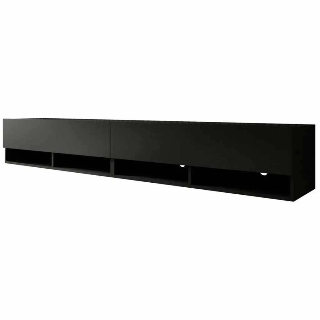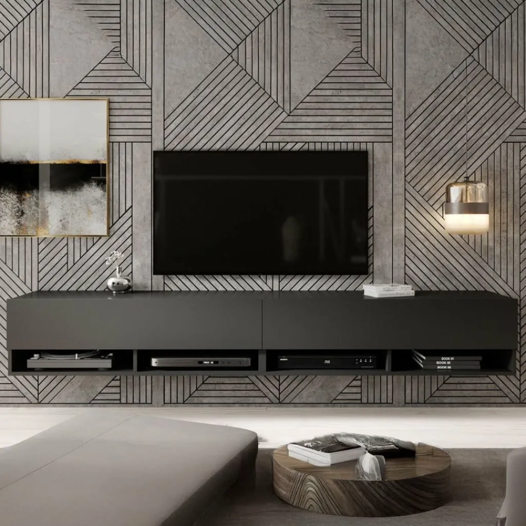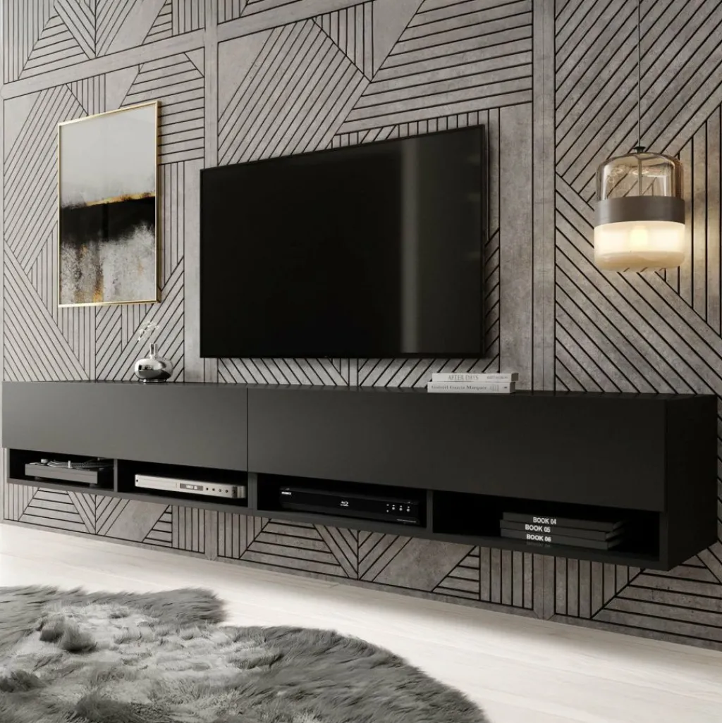 Het tv-meubel Asino is aan de muur op te hangen. Toch liever een staand model? Dat kan ook, door eenvoudig de bijgeleverde pootjes te monteren onder het meubel. De pootjes zijn zilverkleurig, gemaakt van kunststof en hebben een hoogte van 2 cm.
