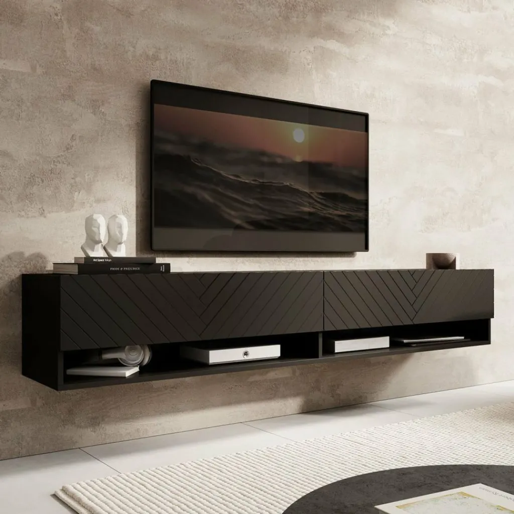 Het tv-meubel Asino is aan de muur op te hangen. Toch liever een staand model? Dat kan ook, door eenvoudig de bijgeleverde pootjes te monteren onder het meubel. De pootjes zijn zilverkleurig, gemaakt van kunststof en hebben een hoogte van 2 cm.