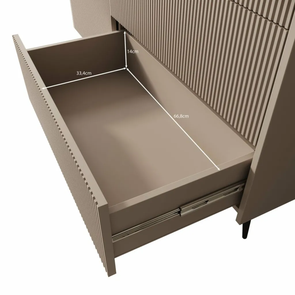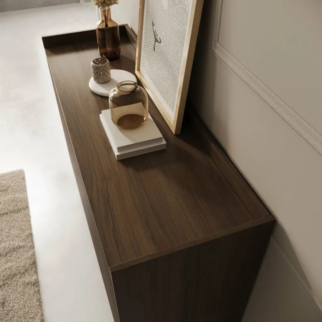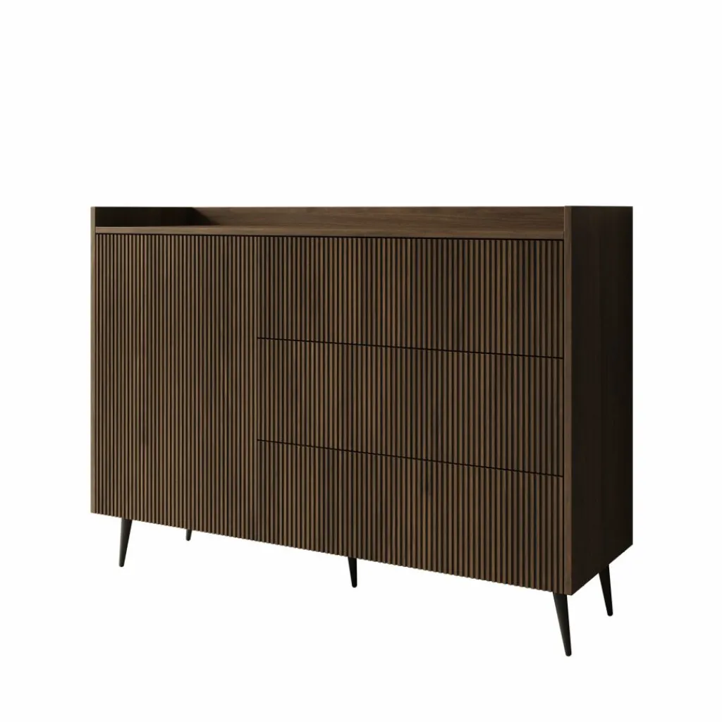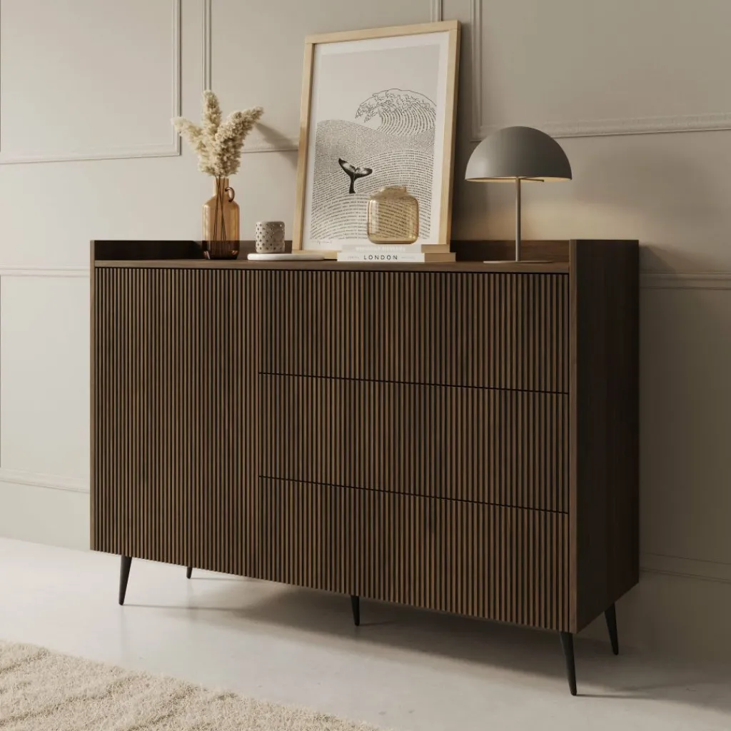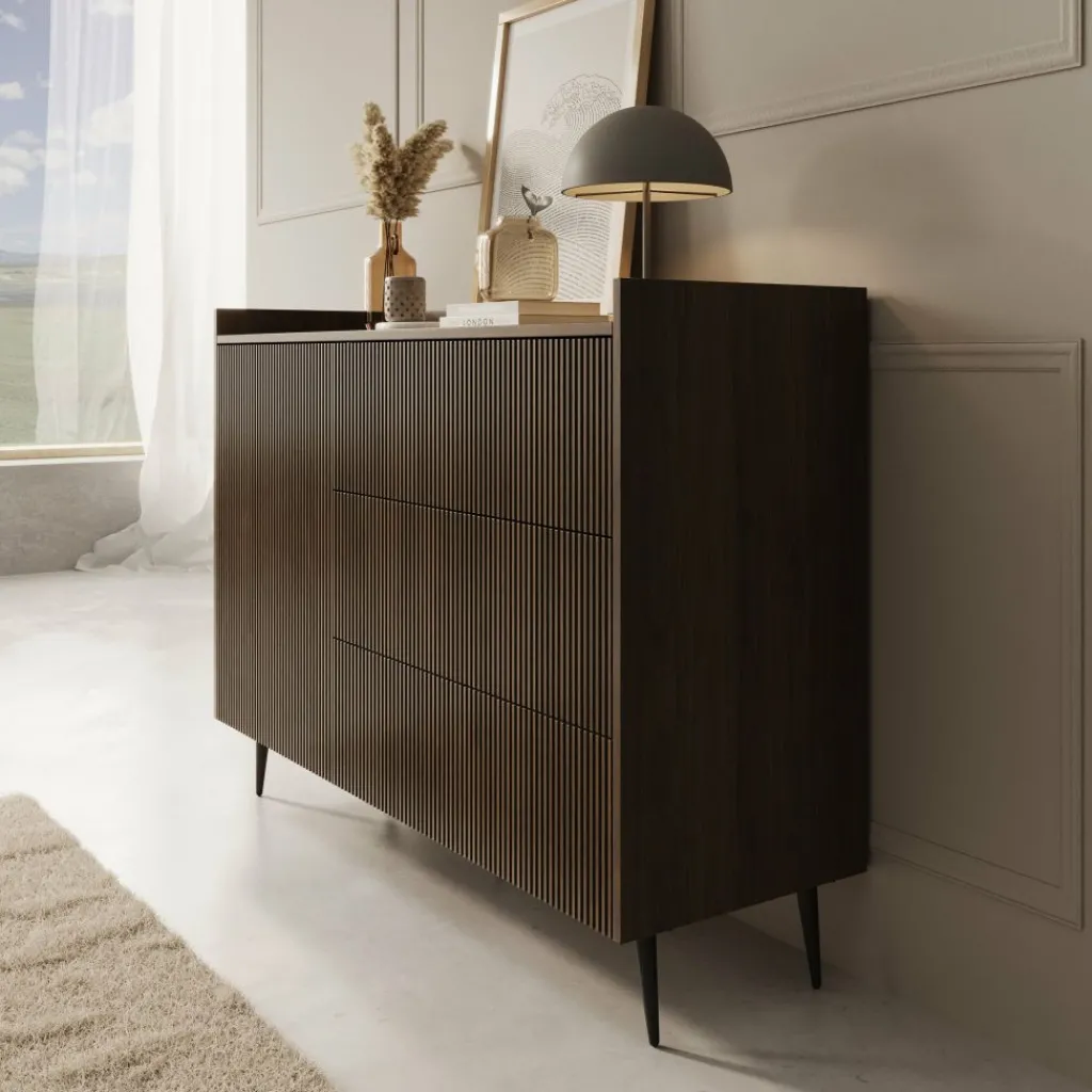 Dressoir Asty in donker eiken heeft een strak en modern ontwerp met een duidelijke structuur in de fronten. De verticale groeven geven het meubel een subtiel ritme en zorgen voor een verzorgde, eigentijdse uitstraling. De donker eiken kleur brengt warmte in het interieur en combineert goed met zowel lichte als donkere tinten.