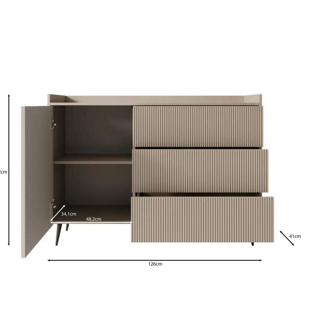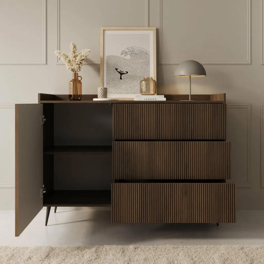 Het dressoir is uitgerust met drie ruime lades die praktische opbergruimte bieden voor allerlei voorwerpen, van servies tot woonaccessoires. Dankzij de compacte afmetingen is het meubel geschikt voor verschillende ruimtes, zoals de woonkamer, eetkamer of hal. De zwarte poten zorgen voor een stabiele basis en een moderne afwerking.