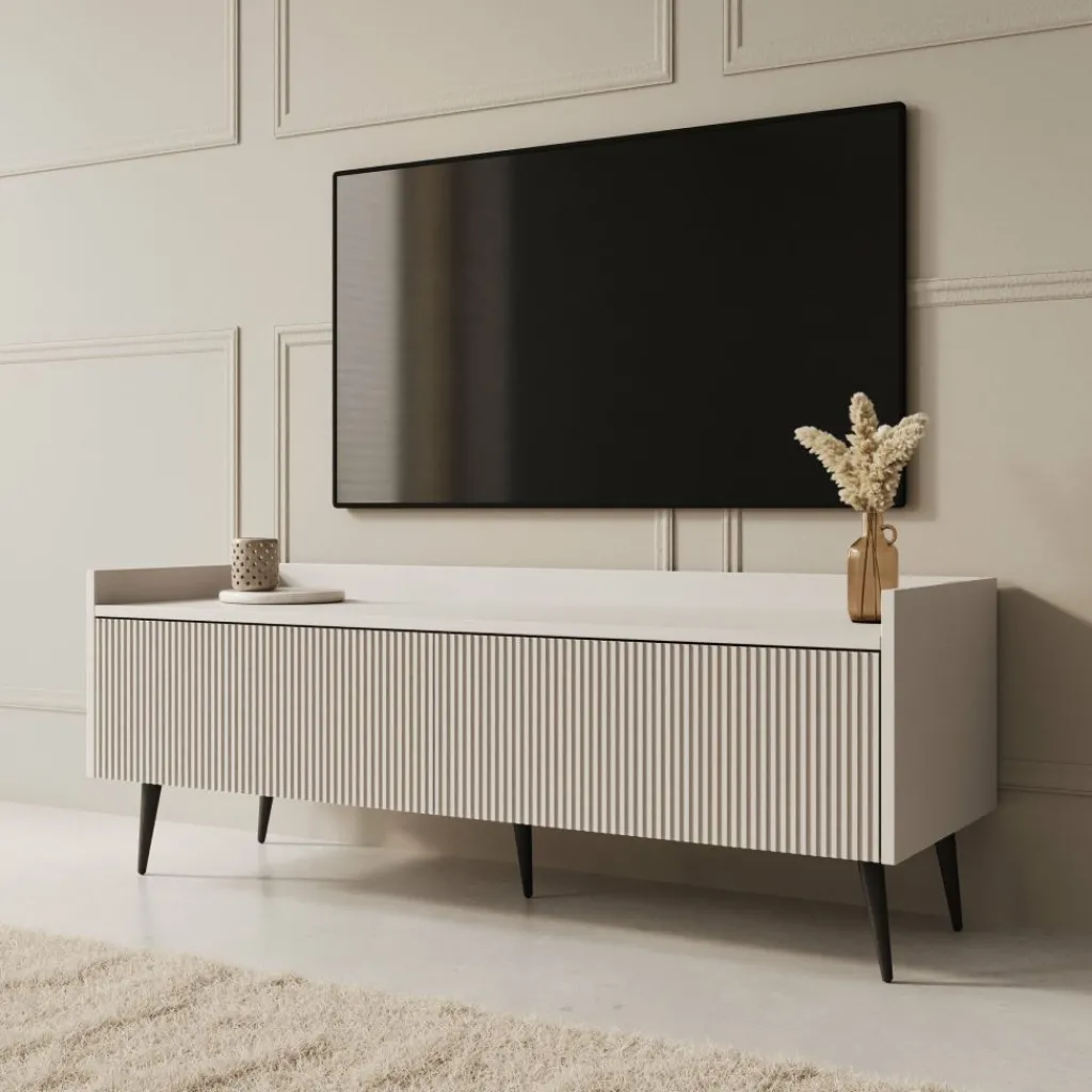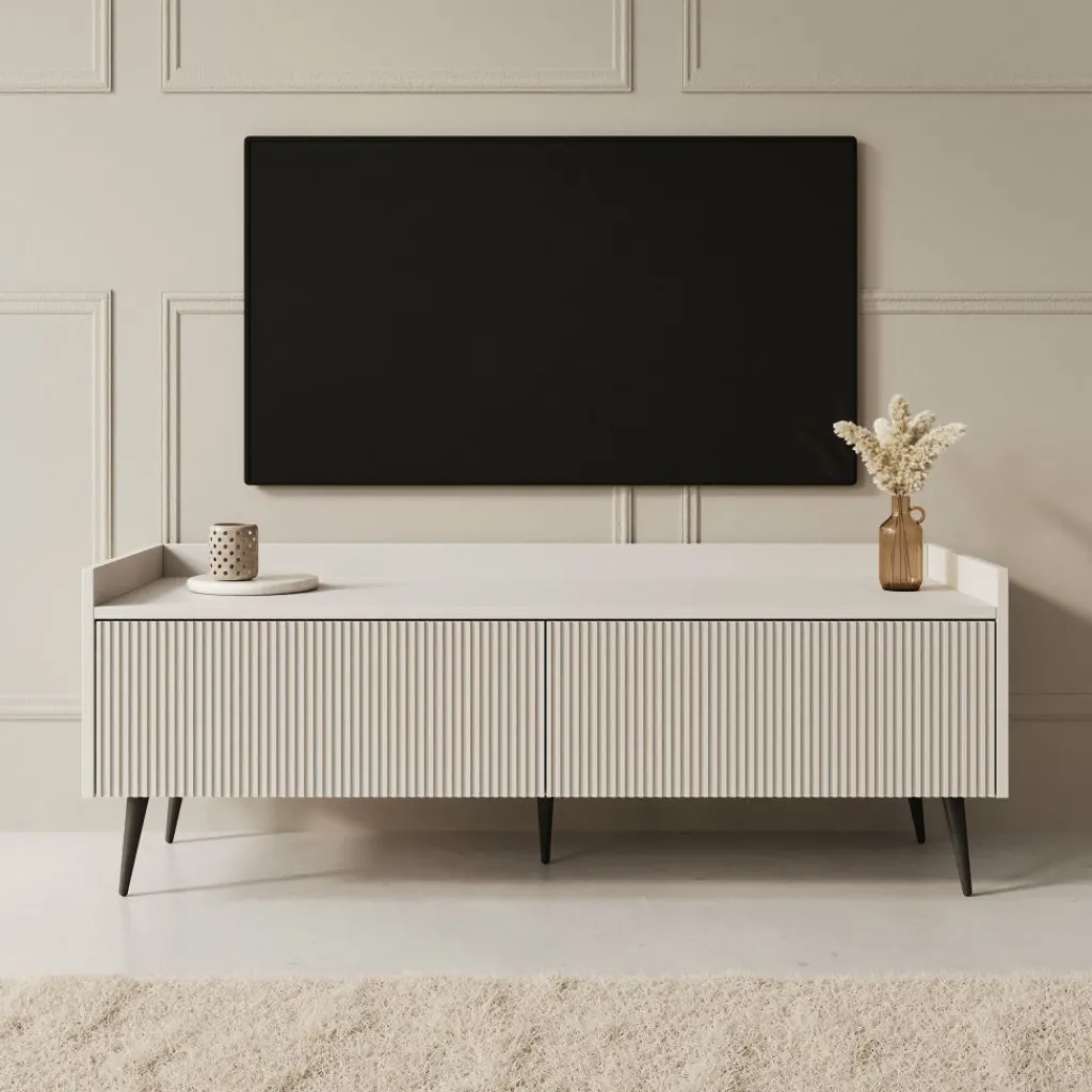 TV-meubel Asty in beige heeft een strak en modern ontwerp met verticale lijnen op de fronten. Deze lijnen zorgen voor een duidelijk gestructureerde uitstraling en geven het meubel een herkenbaar detail. De beige afwerking maakt het meubel geschikt voor verschillende woonruimtes.