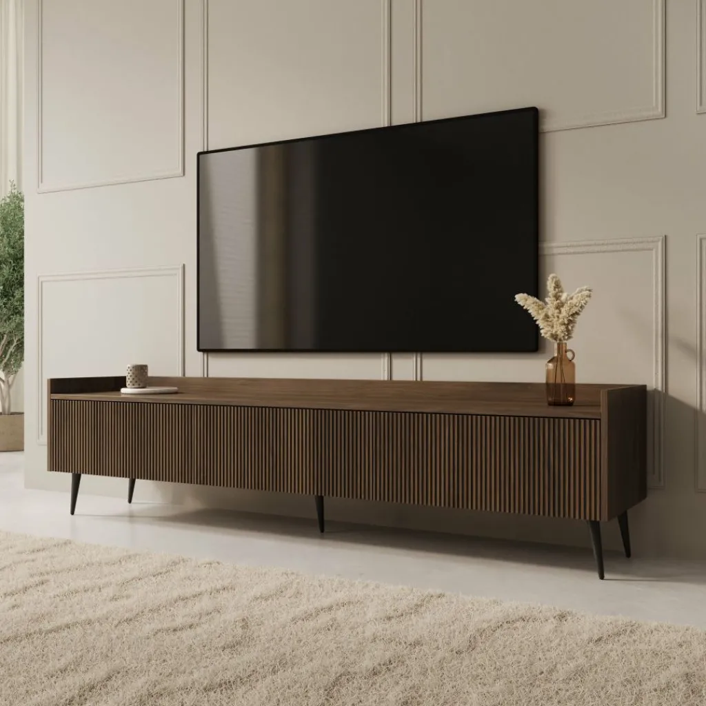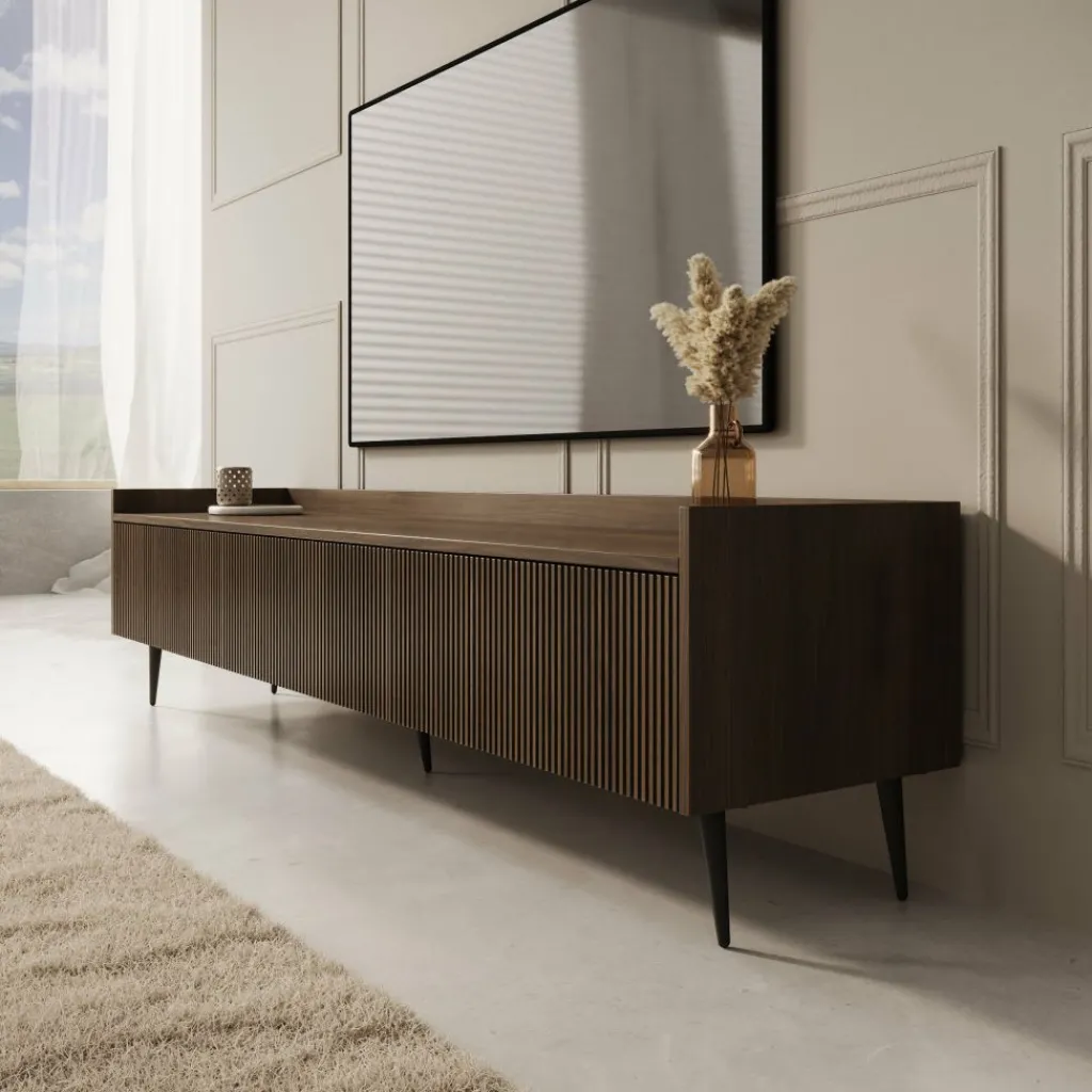 TV-meubel Asty in donker eiken heeft een strak en modern ontwerp met verticale lijnen aan de voorkant. De donker eiken kleur geeft het meubel een warme, natuurlijke uitstraling die goed past in diverse woonstijlen.