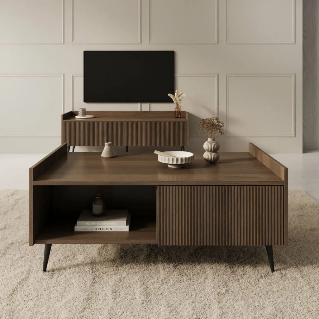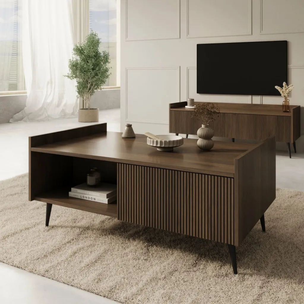 Salontafel Asty in donker eiken is een stijlvolle blikvanger met een warme, natuurlijke uitstraling. De verticale groeven aan de voorkant geven het meubel een moderne en verfijnde look, terwijl de donker eikenhoutkleur zorgt voor een luxe en sfeervol accent in de woonkamer.