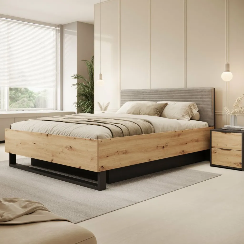 Tweepersoonsbed Augustus is een stijlvol bed met een eikenhout-look frame en een zacht stoffen hoofdboard.