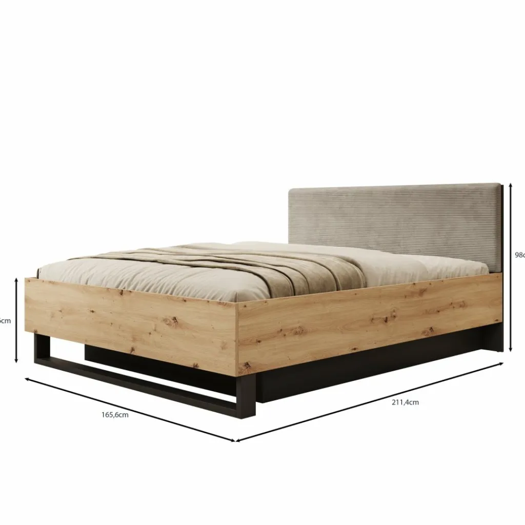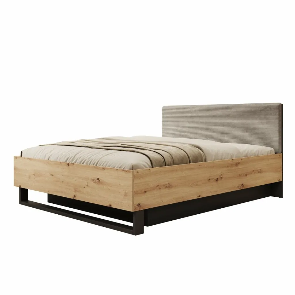 Het bed combineert een warme uitstraling met moderne accenten zoals het zwarte metalen onderstel en de ribstof bekleding van het hoofdbord. Het bed wordt zonder lattenbodem en matras geleverd.