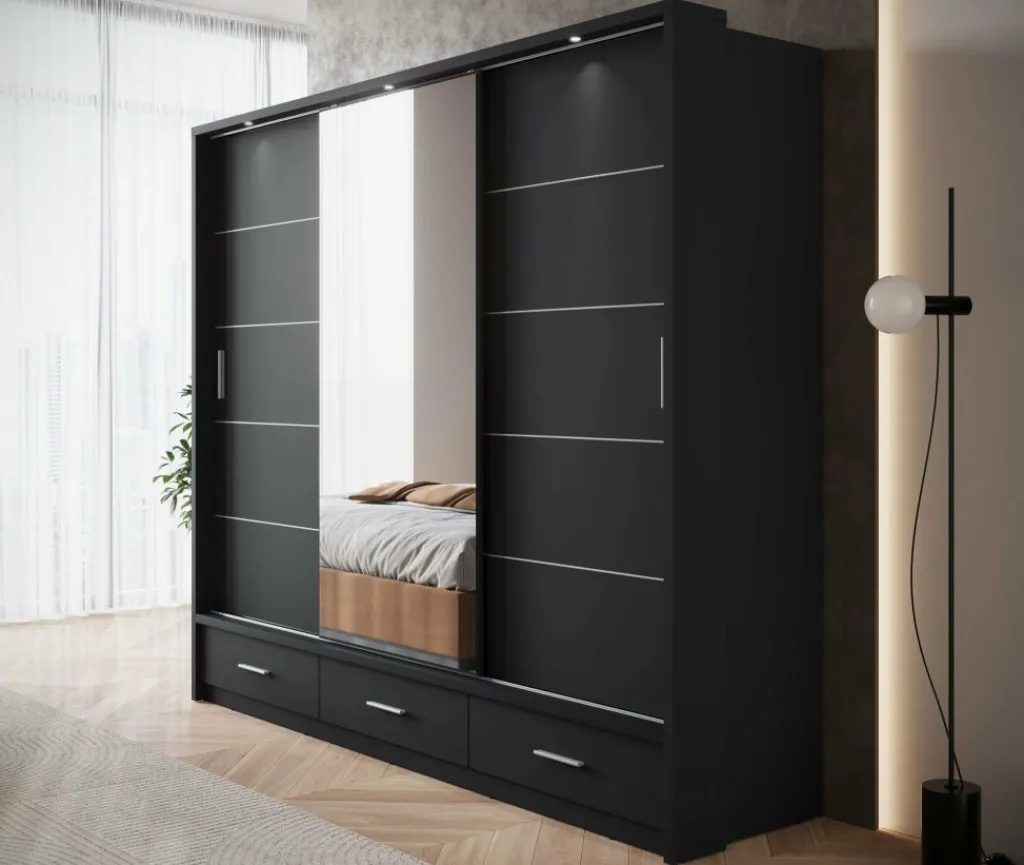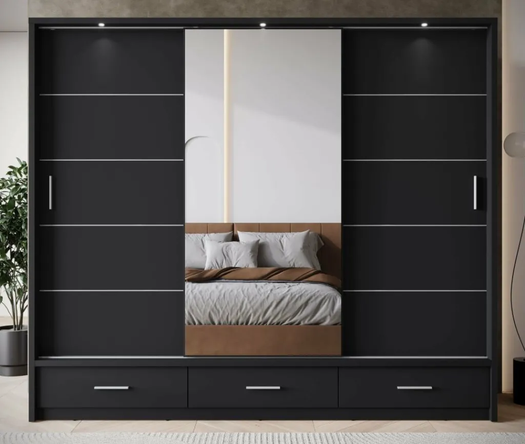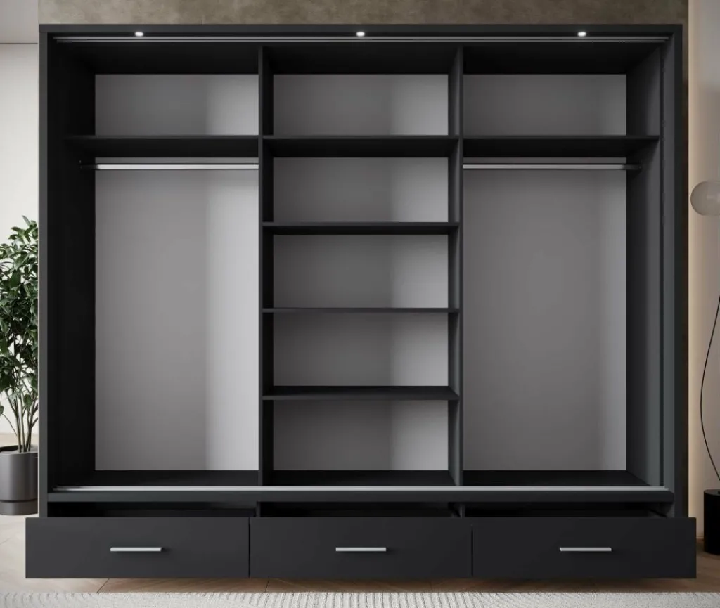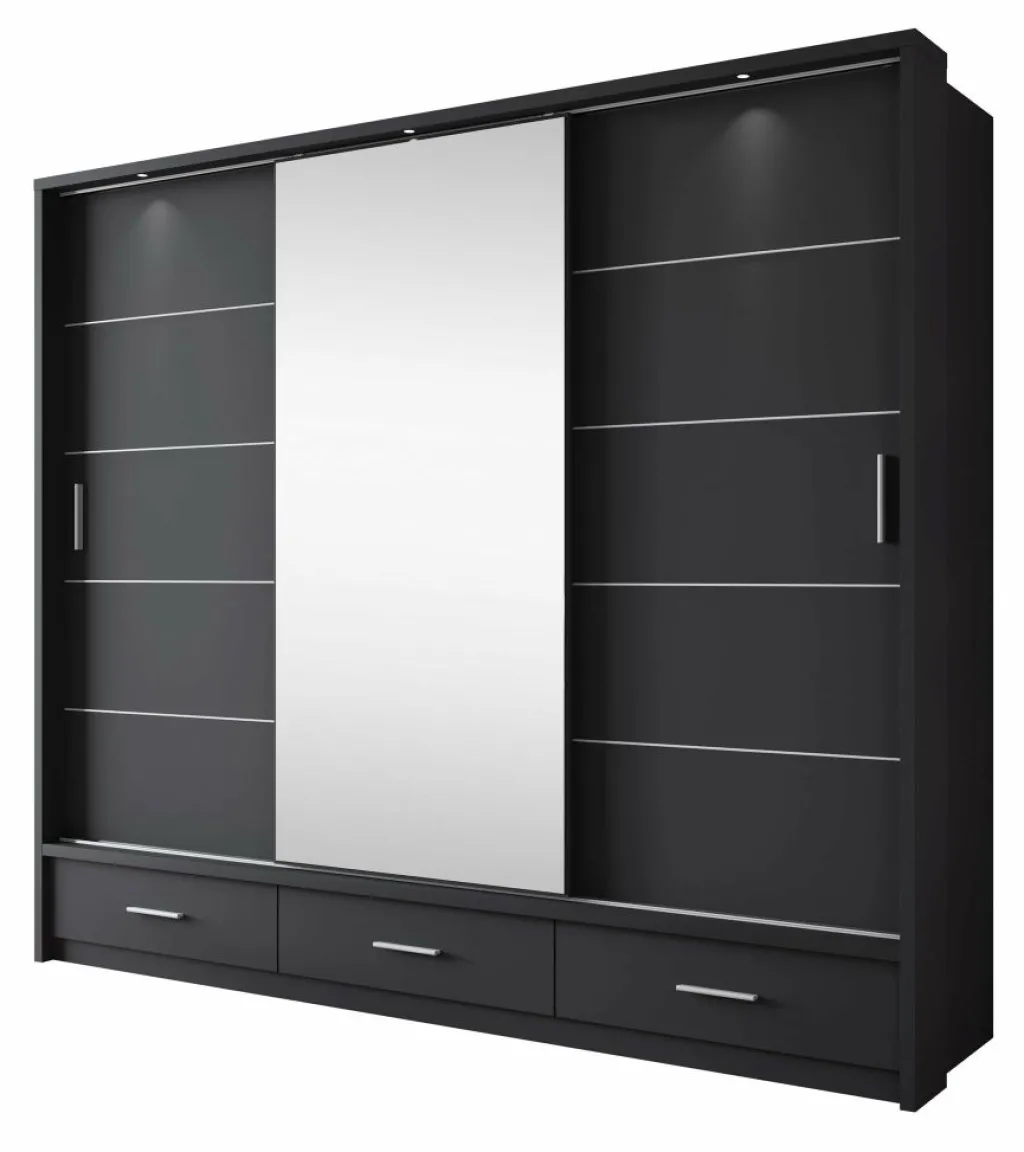 Kledingkast Autumn is een garderobekast met ruime opbergmogelijkheden in een moderne stijl. Dit model beschikt over 3 schuifdeuren en 3 lades die openen met zwarte handgrepen. De middelste deur is voorzien van een spiegel. De binnenkant van de kast bestaat uit 2 kledingroedes en 7 opbergvakken. De Autumn is uitgevoerd in een zwarte kleur. Ten slotte beschikt het meubel over LED-verlichting.