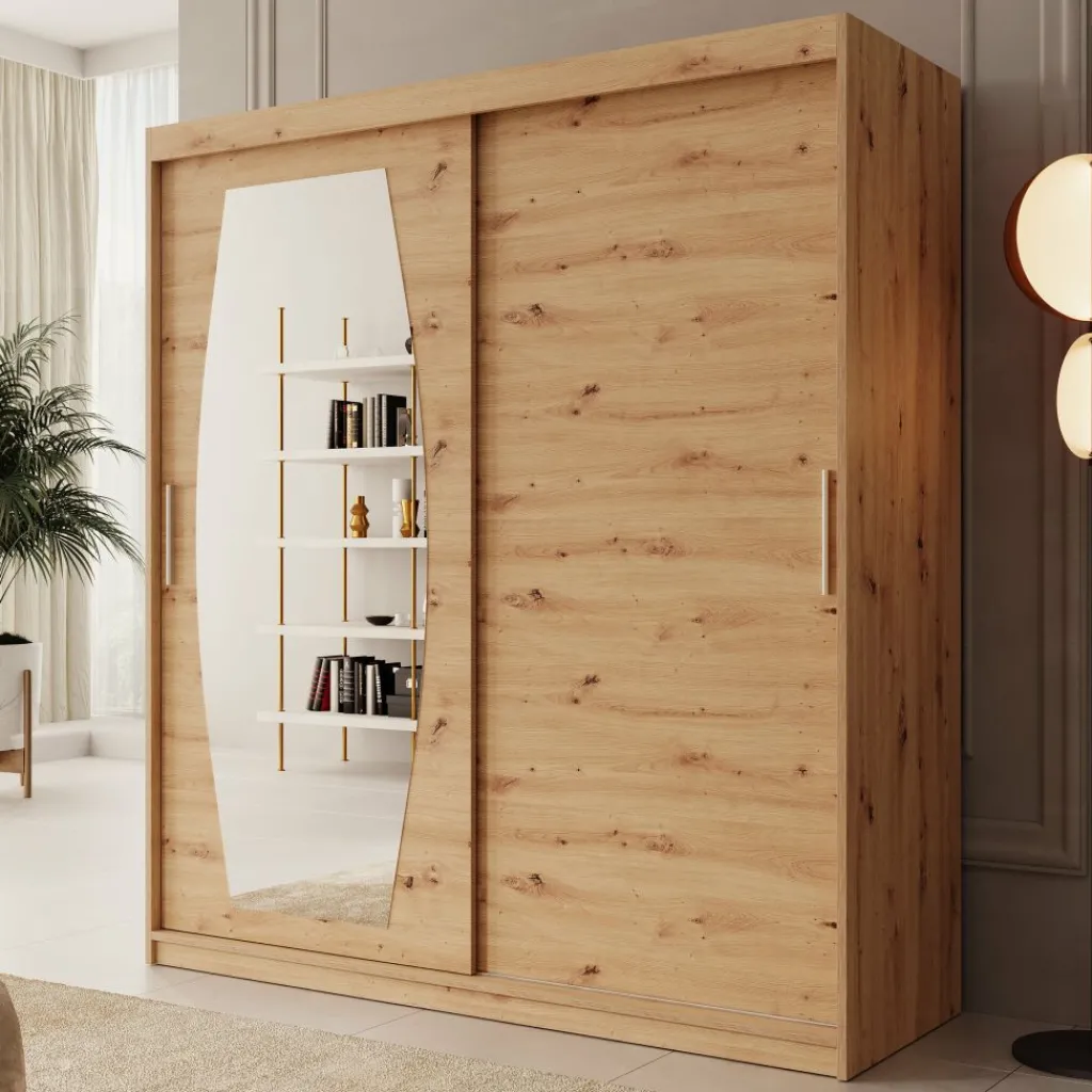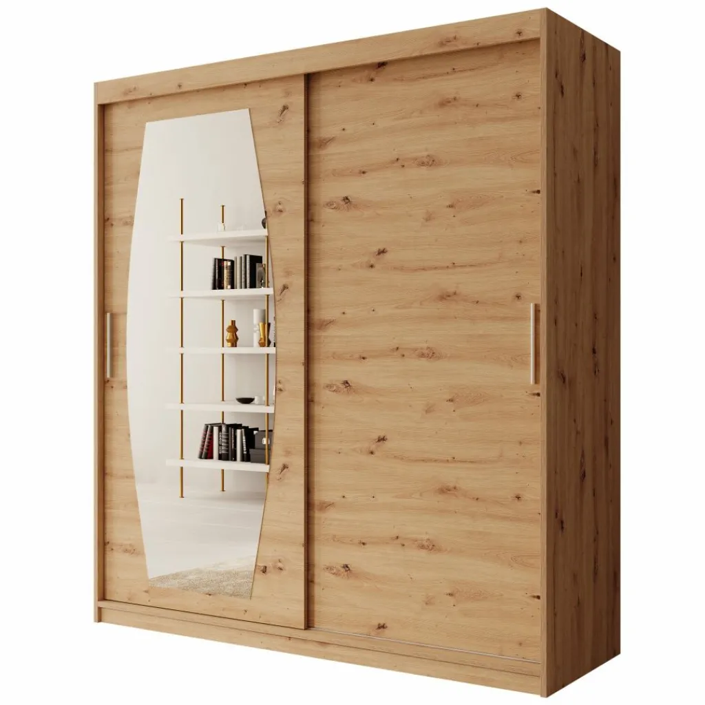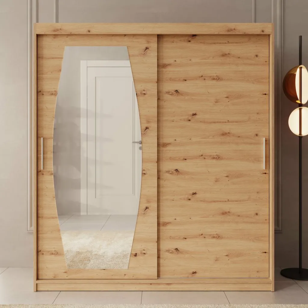 Kledingkast Azai combineert een warme eikenlook met slimme opbergruimte en een grote spiegel. De kast is 180 cm breed, 200 cm hoog en 62 cm diep – ruim genoeg voor het netjes opbergen van al je kleding.