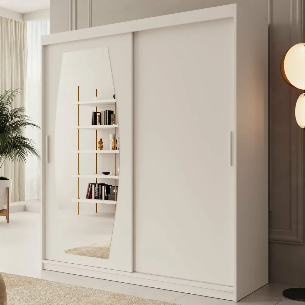 Kledingkast Azai combineert een frisse witte look met slimme opbergruimte en een grote spiegel. De kast is 180 cm breed, 200 cm hoog en 62 cm diep – ruim genoeg voor het netjes opbergen van al je kleding.