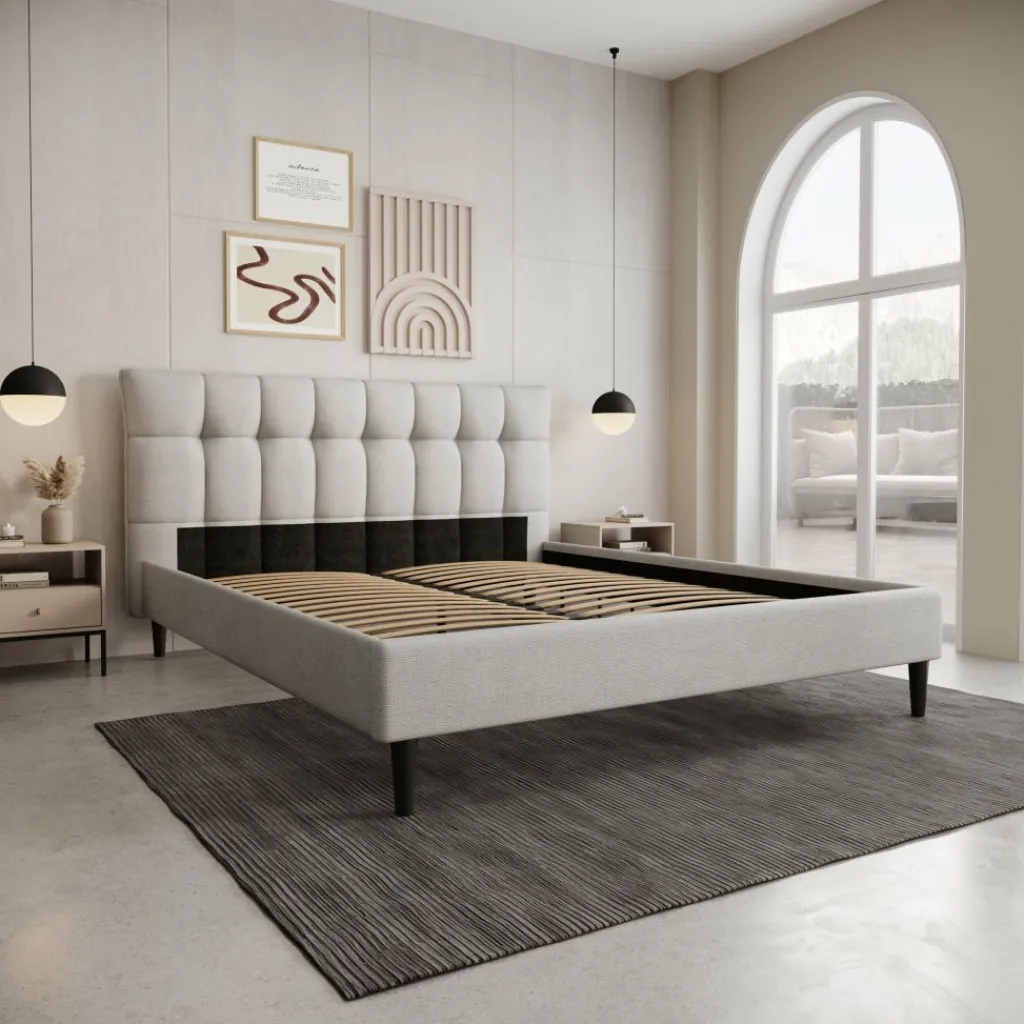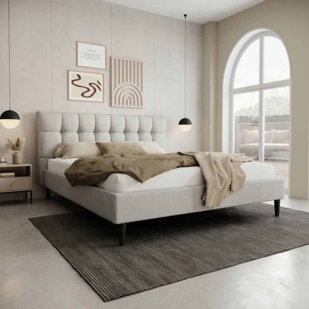 Het Azulita tweepersoonsbed heeft een gestoffeerd ontwerp in lichtgrijze stof met een hoog, gecapitonneerd hoofdbord. De verticale en horizontale stiklijnen geven het hoofdbord een duidelijk blokpatroon, waardoor het bed direct opvalt zonder druk te ogen. Dankzij de rustige kleur en strakke afwerking past het bed goed in moderne en minimalistische slaapkamers.