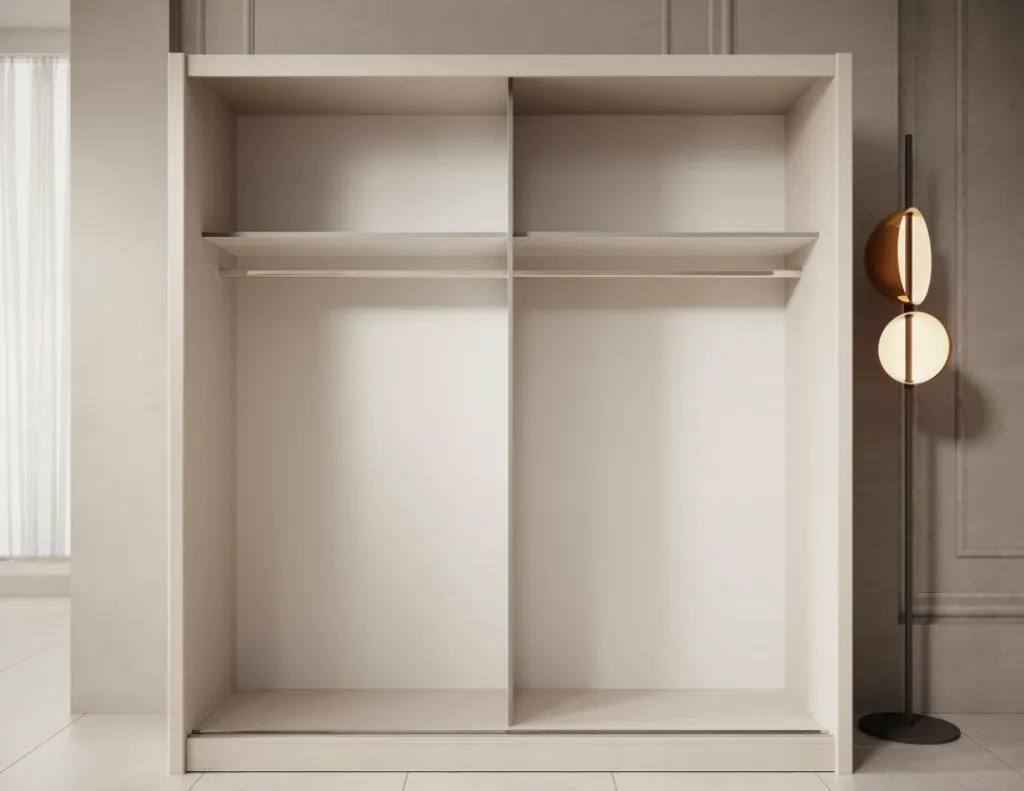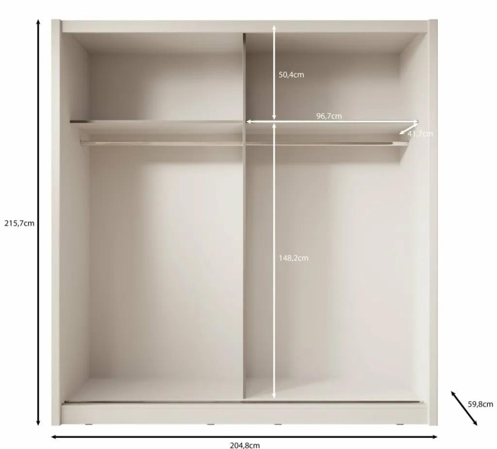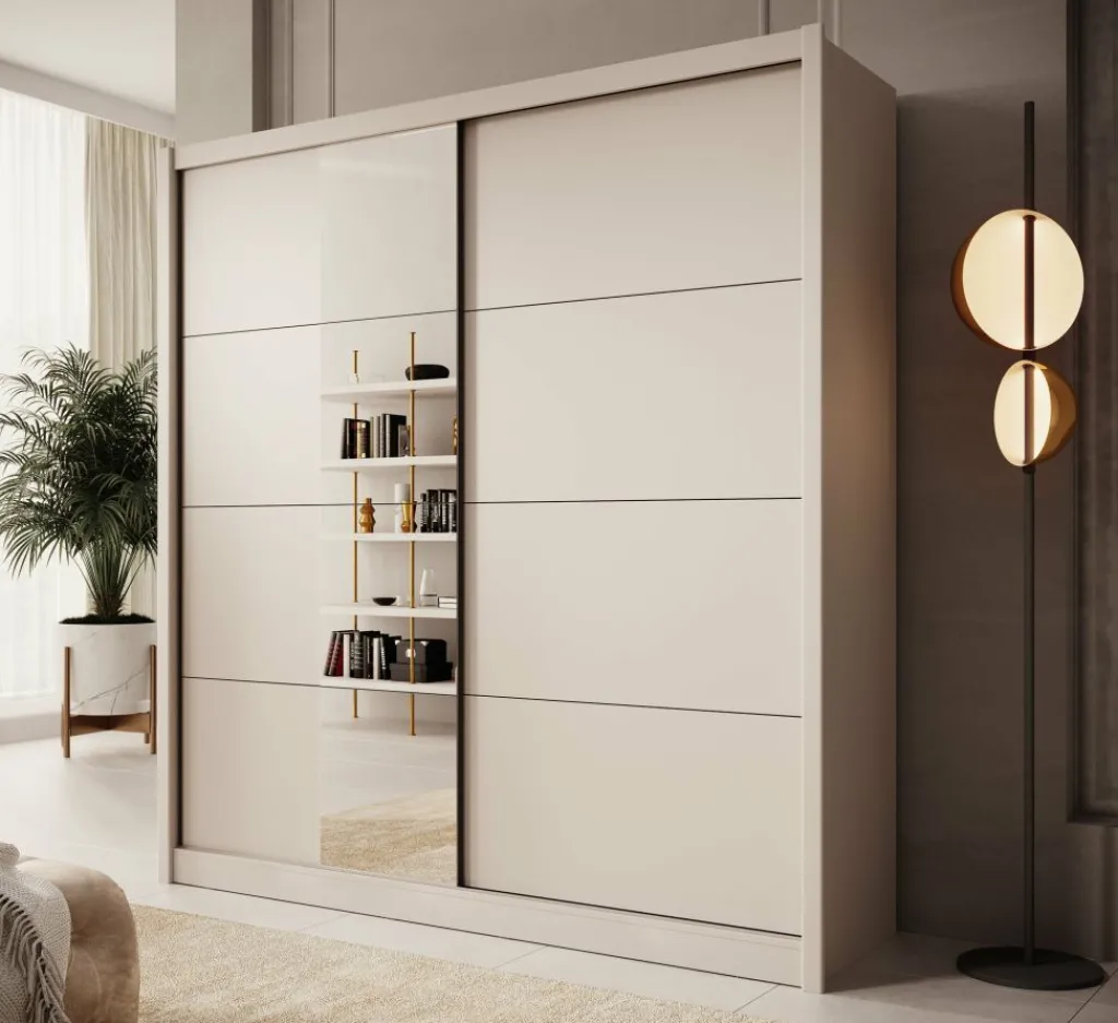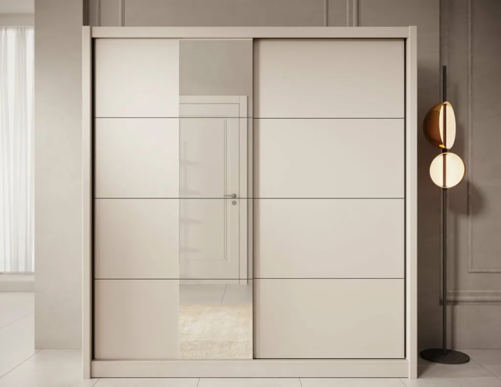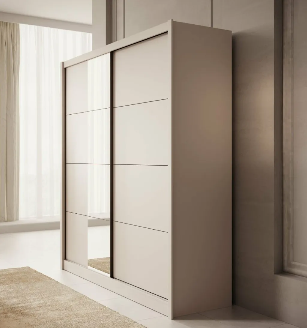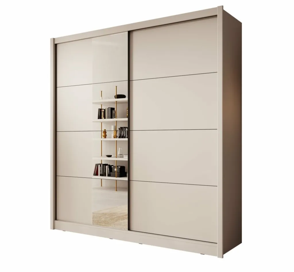 Kledingkast Azul is een garderobekast met ruime opbergmogelijkheden in een moderne stijl. Dit model beschikt over 2 schuifdeuren waarvan de linker deur voorzien is van een spiegel. De binnenkant van de kast bestaat uit 2 kledingroedes en 2 opbergvakken. De Azul is uitgevoerd in een beige kleur.