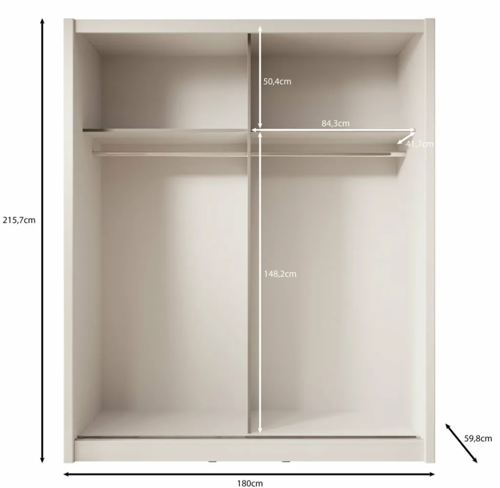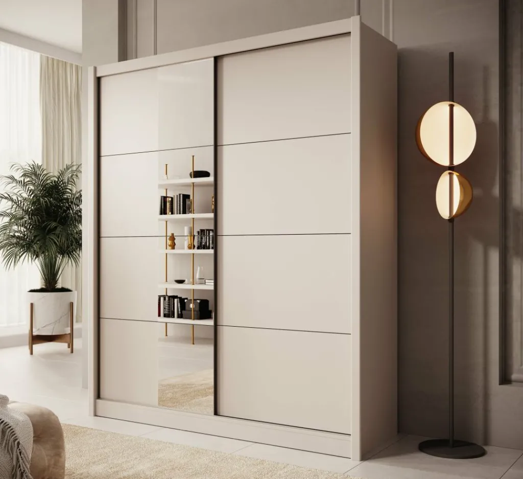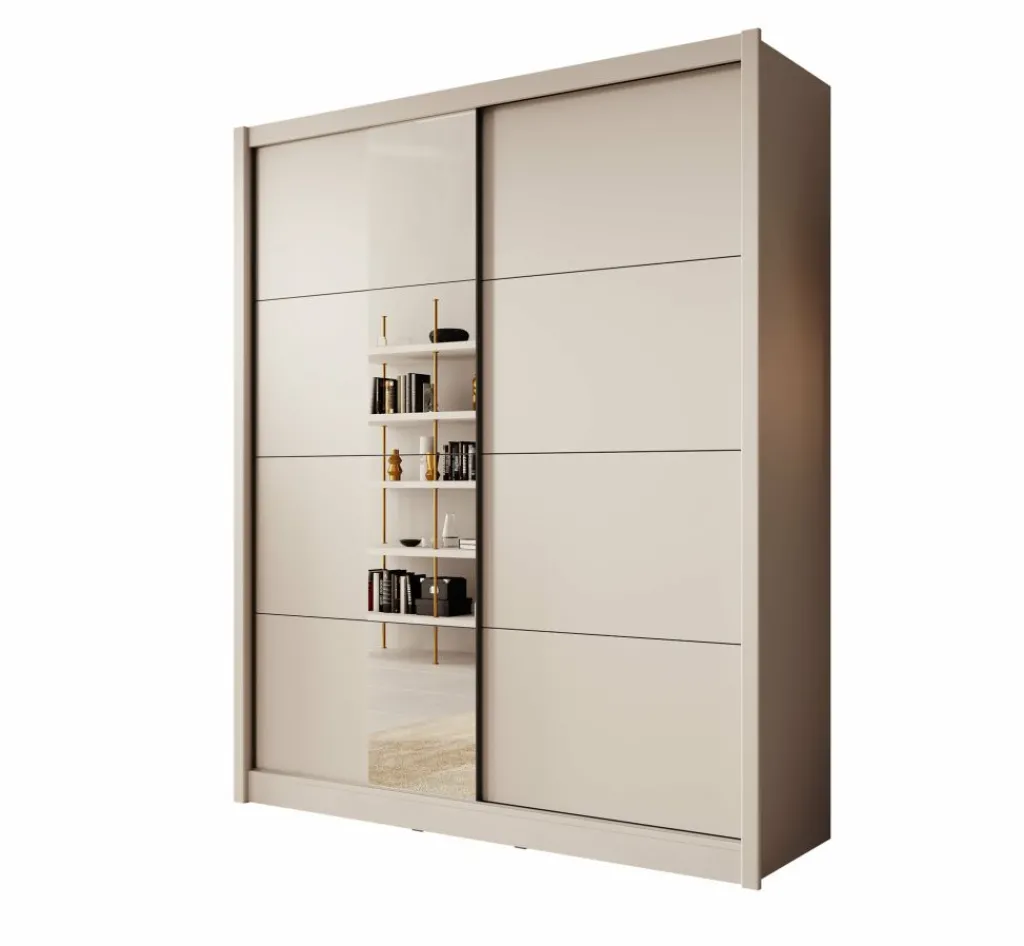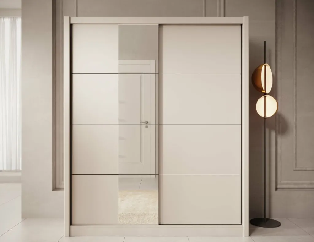 Kledingkast Azul is een garderobekast met ruime opbergmogelijkheden in een moderne stijl. Dit model beschikt over 2 schuifdeuren waarvan de linker deur voorzien is van een spiegel. De binnenkant van de kast bestaat uit 2 kledingroedes en 2 opbergvakken. De Azul is uitgevoerd in een beige kleur.