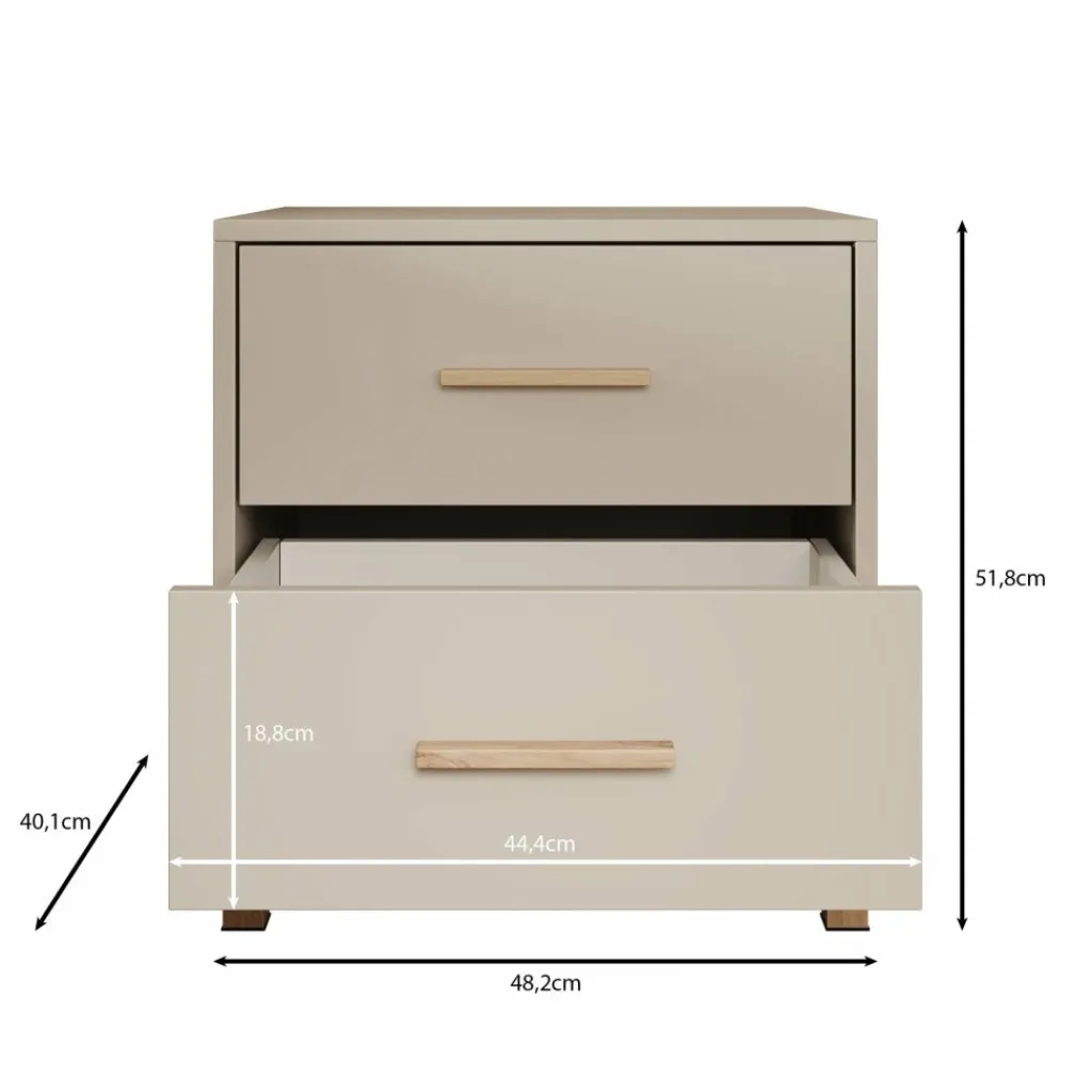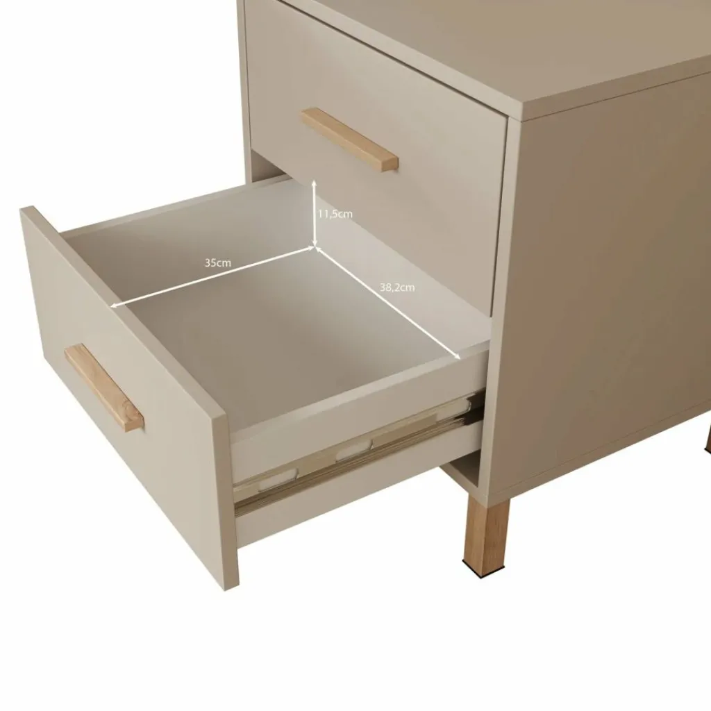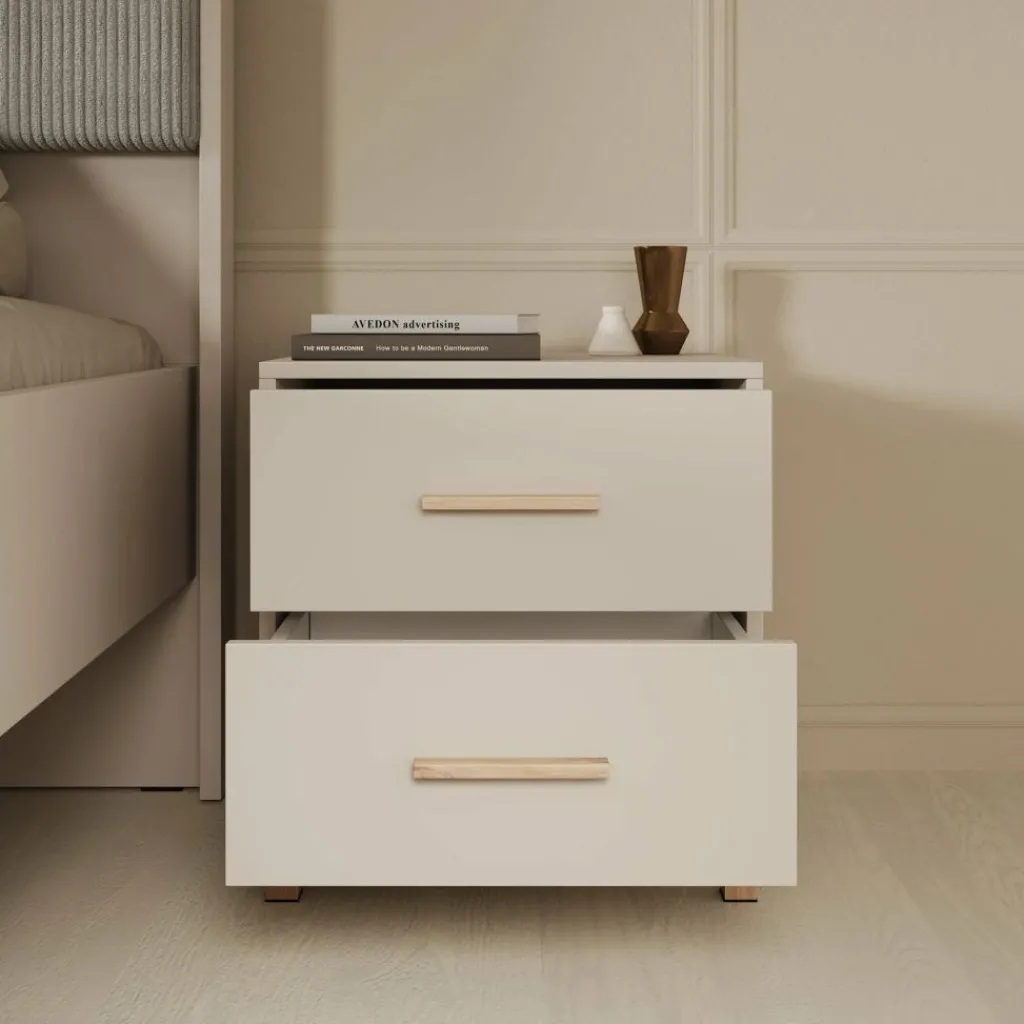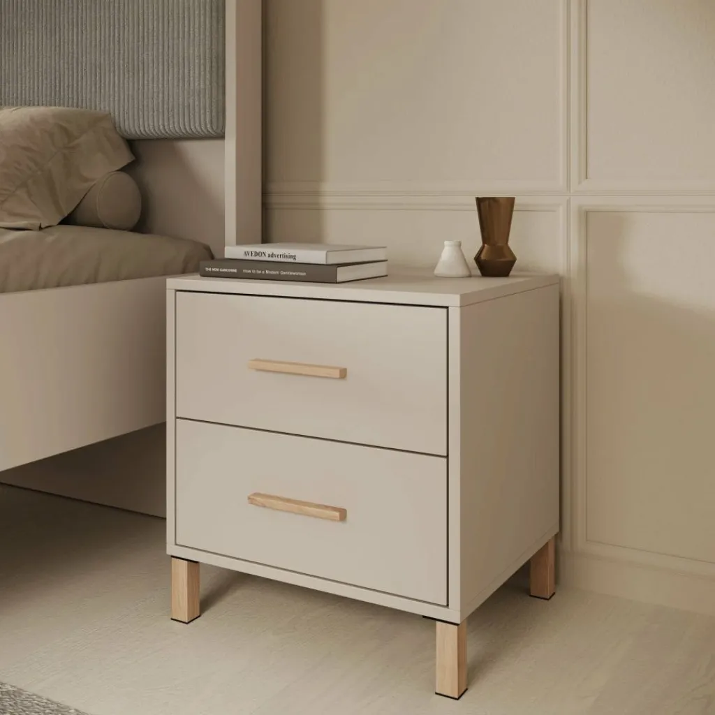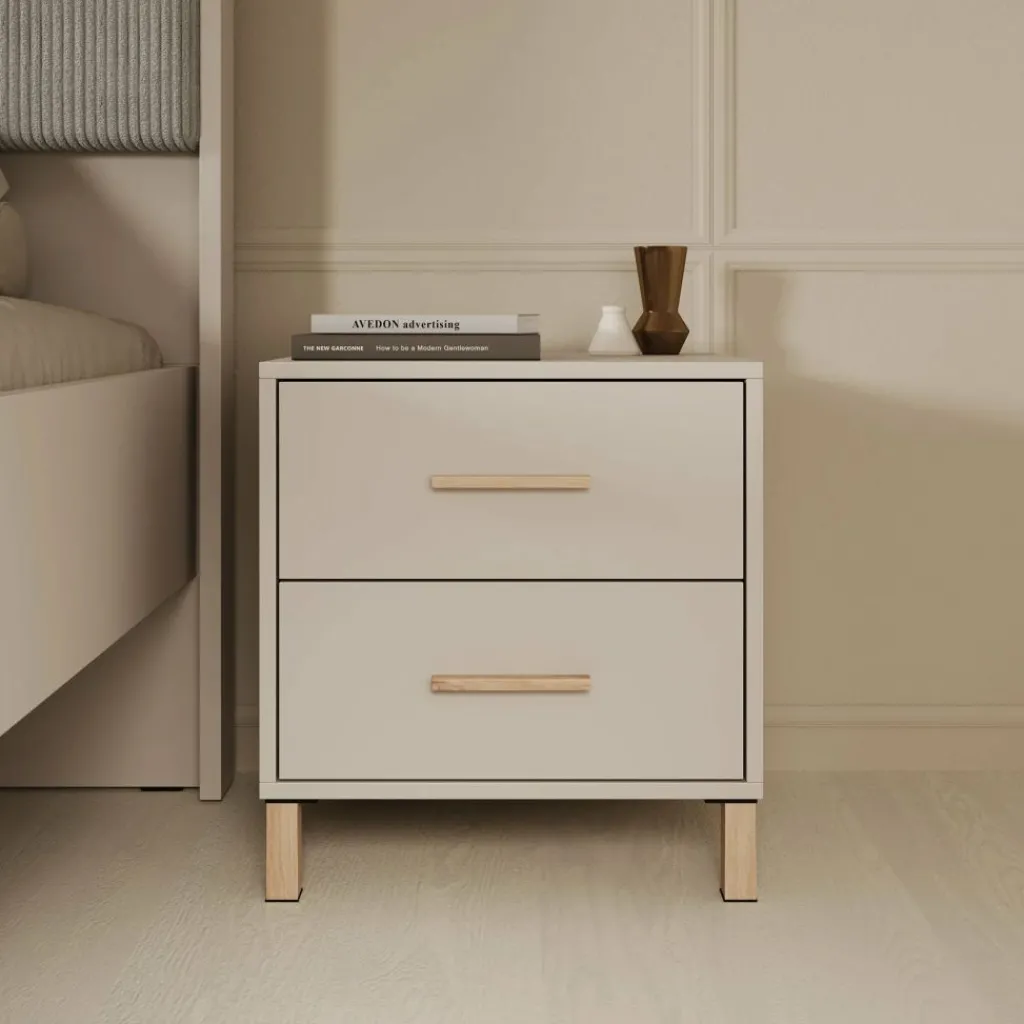 Het nachtkastje beschikt over twee lades die openen met een eikenkleurige handgreep. Hierdoor zijn persoonlijke spullen zoals boeken, accessoires of opladers netjes op te bergen en altijd binnen handbereik. De eikenkleurige poten geven het meubel een lichte en verzorgde uitstraling, terwijl het compacte formaat ideaal is voor gebruik naast het bed. Het nachtkastje is gemaakt van stevig, duurzaam spaanplaat.