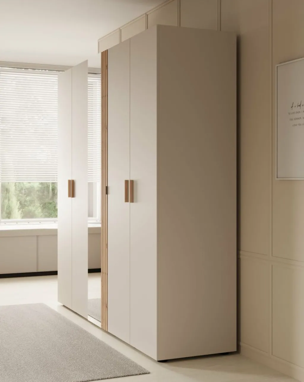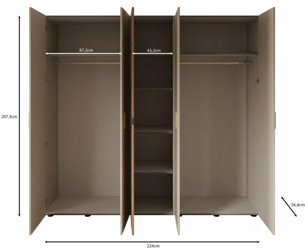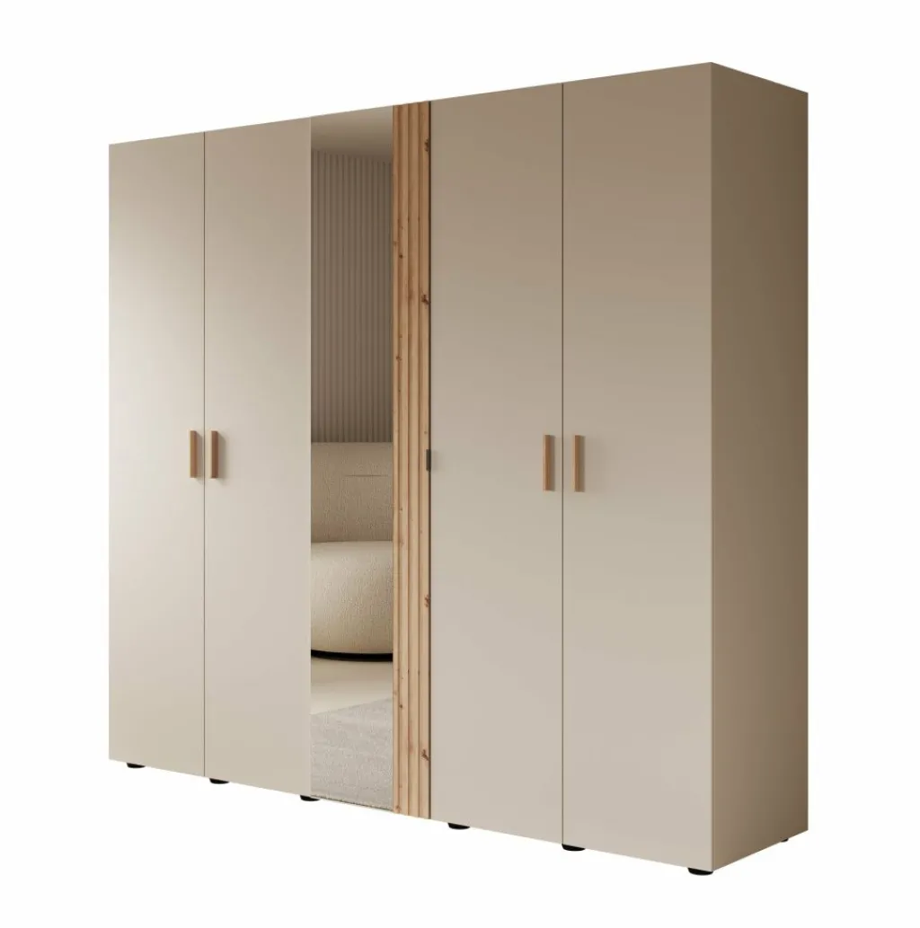 Kledingkast Bahia is een garderobekast met ruime opbergmogelijkheden in een moderne stijl. Dit model beschikt over 5 scharnierdeuren die te openen zijn met handgrepen. De middelste deur is voorzien van een spiegel. De binnenkant van de kast bestaat uit 2 kledingroedes en 7 opbergvakken. De Bahia is uitgevoerd in een beige met eiken kleur.