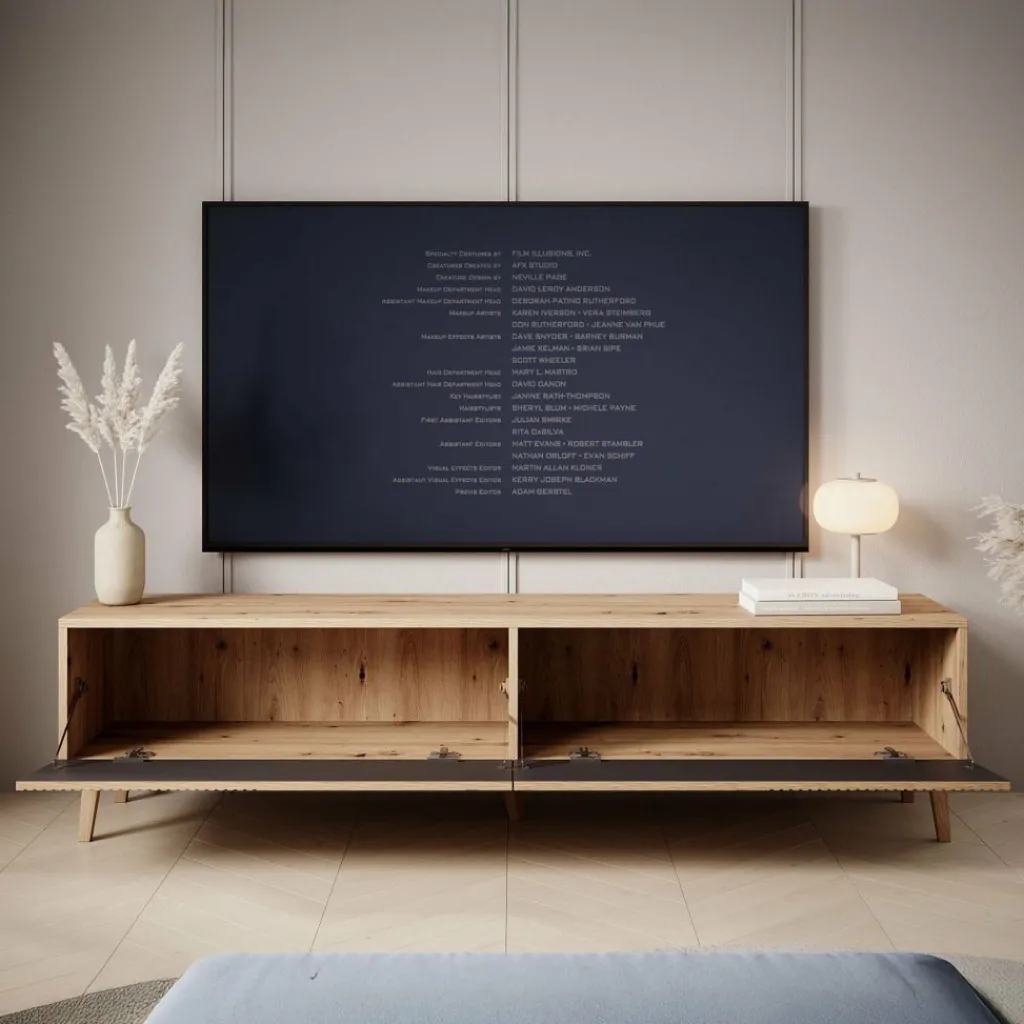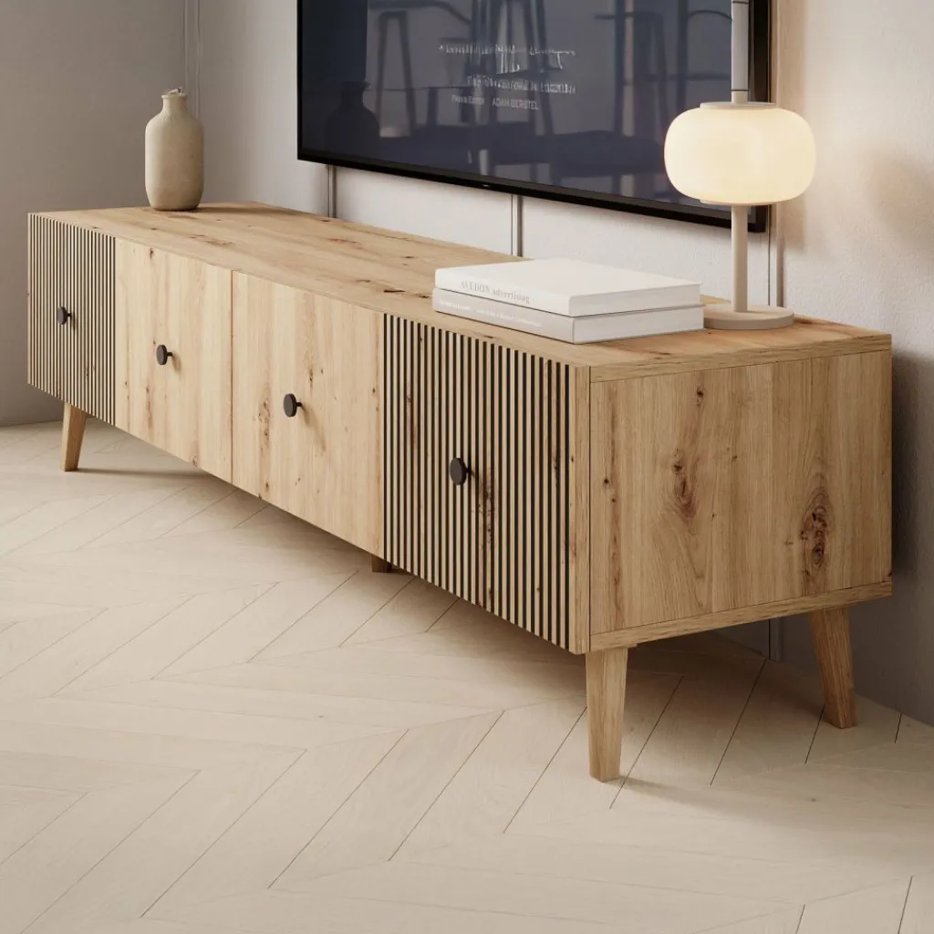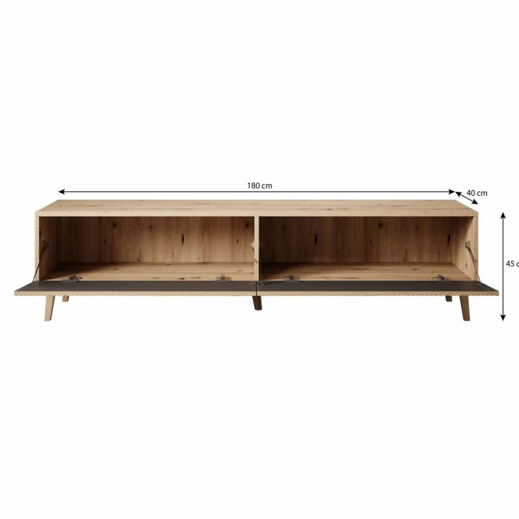 De Bali heeft 2 kleppen die openen met een zwarte handgreep. Daarachter bevindt zich een groot opbergvak. Op de voorkant van de klep zit een lattenpatroon. Het tv-meubel staat op hoge pootjes.