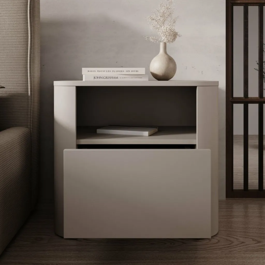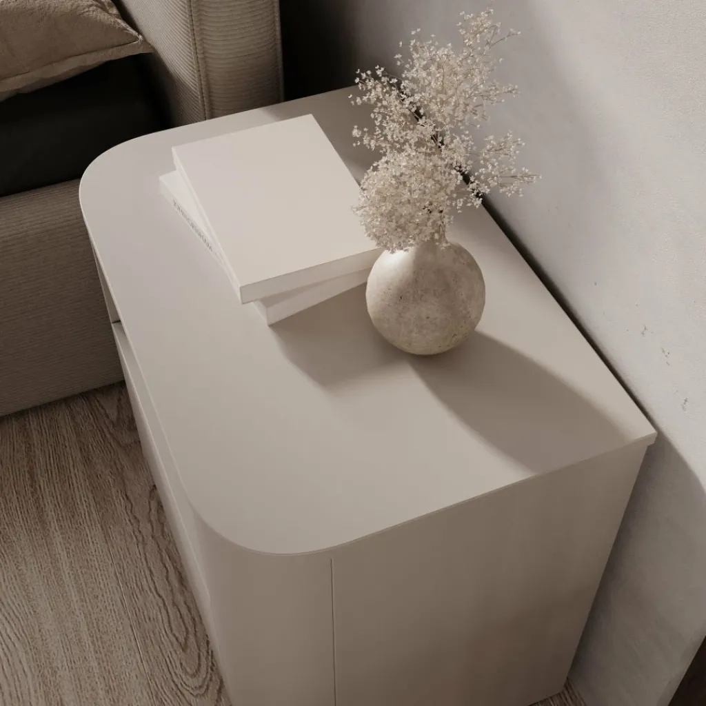 Nachtkastje Barbados is een stijlvol en praktisch meubel uitgevoerd in een beige kleur. Het moderne design met afgeronde hoeken geeft het kastje een zachte en elegante uitstraling die perfect past in iedere slaapkamer.