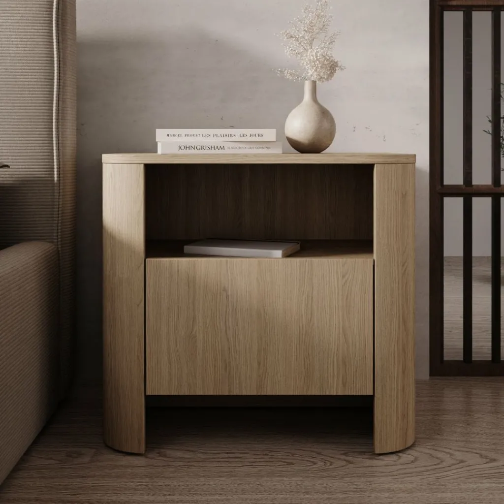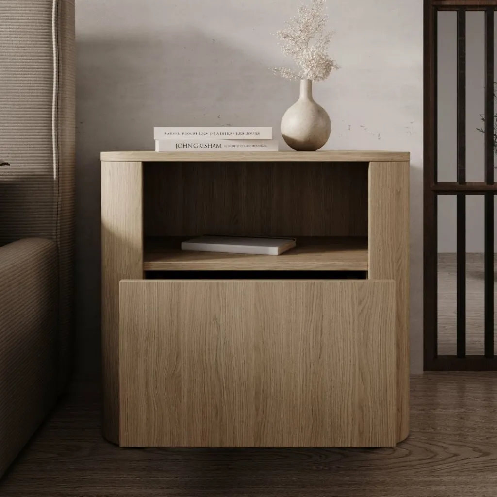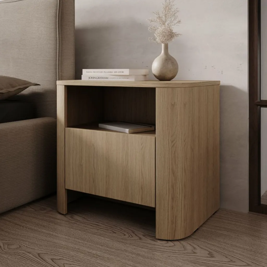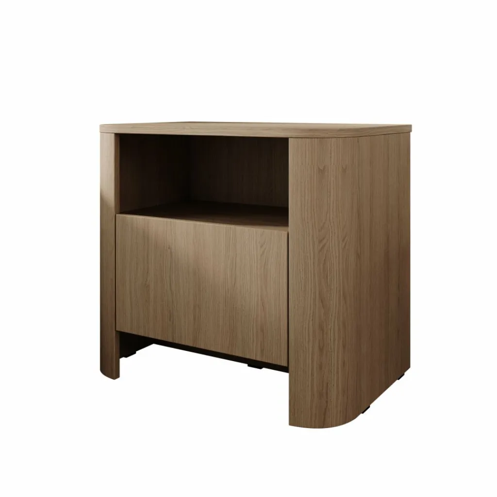 Nachtkastje Barbados is een praktisch en stijlvol meubel uitgevoerd in een warme eiken kleur. Het moderne design met afgeronde hoeken en strakke lijnen geeft het kastje een rustige en natuurlijke uitstraling.